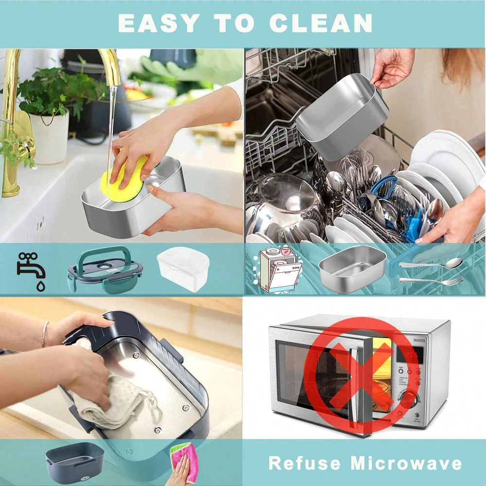 80W Electric Lunch Box Food Heater, Food Warmer For Car Truck Office, 1.5L Stainless Steel Self-Heated Lunchbox For Adult, Portable Heating Box With Adapters Fork Spoon Insulated Bag