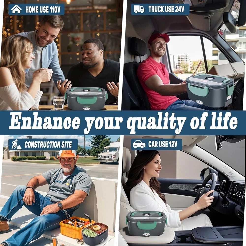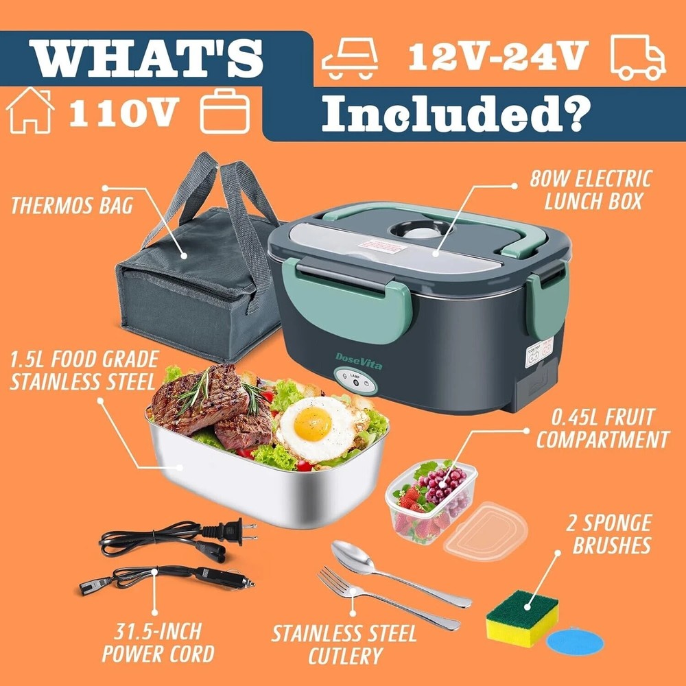 Large Capacity & Portable - Contains a 1.5L stainless steel liner and a 0.45L food-grade plastic compartment, suitable for matching different meals and achieving nutritional balance! Detachable design makes cleaning very easy! The top cover of the lonchera eléctrica portátil has an anti-scald handle and storage room for cutlery, it is very convenient to carry outdoors! (Note: Don’t immerse the body in water, Don’t add water to the heated base) Leak-proof Design - Electric lunch box cover has latches on all four sides, making the overall structure stronger. And the built-in rubber sealing ring plays an excellent leak-proof role. Even in a shaking car environment, there is no need to worry about food spills! The self-heating lunch box is specially designed for the office, car, truck, outdoor work, or people who work on the go. 3-in-1 Portable Food Warmer - It is equipped with 2 power adapters: a 110V home indoor adapter, a 12V/24V car, and a truck adapter. Plugin the power to heat up the food, it can be used at home/office/car/truck. Let you enjoy fresh and hot meals whether you are working outdoors or indoors! This also makes an ideal, heartwarming white elephant gift for family and friends! Enjoy Healthy Warm Food! - Made of premium food-grade material, it is the best heat lunch box container for packing healthy food. The outer shell has strong heat resistance, even if the internal temperature reaches 100 degrees, it will not be hot! 304 stainless steel for the inner tank has no odor and is durable, reusable, and easy to clean! Max 80W High-Power & Fast Heating - Electric lunchboxes for adults adopt a PTC heating system and power 80W, with constant temperature and low heat consumption cycle function, it can keep the food heated evenly and also lock the moisture of the food to keep your food fresh. It only takes 20-35 minutes to quickly heat up to the optimum temperature, and find a warm sense of belonging in the tired work!