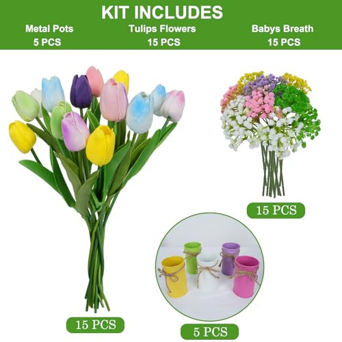 30 Days Return Policy Fast Delivery Trusted seller 15PCS Colorful Artificial Tulip with 5 Metal Pot Fake Tulips Potted Flowers in Vase for Table Decor Home Office Wedding Party Bouquet Arrangement Centerpieces Product Description Tulips Artificial Flowers in Vase: Includes 15 pcs multicolor artificial tulips flowers, 15 Pcs babys breath silk fake flowers, and 5 pcs galvanized metal pot vintage Size: Full height of the tulip: 13''; Each flower head diameter:1.5''; the babys breath is 6.3'', the galvanized metal pots is 4.33''in height, the width is 2.75''. The mini tulip artificial potted flowers look more real and suitable as a centerpiece Premium Materials: Artificial tulips and baby's breath flowers are made of soft Polyurethane (PU), stem is made of Plastic, with touch-like real feelings and flexibility. Metal pots are made of rustic galvanized tin, resistant to breakage and rust Spring Centerpieces for Tables: This fake flowers in pots can bring your space green and fresh, decorating your kitchen, living room, mason jar centerpiece for table, Easter table decor, wedding receptions, farmhouse, bring spring to your home Wide Use: The artificial tulips can compliment any space, perfect for Easter brunch centerpiece, spring floral arrangement, vase filler, spring table decor, wedding bouquets, office, party, hotel, cafes, celebration Shipping Returns Payment Shipping Shipping is FREE to all addresses other than APO/PO boxes in the lower 48 states. All our stock ships from US-based warehouses. Shipped via USPS or UPS (depending on location and package weight) Unless stated otherwise, all orders will ship within 24-72 hours of your payment being processed. Check our feedback to see the great reviews of FAST shipping we offer. Returns As our valued customer, we will do our best to make sure the product you receive arrives to you on time and as expected. If you are not satisfied with your purchase, please contact us within 30 days of receiving your order to process a return. Payment We currently accept payment via eBay managed payments only. Once payment is cleared, we will dispatch your shipment within 1-3 business days. Please refer to the "Shipping" tab for more information regarding shipping speed to your destination.