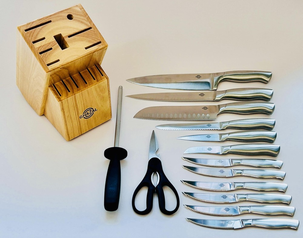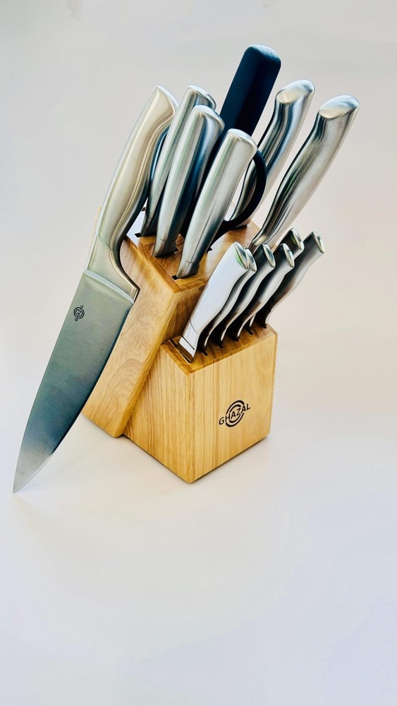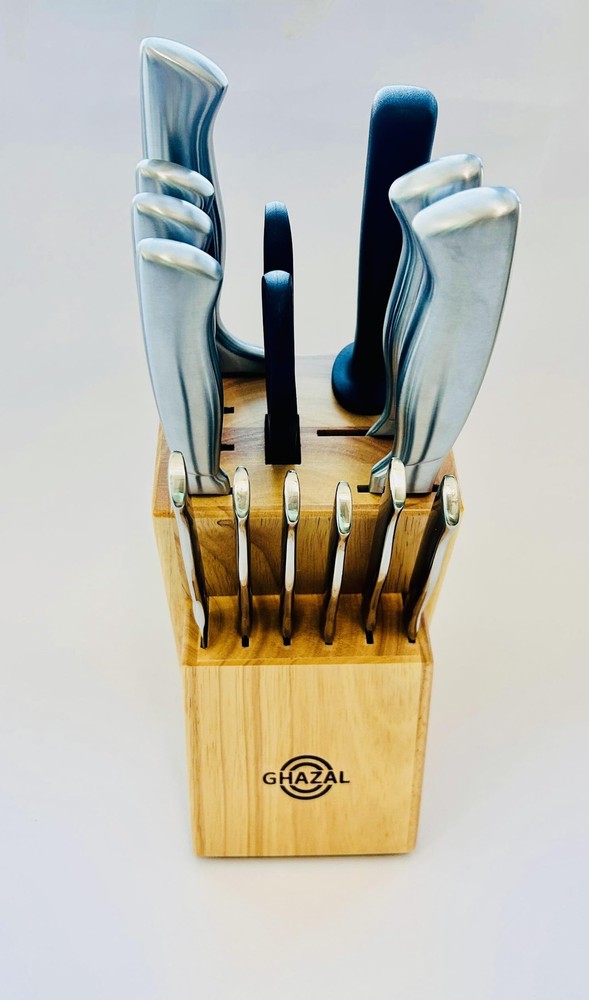 15pc Stainless Steel Kitchen Knife Set With Wooden Block - Silver High-quality stainless steel blades: Likely durable and corrosion-resistant Wooden block for storage: Provides safe and organized storage for the knives. Stylish design: Sleek silver blades and a natural wooden block for a modern look. Dishwasher-safe