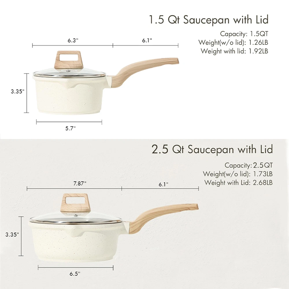 [Super Easy to Clean] - Our saucepan features a non-stick coating that allows for easy and quick cleaning. Simply wipe off residues and it is ready to use again. The rivetless design prevents food from getting stuck, making clean-up a breeze. [Even and Fast Heat Distribution] - Thanks to the enlarged stainless steel base, our saucepan ensures rapid and even heat distribution. Enjoy efficient cooking processes without wasting time and energy. Compatible with various stovetops. [5x Long-lasting Nonstick Performance] - Our saucepan, made from advanced 100% PFOA Free and non-toxic natural granite material, offers outstanding non-stick performance, ensuring easy cooking and effortless cleanup. [Perfect Addition for Everyday Cooking] - The wooden grip and white cream color add elegance to your home decor and is ergonomically designed for comfort. Introducing our innovative pouring spout design, making it easier than ever to pour oil or sauce with precision. Whether making oatmeal, soups, sauces, or gravies, this lightweight saucepan has got you covered. [Service & Guarantee] - At , we prioritize quality and customer satisfaction. Each piece of our cookware goes through rigorous inspection to ensure high quality. If you receive any defective items due to delivery, please reach out to us for a 100% refund or a new replacement product. Excellent service guaranteed.