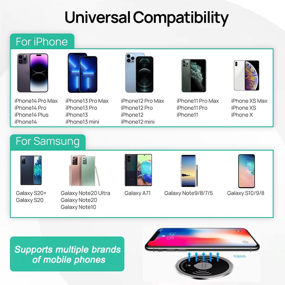 Attention: For a fast charging experience, please use a 9V-2A power adapter ( adapter not included ). Features: ▷ Built-in intelligent chip automatically matches the current required for device charging. ▷ Built-in thermistor for effective current control and low temperature charging. ▷ Built-in multiple protections for over-current, over-voltage, over-temperature and short-circuit to ensure safe and fast charging. ▷ Unique multi-functional intelligent protection technology provides temperature control, surge protection, and short circuit prevention. ▷ When charging is complete, it automatically cuts off power to protect your device's battery and extend its life. ▷ It is compatible with iPhone/Samsung-Galaxy/Huawei and any cell phone that supports wireless charging function. ▷ Conveniently mounted on the desktop of a conference table to avoid cable entanglement, while keeping the desktop tidy and saving space. ▷ Perfectly designed for mounting on the desk conference table counter, the wireless fast charger allows you to charge your cell phone at any time. Attention: The following phones have a built-in charging receiver for direct charging. Suitable for-Nokia 735/830/920/928/930/1520 Suitable for -HTC Droid DNA/8X Suitable for -Google Nexus4/Nexus5/Nexus6 Suitable for -LG G2/G3/G Pro Suitable for -Sony Z3V Suitable for-Samsung S6/S6 Edge Specification: Name: Embedded Desktop Wireless Charger Color: black and silver Size: 6.9 cm / 2.72 inches Cable length: 120 cm/47.24 inches Input power: USB DC 9V/2A ( if input 5V charger output is only 5W ) Wireless output: 15W/10W/7.5W/5W USB-A output: 5V / 2.4A USB-C output: 5V / 3A Standby power consumption: <10mA Frequency range: 110k-20KHz Transmitting distance: 6mm Place of Origin: China Product Certification: CE Package Includes: 1 *Wireless charger Notes: 1. Wireless charger only, other accessories demo in the picture are not included! 2. Please allow 0-1cm error due to manual measurement. Please make sure you don't mind before bidding! 3. Due to the difference between different monitors, the picture may not reflect the actual color of the item. Thank you! On Dec 13, 2024 at 01:25:12 PST, seller added the following information: