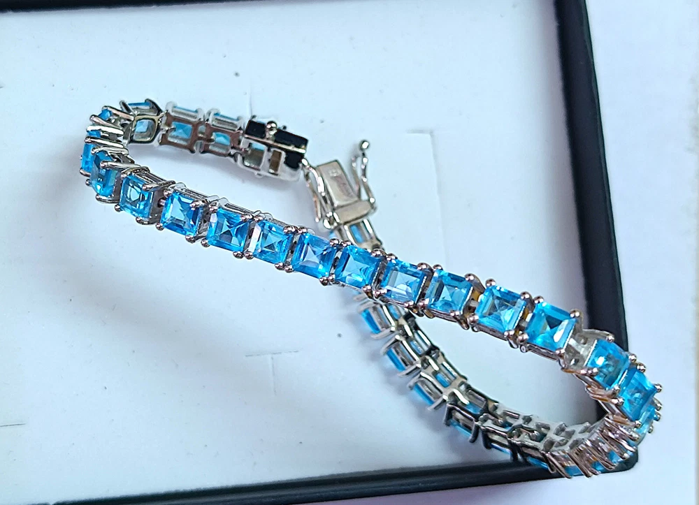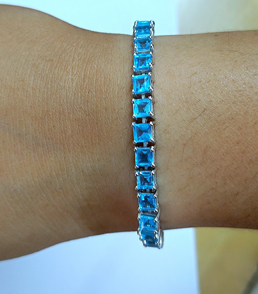 Square Natural Switch blue topaz. women's Tennis Bracelet in Sterling silver, November , birthstone Bracelet, Party wear Bracelet, Finance gift Bracelet, Gemstone Bracelet, Tennis Bracelet. ==================================== PRODUCT DETAILS Product Type - Bracelet Bracelet type - Tennis Bracelet Gemstone setting - Natural Switch blue topaz Natural Switch blue topaz shape - Square Natural Switch blue topaz . size - 4mm Natural Switch blue topaz color - Sky Blue Setting type - Prong ==================================== Benefits of Switch Blue Topaz stone: Wearing blue topaz can also boost self-assurance and courage, especially in speaking situations. As the stone of communication, it helps overcome public speaking phobias and fosters balance and self-control. It promotes healing of the soul, instills a sense of worthiness, and reduces self-doubt, reminding individuals that their voice deserves to be heard. Blue topaz is often associated with writers for its ability to strengthen willpower and focus, providing clarity and aiding in effective communication. It helps clear the mind, make better decisions, and improve communication abilities overall. This gemstone is known to calm the mind, heal the body, and soothe the soul, contributing to overall well-being. The potent energy of blue topaz is linked to the throat chakra. Wearing Blue Topaz Jewelry activates the throat chakra, removing blockages and allowing for clear expression of desires and goals. This activation helps set appropriate boundaries, provides strength, and reinforces the value of one's words. Unblock throat chakra can foster closer connections with loved ones and oneself, alleviating feelings of being unheard or unworthy. =========================== Shipping Policy :---- • Shipping Thru FedEx, DHL Express, USPS & Other Courier Services. • We ship item(s) from India to Worldwide . • We also use USP Which take 4-5 days for delivery with 100 % insured and online tracking . • We provide you each item with individually packed secured with quality products to help ensure safety and undamaged delivery =================================== Regards by RG jewels