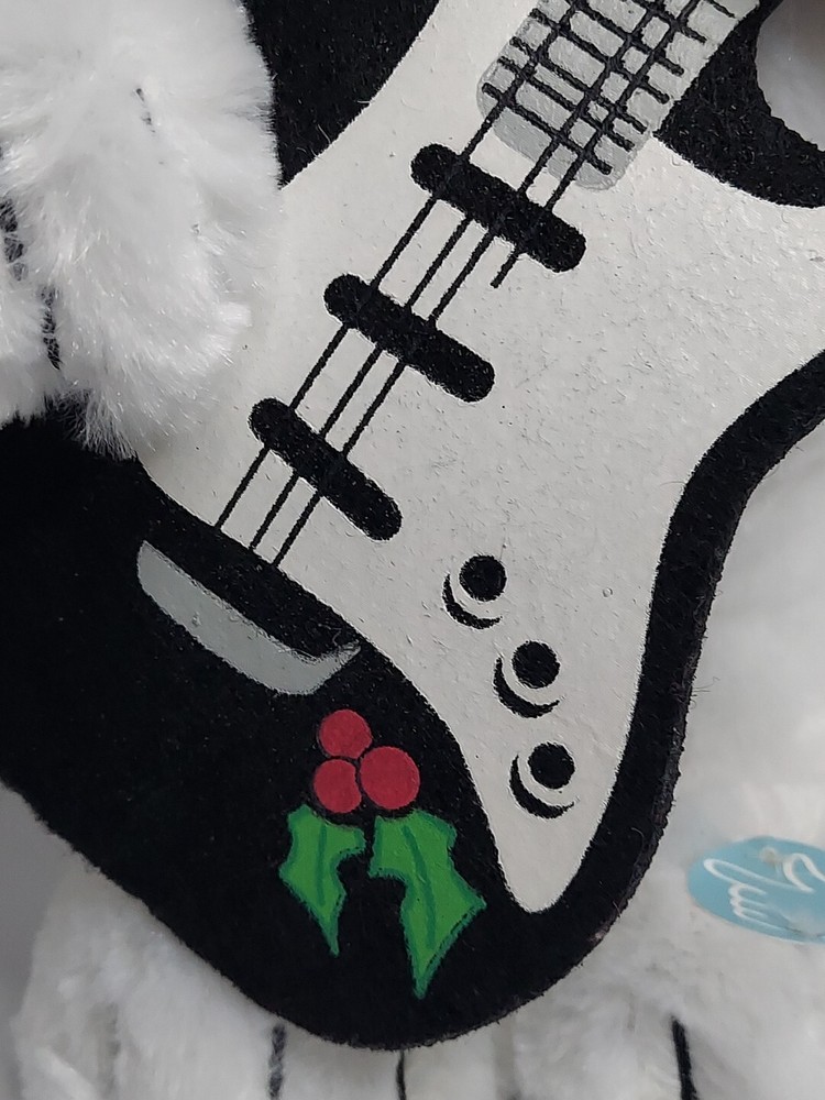 15 inch Snoopy is holding a black felt guitar, and he plays Linus and Lucy while dancing. He is wearing a blue Santa hat with white snowflakes. He is in good condition and works. Takes 3 AA batteries, not included.