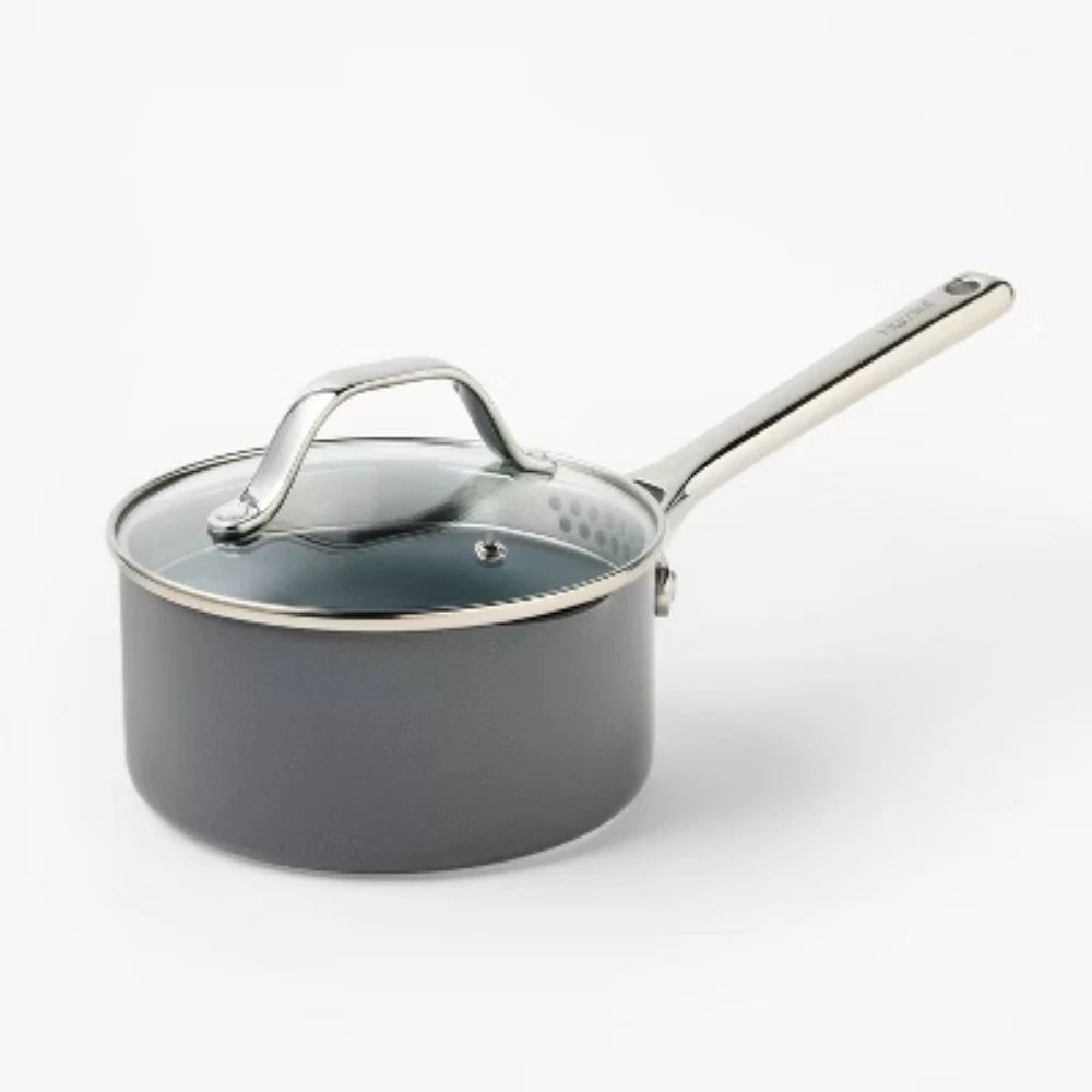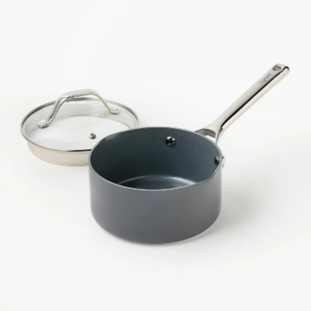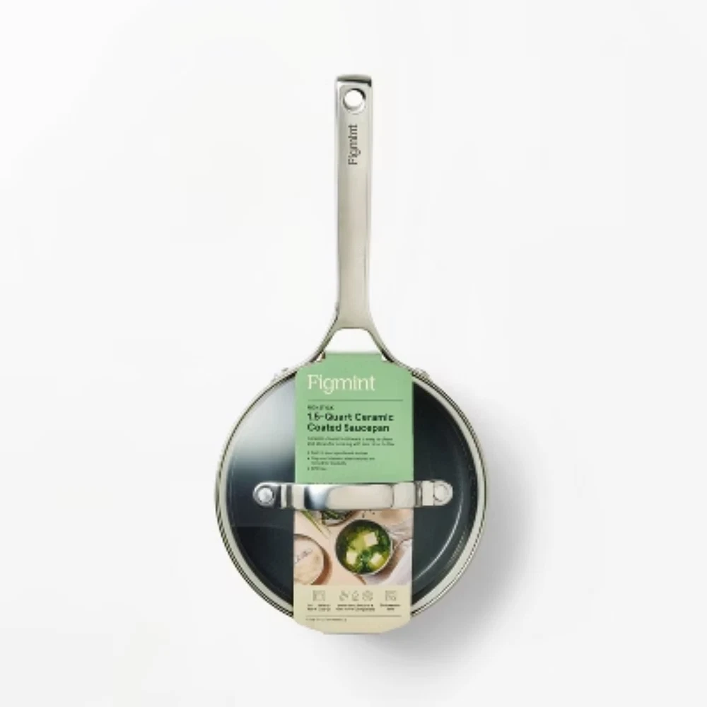 Description Whether you're boiling or simmering, the 1.5-Quart Nonstick Ceramic-Coated Aluminum Sauce Pan from Figmint™ is a kitchen must-have. Made without PTFE or PFOA, this handy saucepan features an aluminum construction for even heat distribution and a smooth, nonstick surface for cooking with little to no oil or butter. There’s a handy built-in strainer and pour spout, plus riveted stainless steel handles designed to be ergonomic and stay cool. Use it only with silicone, nylon or wood cooking utensils. Figmint™: Mixing up a taste of adventure everyday. highlights 1.5qt nonstick ceramic-coated aluminum saucepan Smooth, nonstick surface and riveted stainless steel handles Aluminum construction is ideal for even heat distribution Features built-in pour spout and strainer Includes pan protectors to help prevent scratching during storage Oven safe up to 450 degrees F Induction, gas and electric stove compatible Dishwasher safe but hand washing is recommended