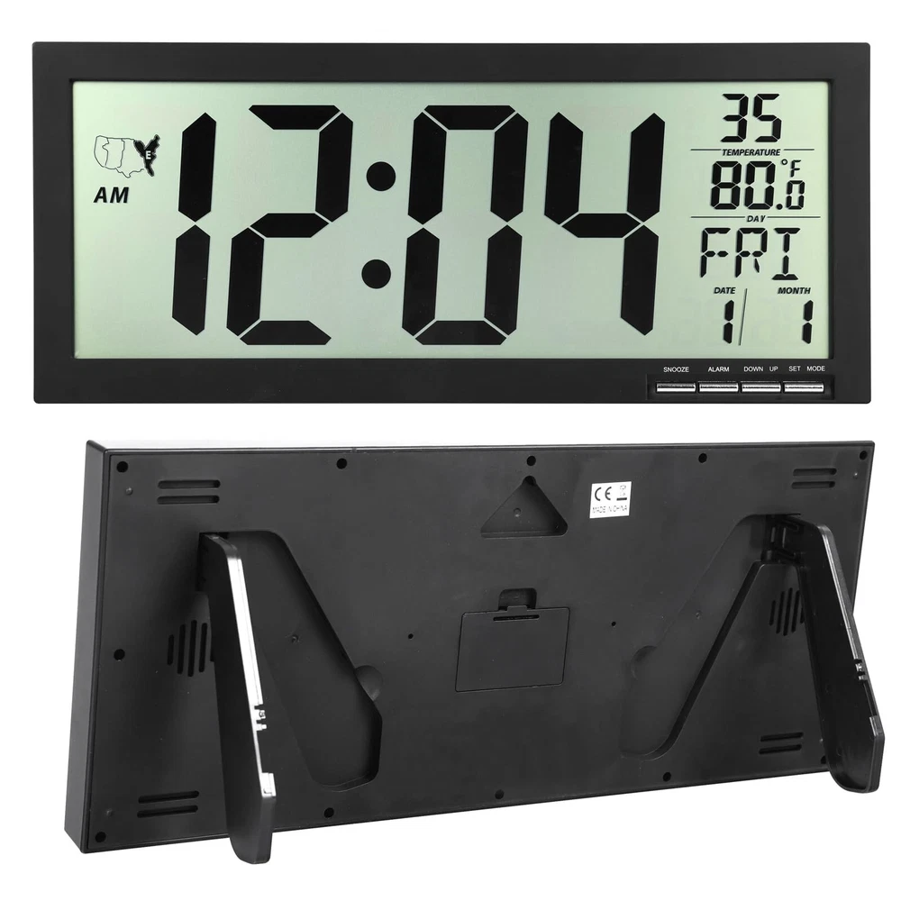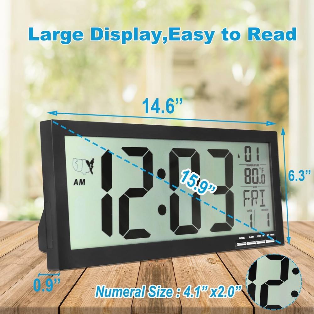 16" Atomic Clock Large Digital Wall Clock Battery Operated Large Display with Big Numbers,Temperature and Date - Easy to Read and Set,Auto DST Product Details Color: Black Brand: Crosstime MPN: Digital16Black UPC: Does not apply EAN: Does not apply Brand: Crosstime Color: Black Display Type: Digital Style: Modern Special Feature: Large Display, Temperature Display, Alarm, Daylight Saving, Radio Product Dimensions: 14.5"W x 6.3"H Power Source: Battery Powered Age Range (Description): Adult Room Type: Kitchen, Living Room, Bedroom, Classroom, Home Office Shape: Rectangular Brand: Crosstime Color: Black Display Type: Digital Style: Modern Special Feature: Large Display, Temperature Display, Alarm, Daylight Saving, Radio Product Dimensions: 14.5"W x 6.3"H Power Source: Battery Powered Age Range (Description): Adult Room Type: Kitchen, Living Room, Bedroom, Classroom, Home Office Shape: Rectangular Indoor/Outdoor Usage: Indoor Material: Acrylonitrile Butadiene Styrene (ABS) Theme: Atomic Clock, Radio Controlled Frame Material: Acrylonitrile Butadiene Styrene Are Batteries Included: No Mounting Type: Wall Mount & Tabletop Item Weight: 1.3 Pounds Alarm Clock: No Watch Movement: Digital Number of Items: 1 Operation Mode: Electrical Clock Form: Multi Display Manufacturer: Crosstime Item Weight: 1.3 pounds Country of Origin: China Item model number: Digital16Black Date First Available: August 30, 2024 High Precision Atomic Clock Atomic clock has a built-in receiver that automatically synchronizes itself with the WWVB 60kHz radio broadcast by the National Institute of Standards and Technology (NIST) in Fort Collins, Colorado. The Atomic Clock will always be accurate to within one second as it receives daily WWVB updates. Large Display / Easy to Read - Size:14.6" H x 6.3" L x 0.9" W,about 16" LCD, time numberal size: 4.1 X2". Easy viewing great for the elderly, people with poor eyesight. Easy to Use/Set After installing the battery it will automatically receive the radio signal WWVB (60k Hz), after receiving the signal then press the [UP] button to select 4 time zones and you are done. Note: In the process of receiving the radio, except for the [DOWN] key (forced to exit the reception) other buttons do not work temporarily, the reception process for a maximum of 7 minutes.(Powered by 3 x AAA batteries,Not included) Multifunctional 4 time zone to choose (PST, MST, CST, EST); auto daylight saving time (DST); temperature display,12/24 Hour time formats,clear second minute hour and week display,calendar display,dual alarm,snooze,wall mount / tabletop,folderable,etc. Great Gift Idea - It's suitable for living room,bedroom,kitchen,school,classroom,office,gym,library,hospital decor.You can gift it on various occasions such as Thanksgiving Day, Christmas, Halloween, birthdays,House warming etc.Also great gifts for mom,dad,family,elderly,friends.