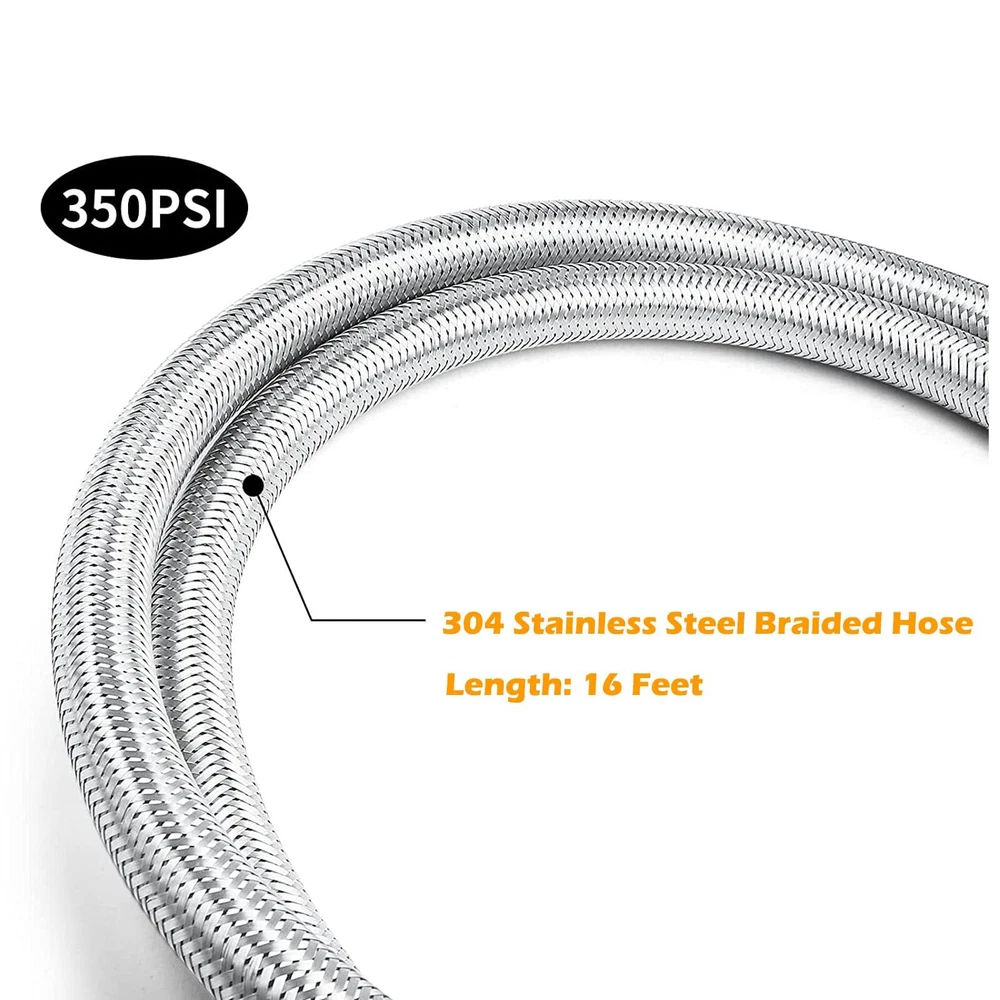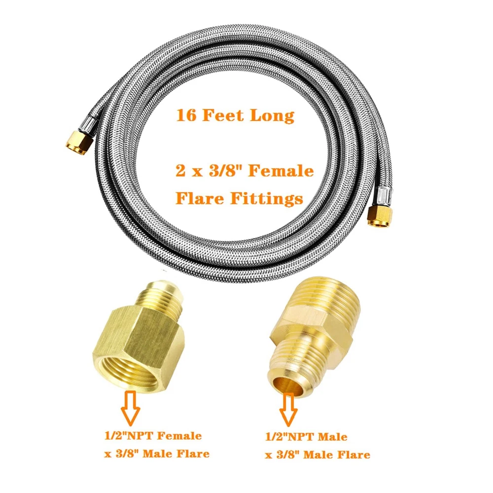 This Extension Hose with Stainless steel braided more durable and flexible for any RV grill, fire pit, heaters, torch extension using Specifications: 16Feet Long, Extension Stainless Steel Propane Hose 350PSI Rated More Durable with Coating Stainless Steel. Fittings: Both Ends with 3/8" Female Flare Connector (Thread standard is 5/8"-18UNF Female Swivel Fittings) Easy to Used for BBQ Grill, Fireplaces & Other Gas Appliance Extension Using and Propane Torch and Other High Pressure Gas Application. Not Suitable for Water. Kits Include: 1 of 16 FT Hose, 1 of 1/2" Npt Male to 3/8" Male Flare Fitting Adapter, 1x of Npt Female to 3/8" Male Flare Fitting Adapter, Burst Pressure of Hose: 37Mpa. And Leaking Test Passed.
