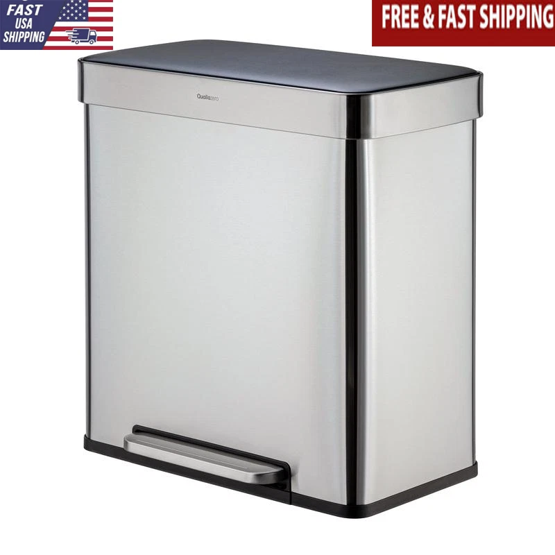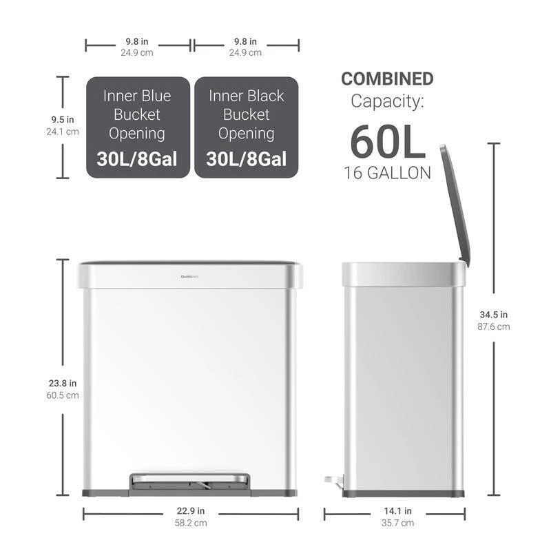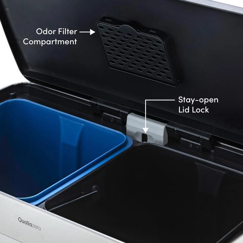 Product details Our Qualiazero 16 Gallon Dual Compartment Step On Trash & Recycling Can includes two removable, leak-proof inner buckets - black for trash and blue for recyclables! Our activated carbon filter deodorizer absorbs unpleasant odor and keeps your kitchen smelling fresh! Its large capacity is perfect for any size family and each compartment is compatible with any standard 10-gallon trash bag. Great for the kitchen or any high-traffic areas. The sturdy foot pedal controls the lid smoothly and keeps your hands free. Upon release of the foot pedal, the lid closes softly and silently without slamming shut. Crafted from commercial-grade stainless steel, our step can is built to withstand everyday consistent use and is smudge resistant - meaning it will stay clean longer! The two inner bins slide smoothly in and out of the trash can for easy trash and recyclable removal and convenient bag changes with no mess. For regular cleaning, use a damp microfiber cloth to effortlessly wipe clean! Ideal for kitchens. Dual Compartment Design: Includes two removable, leak-proof inner buckets—black for trash and blue for recyclables—for easy sorting. Activated Carbon Filter Deodorizer: Absorbs unpleasant odors to keep your kitchen smelling fresh. Large Capacity: Total of 16 gallons, perfect for any family size. Each compartment fits standard 10-gallon trash bags. Hands-Free Operation: Sturdy foot pedal allows smooth lid control, keeping your hands free and hygienic. Soft-Close Lid: Lid closes softly and silently without slamming after releasing the foot pedal. Durable Construction: Made from commercial-grade stainless steel to withstand daily use. Smudge-Resistant Finish: Resists fingerprints and smudges, keeping the can looking clean longer. Easy Maintenance: Inner bins slide in and out smoothly for effortless trash and recycling removal. Simple Cleaning: Easily wiped clean with a damp microfiber cloth. Versatile Placement: Ideal for kitchens and high-traffic areas. On Jan 14, 2025 at 01:09:23 PST, seller added the following information: