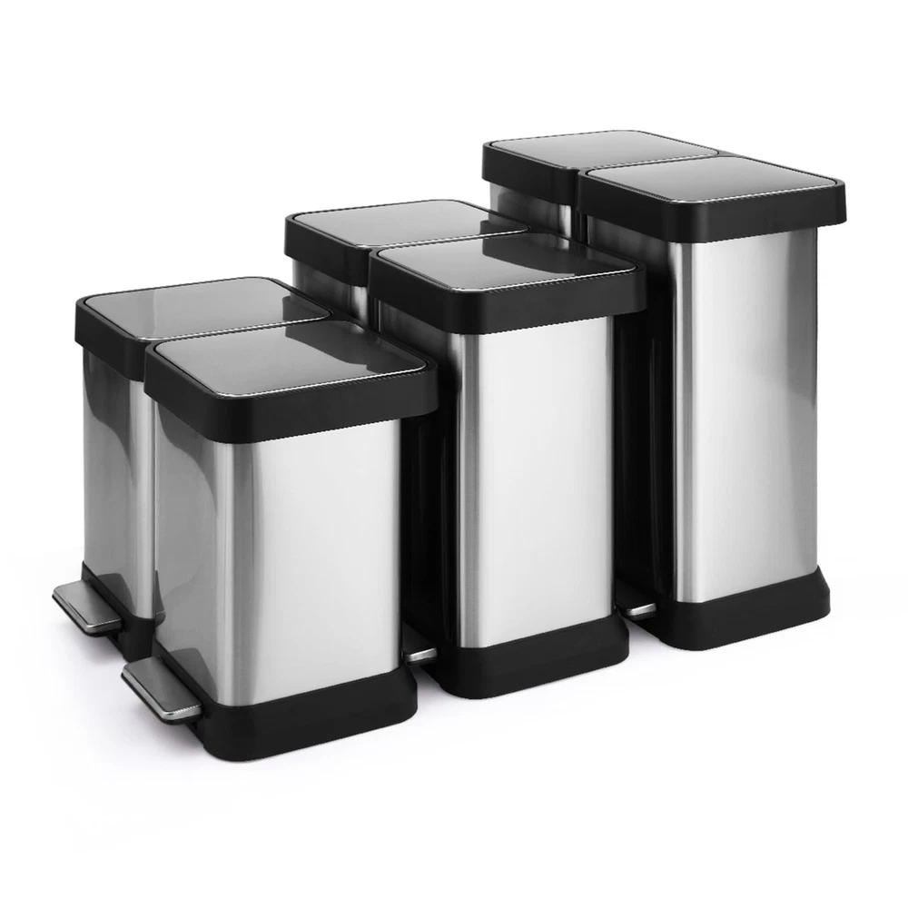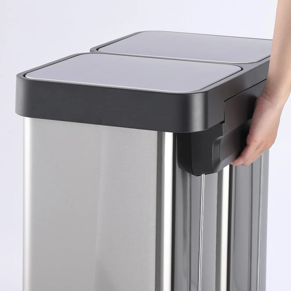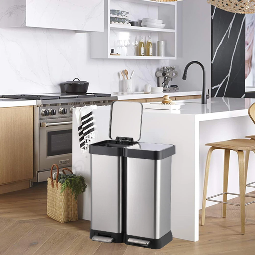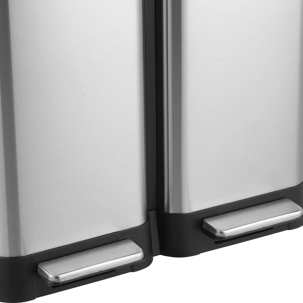 Step-Open Trash Can with Soft-Close Lid, Modern, Minimalistic for Home, Kitchen, Laundry Room, Office, Bedroom, Bathroom, with Inner Bucket Silent and Smooth Closure: The dual trash and recycling bins feature a soft-close lid mechanism that ensures quiet and gentle closure, creating a peaceful environment. The internal hinge design prevents lid slamming noise, minimizing disturbances and providing a pleasant user experience with its silent operation. The smooth closure adds a touch of convenience while maintaining a tranquil atmosphere in the kitchen or any space where the bins are used. Enhanced Kitchen Hygiene: Constructed from durable stainless steel, the recycling bin is resistant to fingerprints and dirt, making it easier to maintain a clean and hygienic kitchen environment. The bottom seals of the bins further prevent spills and leaks, contributing to a tidier and odor-free kitchen space. This improved hygiene helps create a healthier and more welcoming atmosphere in the kitchen, promoting cleanliness and sanitation. Hands-Free Operation Convenience: Each compartment of the garbage can features a sturdy steel pedal for convenient and hygienic hands-free operation. This hands-free operation is especially useful in the kitchen when hands are full or messy, allowing for easy waste disposal without the need to touch the bins. The hands-free design adds a level of convenience to daily waste management tasks, simplifying the process and promoting cleanliness. Efficient Space Utilization: Despite offering dual compartment functionality, the dual trash and recycling bins are designed with a space-saving layout that conserves space in small kitchens or homes with limited storage. The separate compartments for waste disposal and recycling maximize efficiency and convenience, providing a practical solution for households of all sizes. The compact design ensures that the bins can be easily integrated into various spaces without occupying excess room. Dual Compartment Recycling Convenience: The garbage can with a lid is thoughtfully designed with two separate compartments for easy waste sorting and recycling. This dual compartment feature simplifies waste management and encourages recycling practices in the home by providing a convenient way to separate and dispose of recyclable materials responsibly.