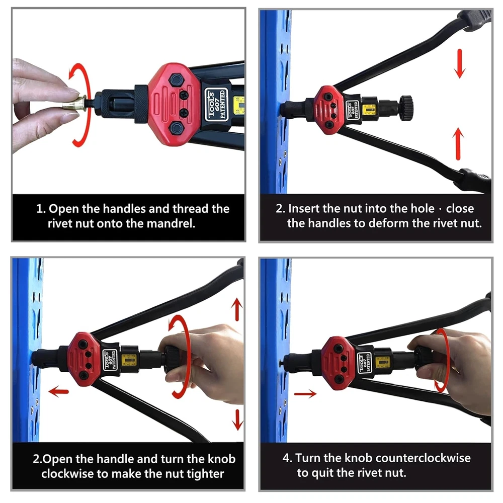 16" Hand Rivet Nut Setter Kit, Professional Long Handle Threaded Insert Tools VARIOUS USE- It provide professional solution for all kinds of riveting cases as car attachments, bicycle attachments,metal plate, riveting workpiece etc. INNOVATIVE MECHANISM - New "Toolless Quick-Change Head" design allows for easy changing of mandrels and nose pieces by hand. LABOR-SAVING AND DURABLE - Made of thick carbon steel, subjected to heat treatment and black phosphating treatment to prevent corrosion. The 16 inch handle can maximize the leverage effect, making it more effortless to use. COMPLETE ACCESSORIES - A rivnut tool, 11 interchangeable mandrels (metric M3 M4 M5 M6 M8 M10 M12; SAE 10-24, 1 / 4-20, 5 / 16-18, 3 / 8-16) and 55 rivet nuts (5 nuts per mandrel). Please note that the M8 mandrel is already installed in the rivet machine. 16.0 inches x 7.0 inches x 2.0 inches. Weight: 4.0 lb Fastener Type Rivet Product Dimensions 7 x 16 x 2 inches; 4 Pounds Material Steel Thread Size 1/4"-20 Metal Type Carbon Steel Exterior Finish Black