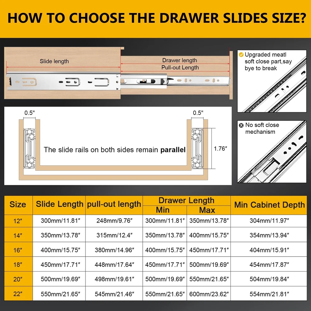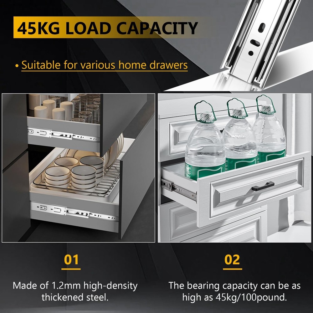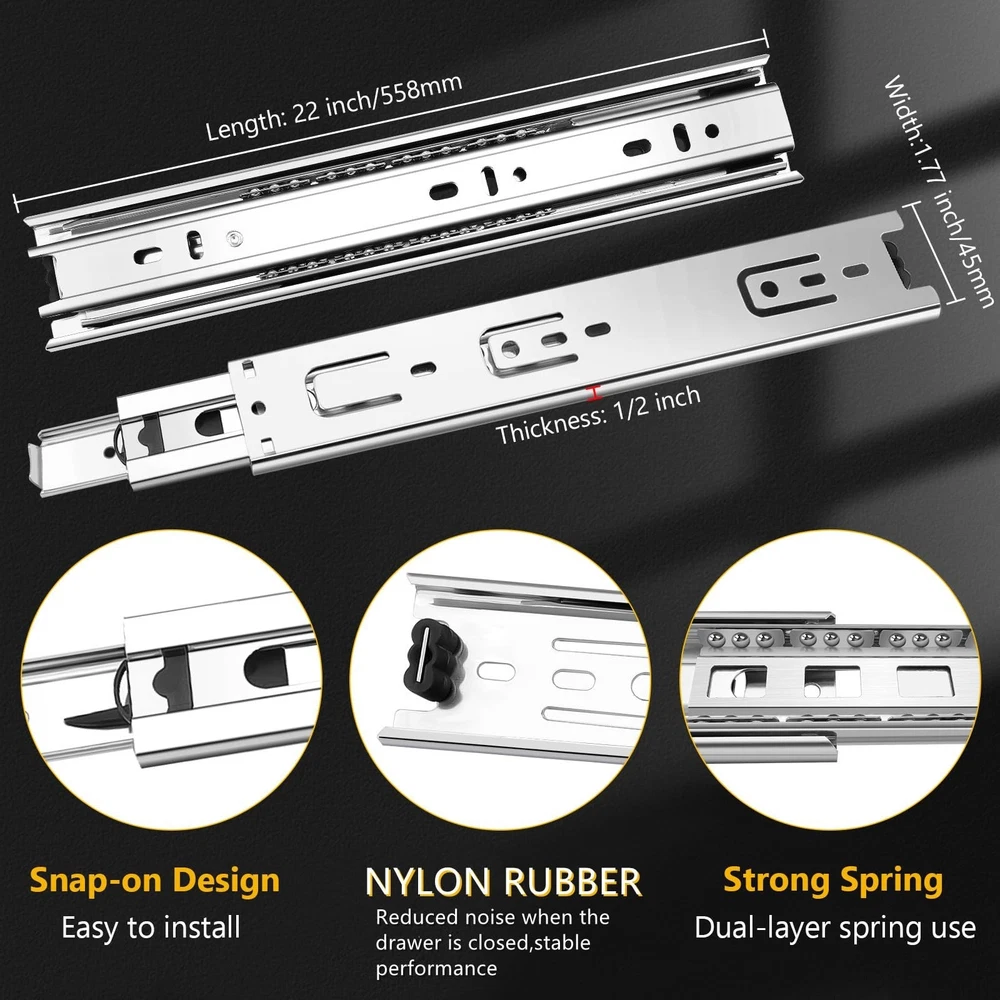 16 inch Ball Bearing Drawer Slides 6 Pairs (12pcs) - 100LB Capacity, Full Extension Side Mount Slides for Kitchen Cabinets, Wardrobes, Office Furniture (Silver 16inch) Product Details Color: Silver Size: 16inch-400mm Brand: SBUUBKI MPN: Drawer Slides UPC: Does not apply EAN: Does not apply Color: Silver Material: Alloy Steel Brand: SBUUBKI Product Dimensions: 16"L x 1.77"W x 0.47"Th Mounting Type: Side Mount Drawer Type: 3 fold full extension Manufacturer: SBUUBKI Number of Items: 12 Part Number: Drawer Slides Item Weight: 12.84 pounds Product Dimensions: 16 x 1.77 x 0.47 inches Country of Origin: China Item model number: Drawer Slides Size: 16inch-400mm Item Package Quantity: 6 Included Components: 6pairs-12pcs Drawer Slides, 12pcs screws Batteries Included?: No Batteries Required?: No Date First Available: September 5, 2024 [Drawer Slides]: With 6 pairs 12pieces included and each drawer slides match with 12pcs screws, this offers ample supply for multiple drawer installations or replacements. [Guide for Choosing Size of Drawer Slides]:Side installation.To determine which size of slides are good for your drawer, please measure the length of the drawer without the frame board. And if the length is not even, please choose 1 inch shorter. The length of slides can't be longer than the cabinet case depth. Face frame cabinets will require a rear mounting bracket, whereas for faceless cabinets the slides are mounted directly on the side. Ball Bearing Mechanism: Two sets of solid steel balls are used inside the ball bearing drawer slide rail to ensure smooth and quiet performance that offer less noise at closing the slide operate smooth and silent No more slamming drawer Full Extension: 3-Fold full extension Detachable Drawer Slides Designed for maximum accessibility, these slides allow drawers to be pulled out completely, providing unobstructed access to contents. [High-Grade Material]:All of the drawer slides which made by made from high-grade cold rolled steel, and the material is one times the thickness of ordinary slides. The surface of the drawer slide rail adopts electrophoresis process, which isolates the direct contact between water and air, prevents the slide rail from oxidizing and rusting, and improves corrosion resistance. [Application range]: SBUUBKI drawer slides are available in 10inch, 12inch,14inch,16inch,18inch,20inch,22inch.Various choices for drawers in your kitchen,bathroom,bedroom,office with different depth.It also can apply to ,keyboard drawers,wardrobe drawers,wooden or steel drawer,cabinet drawers,toolbox drawers that with demand for big load-bearing capacity.