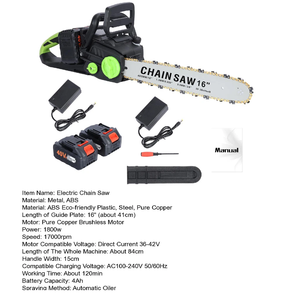Other | | | | | | 16 Inch Cordless Chainsaw, Brushless Motor Electric Chainsaw & 2 x 4Ah Batteries > > > > > > < < < < < < < < < < < > > > > > > > > > > > Description: Brushless Motor & High Power: Since the electric chainsaw is designed with a powerful brushless motor, it provides your tool with longer run-time, more torque, and more power. Once release the switch, it can stop automatically. The 16 inch chain saw has a chain speed of 17000rpm. 1800W power for super-effective performance with flexible operation and strong cutting ability. Safe Switch & Front Baffle: With safe switch design, you can press the safety start switch lock first, and then hold still and press the start button to prevent injury by sudden start. The front baffle protects the user from flying debris. High Quality Material & Easy to Use: Electric cordless chainsaw is made of high-quality ABS eco-friendly plastic, steel and pure copper brushless motor material. Comes with complete installation tool, this electric chainsaw is very easy to use. Push button start, no gas or fumes, no carburetor, no spark plug, and no starter rope. Multi Advantages: Unlike the market to use a screwdriver to adjust the chain, this electric chain saw is equipped with a knob to be adjusted slightly before the looseness and length of chain, which to prevent the chain to fall off. Automatic oiler system, the lubricant volume to ensure sufficient and uniform work. Equipped with oil pouring port, you can control the oil spraying speed. The integrated guide plate is designed to resist high temperature and wear. The electric chainsaw has a brushless motor for durability, high efficiency and quiet operation. Wide Applications: Featuring an anti-slip handle and switch control design, it is comfortable to grip and easy to control. The electric chainsaw for smooth and fast cutting through dry wood and live logs. Suitable for forest cutting, family logging, professional use by workers. Item Name: Electric Chain Saw Material: Metal, ABS Material: ABS Eco-friendly Plastic, Steel, Pure Copper Length of Guide Plate: 16" (about 41cm) Motor: Pure Copper Brushless Motor Power: 1800w Speed: 17000rpm Motor Compatible Voltage: Direct Current 36-42V Length of The Whole Machine: About 84cm Handle Width: 15cm Compatible Charging Voltage: AC100-240V 50/60Hz Working Time: About 120min Battery Capacity: 4Ah Spraying Method: Automatic Oiler Control Type: Two-Hand Control Plug Specifications: UK Plug, US Plug, EU Plug Features: Comfortable Grip, Long Endurance, Integrated Guide Plate Size Details: L: 85cm/33.46", W: 35cm/13.78", H: 35cm/13.78" (Approx.) Notes: Due to the light and screen setting difference, the item's color may be slightly different from the pictures. Please allow slight dimension difference due to different manual measurement. Package Includes: 1 x Electric Chain Saw 2 x Batteries 2 x Charger 1 x Chain 1 x Guide Plate 1 x Screwdriver 1 x User Manual Payment Shipping Return Contact Us 1. We acceptPayPal,Credit card,Debit card,Apple Pay,Google Pay ect as payment. 2. Please be sure your shipping address is correct before make a payment. 1. We ship to your eBay or Paypal address. Please make sure your eBay and Paypal address is correct before you pay. 2. Items will be shipped within 1-7 business days when we received payment. 3. Delivery time depends on destination and other factors. 4. International buyers please note: a. Import duties, taxes and charges are not included in the item price or shipping charges. These charges are buyer's responsibility. We will try our best to reduce the risk of the custom duties. b. Please check with your country's customs office to determine what these additional costs will be prior to buying. 30 DAY RETURN POLICY Customer Satisfaction is our main goal, all items are quality checked prior to being listed and sent out. Please contact us prior to leaving any Negative Feedback and allow us to make things right! If you not satisfied with it please include the original packaging and return form & tracking number otherwise the return may take longer to process the refund. Once we have received the item and inspected it we will issue the refund or resend within 1-7 business days. Please contact us in time if any enquriy under any circumstances. We greatly appreciate your positive feedback and we'll do the same to you. We care about our valued customers, and will always try our best to help you, if you have any problems. Working time: GMT+8 / 9:00-18:30 in normal we will reply you in one working day.