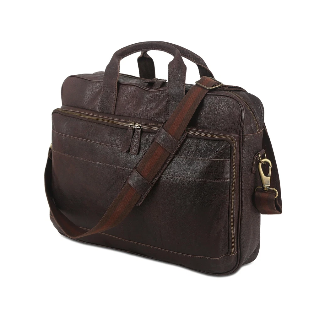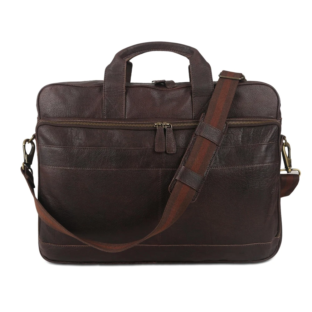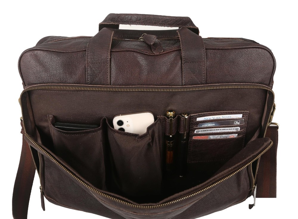 16 Inch Leather briefcases Laptop Messenger Bags for Men and Best Office Satchel Bag PREMIUM BUFFALO LEATHER AND YKK METAL ZIPPERS: Unlike Other brands which use Faux or PU leather, bags are made from Premium Top Grain Water Buffalo Leather and are made by Experienced Craftsmen. All Metal Zippers used on this bag are YKK brand which is of the most reputed in the world. 1-YEAR : A Perfect Gift for any occasion like birthdays, Christmas, Father's Day or Valentine's. This bag comes with a -year hassle-against any manufacturing defects. TROLLEY : Our bag comes with a trolley-strap so you can relax and strap it to your suitcase while at the airport or travelling. MULTIPLE SECTIONS: With Multiple Internal sections for Cell Phones, a Calculator, Slots for cards, pens and Zipper compartments including internal and back zipper, you can organise your stuff as you like. SLEEK MULTIPURPOSE DESIGN: With a size of 16-inch width, 12-inch height and 3-inch depth. This bag fits your laptop and other without looking too Bulky on the go. The bag can used as a briefcase, Laptop messenger bag or office satchel.