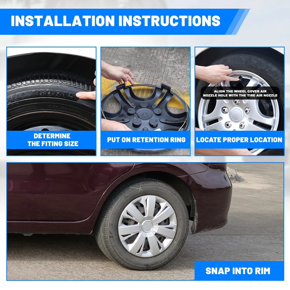 100% Brand new in box. Unused, unopened, undamaged item in its original packaging Rust proof and corrosion resistant ABS Plastic Easy push on installation with no need for tools Stainless Steel retention ring for durability and maximum grip Designed with a tire steam cut out on the hubcap and retention ring Premium designs and triple coat color paint hubcaps Come in a complete set of 4 caps and 4 retention rings 16 Inch Silver 4 Wheel Covers On Full Snap Hubcaps Caps For R16 Tire & Steel Rim This set of 4 wheel covers is perfectly designed to fit your 16 inch Tire Size Car Truck Pickup ...and easily installs over your existing factory steel wheels in minutes! These wheel covers are constructed from durable, automotive grade plastic and feature an attractive silver finish for a custom look. ---Before Purchase: Please make sure to check your tire/wheel size before purchase! To confirm wheel size, please refer to the last two digits after the "R" of the tire. Designed for steel wheels, not for alloy wheels.Not suitable for wheels with middle protrusions higher than the rim. Not suitable for iron rims with long lug nuts. ---Easy Installation: Align the grooves of the adjustable steel retaining ring with the grooves of the hubcap and align the hubcap with the tire valve before snapping it onto the wheel. ---Stylish Appearance: The rim covers are very stylish and modernized with a silver finish, easily transforming the appearance of your wheels and enhancing the overall aesthetics of your car. ---Protect Your Wheels: universal hubcap can protect the tire screws and make it waterproof and rustproof. The silver hubcaps are easy to clean and maintain, can be quickly wiped with a damp cloth to remove any dirt. ---Quality Service: The wheel cover kit is compatible with most steel wheels. NOTE: Our wheel hubcaps are not suitable for wheels fitted with dynamic balancing blocks. If you have any other questions, please contact us. Not fit for: 2004-08 MITSUBISHI GALANT Steel Wheel 2009-12 MITSUBISHI GALANT Steel Wheel Applicable to all 16inch Tire models----Car Truck Pickup...... - 7 Spoke Style - Front and Rear - Size:16 Inch - Material:High Quality Hard and Durable ABS Plastic - Fitment is for factory 16' steel wheels only Payment Delivery details Terms of sales About us Contact us Payment π We accept PayPal (Recommended), credit card, VISA, Google Pay & Discover etc. π Please submit your payment within 7 days after your purchase. π If not, eBay will automatically open an Unpaid Item Dispute on our behalf if the item(s) are not paid within 7 days. Delivery details π Please double check your delivery address and contact information. π All items will be shipped within 1 business days after payment received. π Tracking numbers will be easily accessible ASAP they are created and processed. Terms of sales π Free 30 days Return, we will cover the return post fee. π If a defective product was received, please do not hesitate to message us via eBay message. π We will response in 24 hours in business to resolve the problem π We stand behind our products. Items can be returned for exchange or full refund within 30 days from the date you receive. About us π Wolfstorm has a huge warehouse and office located in the United States. π All US domestic 48 states customers are able to benefit from the FREE SHIPPING services. π Our experienced, professional customer service representatives offers prompt and courteous service. π Best quality products, outstanding services and professional experience keep our customers. Contact us π Please feel free to contact us if you have any problems. π Emails will be replied within 24 hours in working days. π After hours emails will be replied on the next business day.