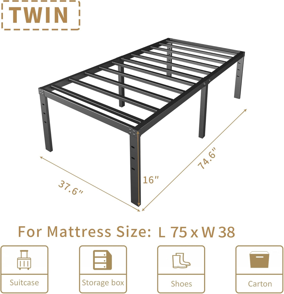 Store New Arrivals Add to Favorite View Feedback 16 Inch Twin Size Bed Frame - No Box Spring Needed Heavy Duty Black Metal Platform Mattress Foundation, Non-Slip Noise Free Easy Assembly Steel Slats Bedframes with Cleance Storage Description Item model number HBT40-16INCH Finish Type Powder Coated Style 16 Inch Maximum Weight Recommendation 2000 Pounds Furniture Finish Powder Coated Assembly Required Yes Included Components Headboard, Slat Color Black Material Metal Style 16 Inch Product Dimensions 74.6"L x 37.6"W x 16"H Compatible With Mattress Size Twin Item Weight 23.4 pounds Form Factor Metal Size Twin Special Feature Squeak Resistant Product Care Instructions Wipe with Damp Cloth Manufacturer -US NOISE FREE: Every part fits perfectly after the assembly, Non-twisting, Non-squeeking. All the legs are equipped with rubber feet to prevent noise and scratches to the floor or carpet. HEAVY DUTY PLATFORM BED FRAME: 6 bed legs for great support, stable and no cracking after the assembly. Strong steel slats offer large weight capacity. Support up to 2000lbs. AMPLE STORAGE SPACE: 16 inches bed frame with 14 inches underbed storage space. It's perfect for storing various odds and ends. You don't need worry about the accumulation of items and make the space more neat. EASY ASSEMBLY: The box have included all the Twin platform bed frame parts, screws, wrench and assembly instruction. No box spring will be needed. 3 RESERVED HOLES: All the twin size bed frame legs with 3 reserved holes for you to attach your own standard-sized headboard and footboard. WARRANTY: We provide 3 years of free warranty. If you have any questions or problems, please feel free to contact us at any time. You will be answered within 12 hours. Product description The video showcases the product in use. The video guides you through product setup. The video compares multiple products. The video shows the product being unpacked. 1 Sturdy Support 2 U-SHAPED GROOVE 3 Floor Protectors 4 Reserved Headboard Hole 5 Stable Structure 16 Inch Metal Platform Bed Frames with Underbed Storage Space Under Bed Storage:16 inch high metal bed frame provides 14 inches of underbed storage, making the room cleaner and tidier. Heavy Duty Bed Frame:The king bed frame is made of durable steel, and is capable of with standing up to 3000 pounds without deformation. Noise Free - HOBINCHE metal bed frame is engineered for a noise-free experience. More Size Options Add to Cart Add to Cart Add to Cart Add to Cart Add to Cart Add to Cart Customer Reviews 4.5 out of 5 stars 3,910 4.5 out of 5 stars 3,910 4.5 out of 5 stars 3,910 4.5 out of 5 stars 3,910 4.5 out of 5 stars 3,910 4.5 out of 5 stars 3,910 4.3 out of 5 stars 42 Price $88.99 $ 88 . 99 $89.99 $ 89 . 99 $58.99 $ 58 . 99 $99.99 $ 99 . 99 $89.99 $ 89 . 99 $95.99 $ 95 . 99 — Material Metal Metal Metal Metal Metal Metal Metal Height 10 Inch 12 Inch 14 Inch 16 Inch 18 Inch 20 Inch 6 Inch Features Easy Assembly Easy Assembly Easy Assembly Easy Assembly Easy Assembly Easy Assembly Easy Assembly Box Spring Needed ✘ ✘ ✘ ✘ ✘ ✘ ✘ Load Capacity 3000LBS 3000LBS 3000LBS 3000LBS 3000LBS 3000LBS 3000LBS Headboard Hole Reserved Holes Reserved Holes Reserved Holes Reserved Holes Reserved Holes Reserved Holes No Reserved Holes ABOUT US We offer the best prices around on high quality products. Our E-store includes media such as books, movies, music and games while offering electronics, toys, sporting apparel, clothing, tools, general home, garden items and more. SHIPPING We are always working hard to ensure your package arrives as soon as possible. Please understand that some factors like weather, high postal traffic, and the performance of shipping companies are outside of our control. We offer free shipping to the lower 48 states and ship within 2 business days of payment, usually sooner. We do not accept P.O. Boxes. Please provide a physical address. RETURNS We offer a 30-Day Return Policy on items which you are not completely satisfied with. You have the option for a full-refund or an exchange of the item. No returns are available on items shipped outside of the USA. PAYMENT We accept PayPal. CONTACT US This page content is yet to come Please ad us to your favorite seller and visit again later Thank You