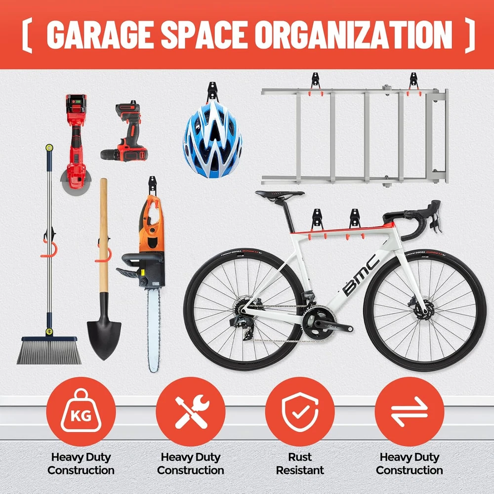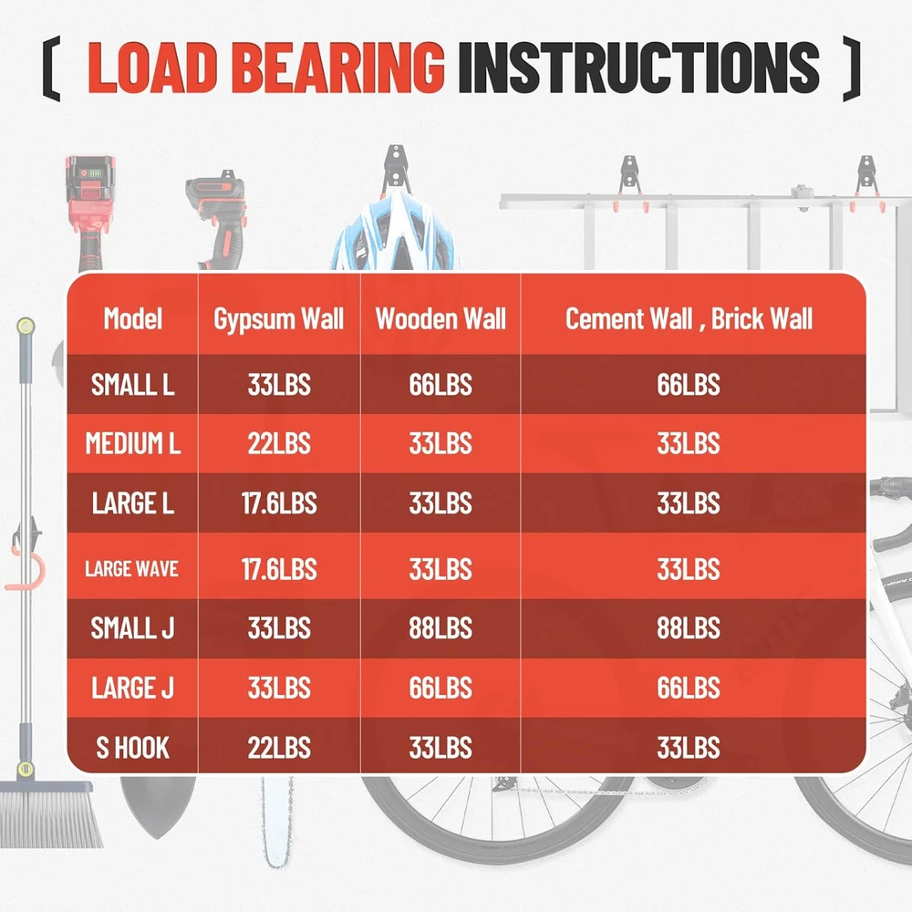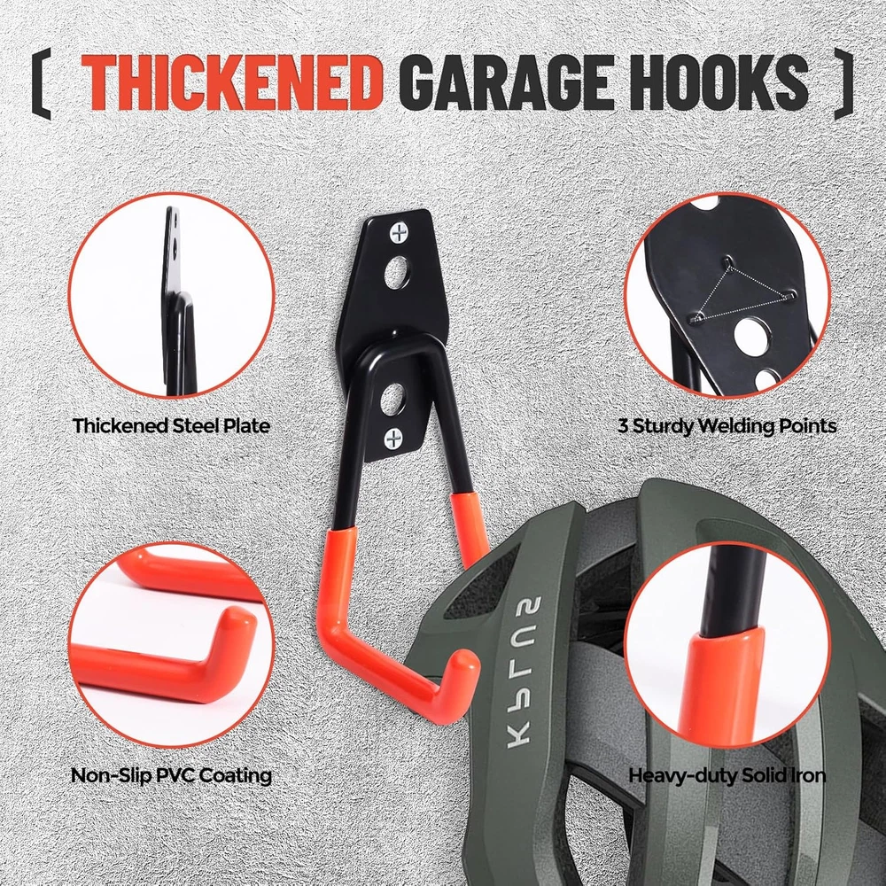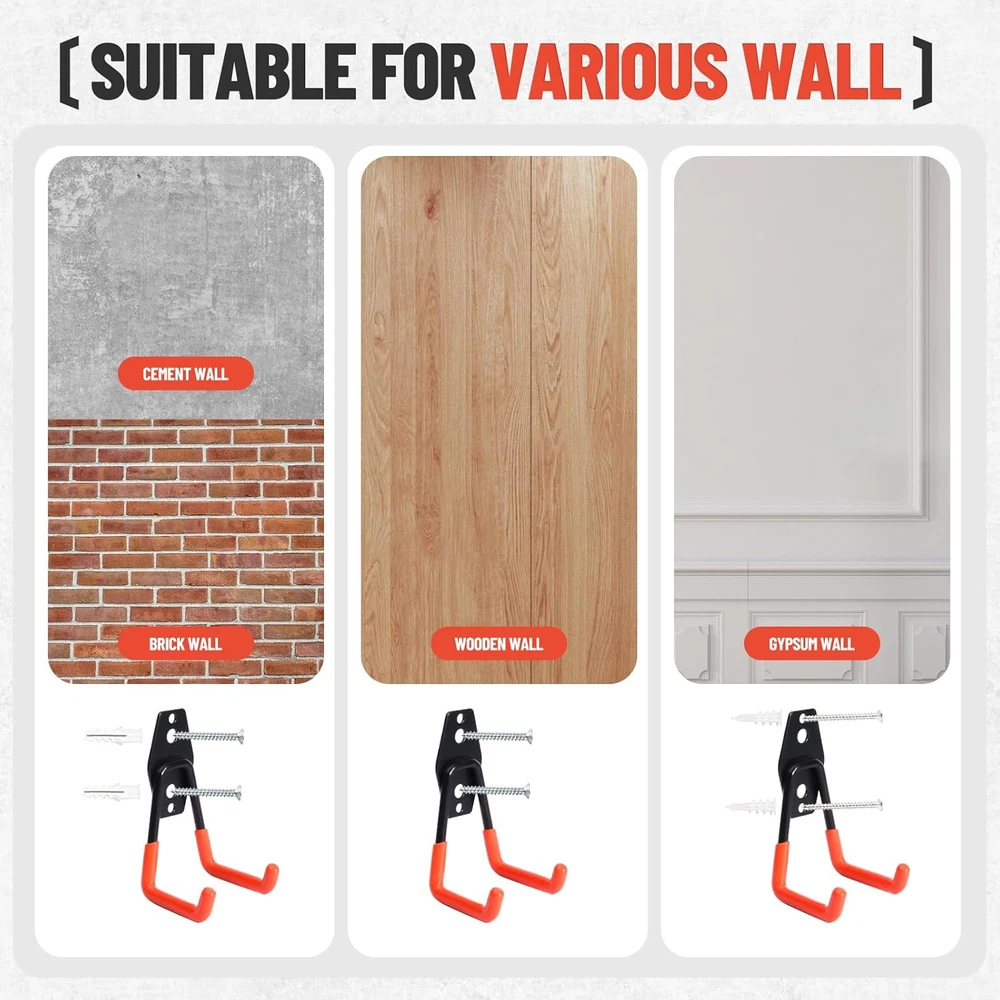 HEAVY-DUTY CONSTRUCTION: This utility hook set with sturdy steel is built to withstand heavy loads and harsh environments.Crafted with a premium PVC coating concurrently,it can also preventing stored items from slipping and safeguarding both your equipment and hooks from scratches and damage. VERSATILE ORGANIZATION: Featuring 14 tool hooks of varying sizes (2 S Hooks, 2 Small J Hooks, 2 Big J Hooks, 4 Small L Hooks, 2 Medium L Hooks, 1 Large L Hook, and 1 Large Wave Hook), and 2 extension straps ,it accommodates a wide range of tools and equipment. EASY INSTALLATION: Designed for plaster, wooden, and brick walls, with appropriate threaded plugs and plastic anchors included for different surfaces.Simply with a drill, hammer and screwdriver, can easily install wall mount hooks to hold any item to storage. SPACE-SAVING SOLUTION: The storage hooks can be used anywhere you need,such as garages, sheds, warehouses, gardens, shops, and barns, efficiently organizing garden tools, power equipment, ladders, bikes, and more. Adopting a dual hook design and utilizing vertical storage methods to maximize available space. STURDY DURABILITY:The garage hook is made of high-quality heavy-duty solid steel, and the plate has three firmly welded joints. Compared with traditional hanging hooks, the new double hook design improves stability. Can ensure safe load-bearing without bending. In addition, heavy duty hooks have excellent rust and corrosion resistance. Product Description