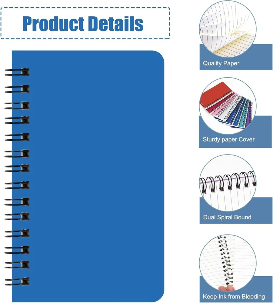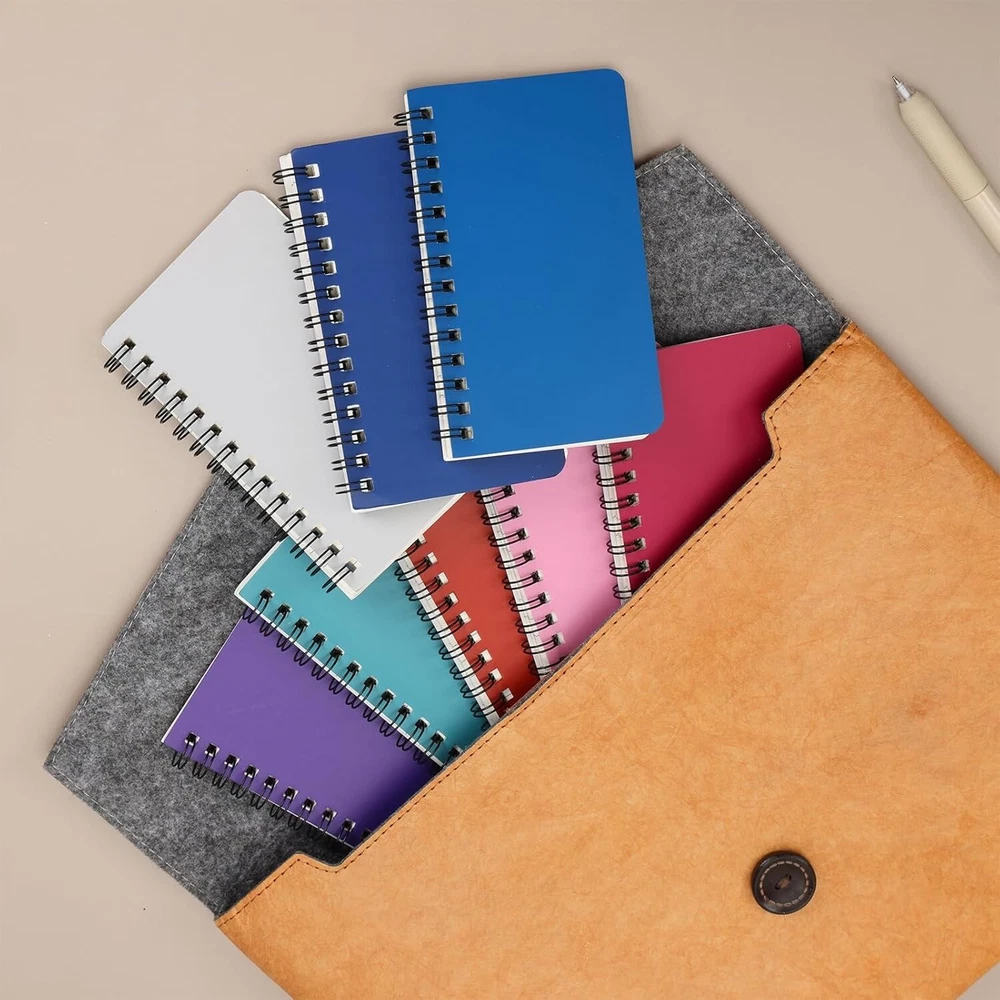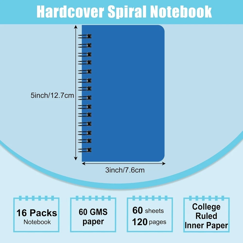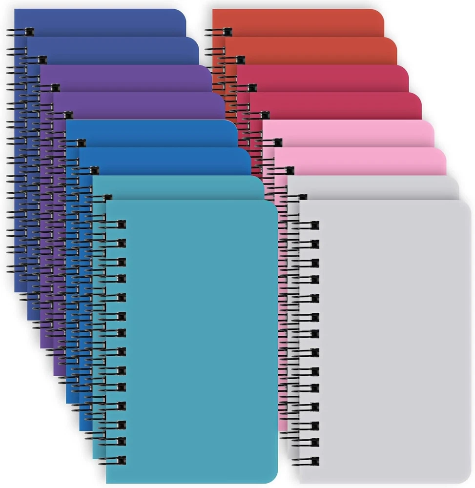 16 Pack Small Spiral Pocket Notebook, 8 Assorted Color , 3x5 In - Free Shipping About this item Package contains: 16 pack in total, pocket size, 3 5in/7.6 12.7cm, college ruled paper, sturdy double line binding. High-grade paper: Very smooth, perfect for writing, will not leak ink, can bring you a better writing experience. Classic design: Gemstone color cover comes in a total of different colors and is very high-end. These memos are rounded and cut, and the size of the pocket is easy to carry. Record your daily life and make a work plan! Multiple uses: Suitable for all office, school and home use, including taking notes and keeping your work in order, as a diary or journal, for brainstorming ideas, creative writing or just doodling and drawing. Best gift option: Jot down your notes, to-do lists, thoughts and ideas in this quality journal. It's a great choice as a gift. Product Description