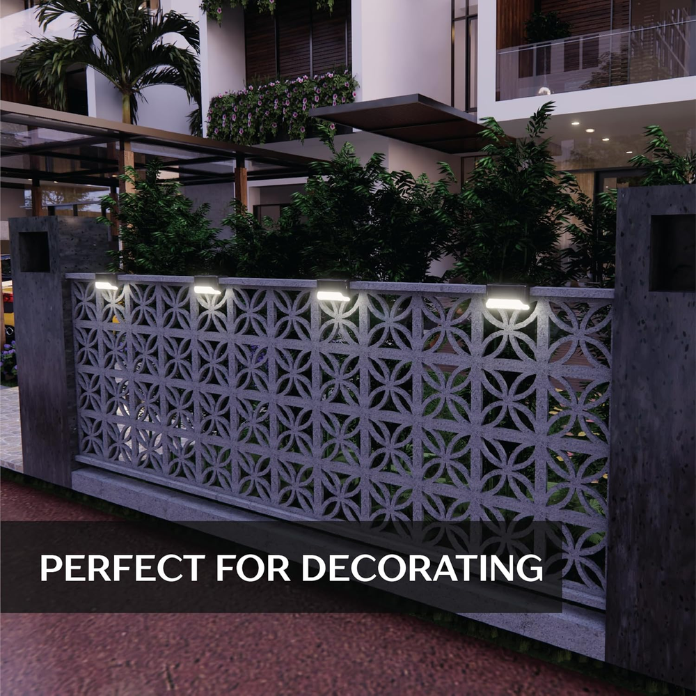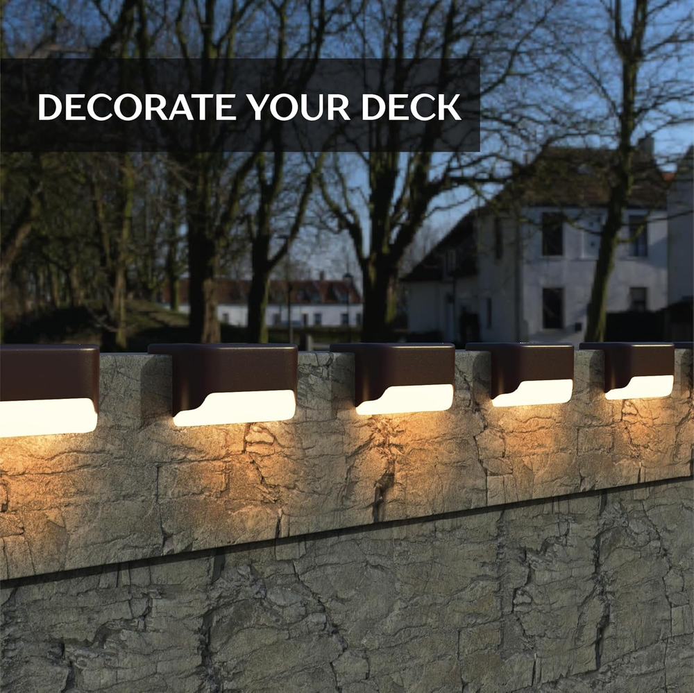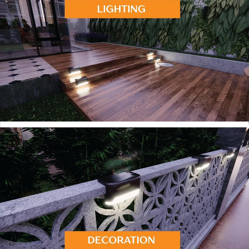【 Areas of use 】Solar powered fence lights are great for illuminating outdoor staircases, pathways, pools, gardens, balconies, decks, as well as front door, backyard, driveway, garage, exterior wall, etc. It can also be used in lighting. You can take safe steps with solar powered deck lights. 【 DURABLE AND LONG-LASTING 】 Produced with first-class materials, OZEM solar powered outdoor lighting is resistant to scorching temperatures and cold, snow, rain and wind. With an IP65 waterproof rating, your outdoor lighting investment will last in the long run. 【 Solar Powered and Automatic On/Off 】 Using solar energy as energy, it only takes 4-5 hours to fully charge on sunny days. With sensor and automatic switch, this deck light can automatically turn on at dusk and turn off at dawn. It can provide up to 16 hours of illumination if fully charged. 【 EASY INSTALLATION 】 Solar deck lights can be installed anywhere, which can be fixed with screws, and can be installed very easily with double-sided tape. Customize your setup to fit your preferences. 【 A MODERN AND STYLISH IMAGE 】 You can capture a modern look in your garden, staircase, veranda, pool or deck with Ozem solar panel-powered fence lights. A stylish and safe environment with adequate lighting awaits you. Product Description