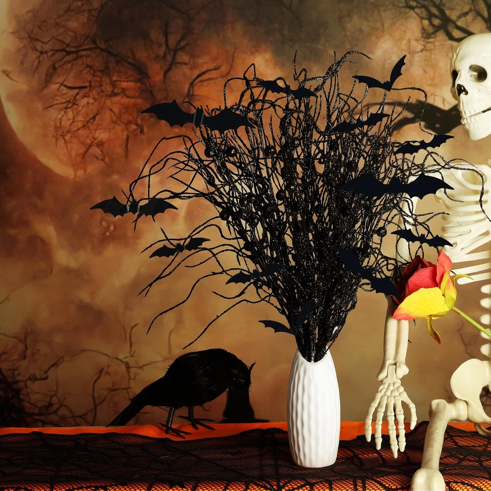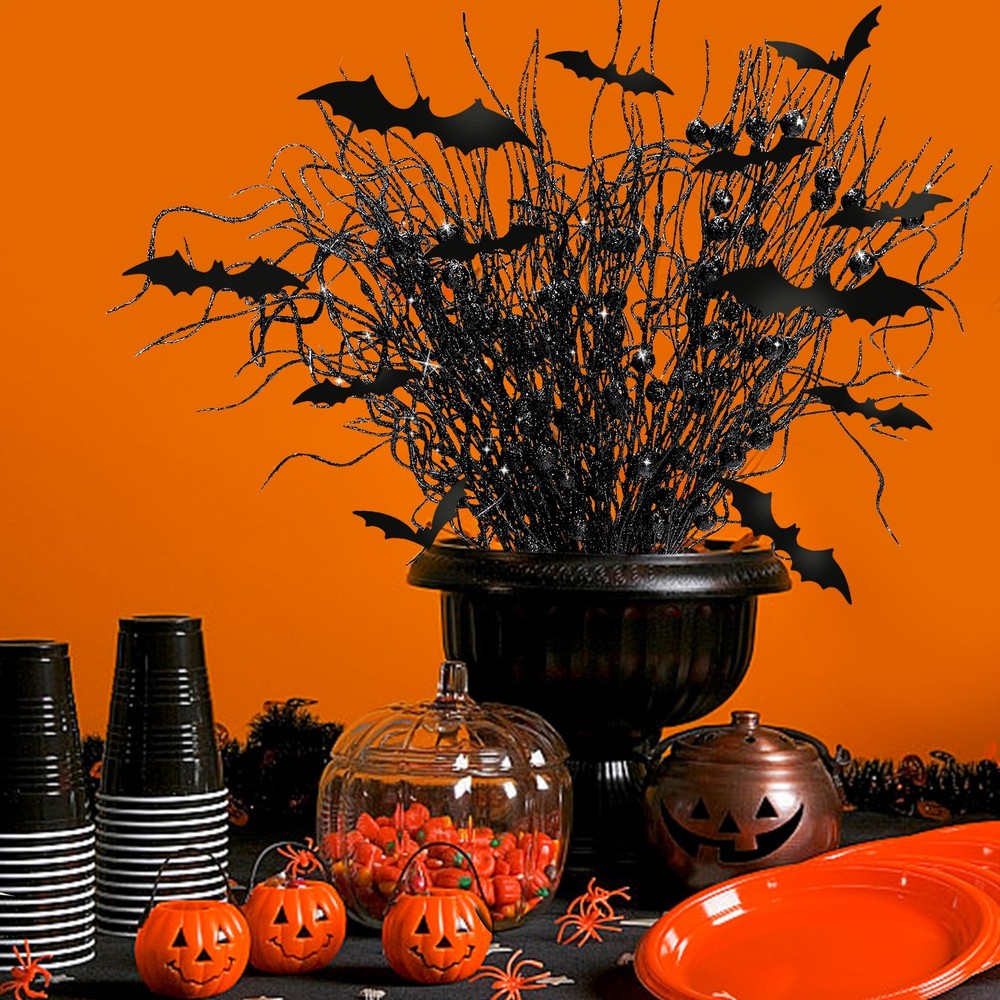16 Pcs Artificial Halloween Branches Picks Ornaments with 12 Black Berries Product Details Package Includes: You'll receive 10 pcs black branches picks measuring 18 inch, 6 pcs black berry stems measuring 15 inch, and 12 pcs black bats in 4 different sizes, easy to insert in the vase, meet your Halloween decorations. Realistic Design: This item is designed with black appearance and classic bats elements, berry stems and curly willow branches shape, the appearance and touch are realistic, which will not fade and provides a better atmosphere for scary scenes. DIY Halloween Decor: These Halloween branches stems and black bats are flexible, and you can get creative and DIY as you like, gluing bats to tree branches, windows, fireplaces, etc., to go with any Halloween themed decorations and styles. Quality Material: Our Halloween tree glittery branches are made of plastic and foam, easy to bend, waterproof, can be exposed to the sun and rain, not easy to damage, and can be used for a long time. Widely Used: The artificial Halloween picks with black bats can be placed on trees, vases or jars to decorate haunted houses, Halloween parties, tables, gift boxes, DIY crafts, wreaths, etc., both indoors and outdoors.