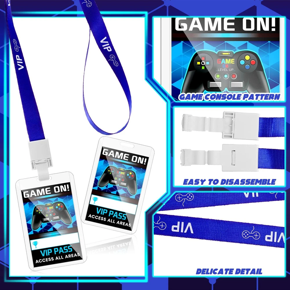 16 Pieces Blue Video Game VIP Pass Holder Tickets Set Video Game Party Favors Game Ticket Holder Gamer Party VIP Pass Lanyards for Game Themed Birthday Party Supplies Features: Reliable to use: This ticket holder is made of quality material, which is reliable to use, sturdy and firm, not easy to fade and break, can be applied for a long time. Nice gift: Gamer party supplies look simple and classic, can be good gift choice to send to your family members, friends, relatives and more, they will feel your thoughtfulness. Specifications: Material: card and PVC plastic Color: blue Size: as picture shown Package includes: 16 x VIP pass cards 16 x Card holders 16 x Lanyards Notes: Manual measurement, please allow slight errors on size. The color may exist a slight difference due to different screen displays. Rich in Quantity: you will receive 16 pieces VIP pass cards, 16 pieces card holders and 16 pieces lanyards in the package, which are enough for you to use and replace in daily life, they can help you decorate themed parties and other activities Thoughtful Design: this pass card and card holder with lanyards are game themed design for video game theme party, ideal for birthday, anniversary, parties or other celebration, game is always loved by everyone, both kids and adults Multiple Purposes: the hook of this ticket holder is very easy to bend and click on; After the party, they are still useful for company badge or public transportation pass even theme park ticket Reliable Quality: these video game VIP pass holders are made of card and PVC plastic, these video game party items are reliable, reusable; The edges of holder feel smooth and there is no risk of injury, lightweight and comfortable, they will not put a strain on your neck Proper Size: the card inside is approx. 2.13 x 3.35 inches/ 5.4 x 8.5 cm, the card holder is approx. 2.56 x 3.94 inches/ 6.5 x 10 cm, the length of the lanyard is approx. 17.32 inches/ 44 cm, proper size for you to use Shipping from the USA All of our products are shipped from the USA, ensuring quick delivery to your destination. Payment We offer the following payment methods: PayPal, credit card, bank transfer, and eBay's secure payment system. Free Shipping & Free Returns Shipping within the USA is FREE. Additionally, any return is absolutely free for you. Risk-Free Purchase You have the option to return an item within 30 days without any justification. We cover the return shipping costs! Fast Shipping We ship immediately upon receipt of payment. Generally, the package is delivered within 2-3 days in the USA. If it takes longer, we will contact you. Quality and Costs Made in Europe, USA, China No customs fees or additional charges Total satisfaction guarantee Invoice with declared VAT available upon request in .pdf format Feedback Your feedback is very important to us. After you pay for your purchase, you will automatically receive positive feedback from us.
