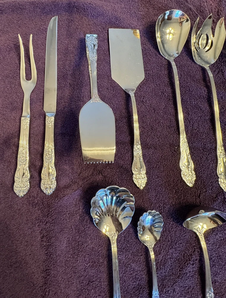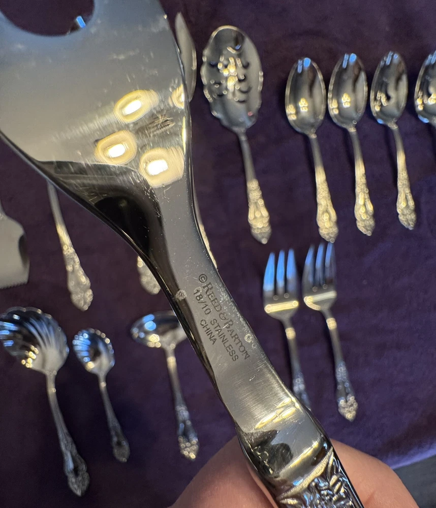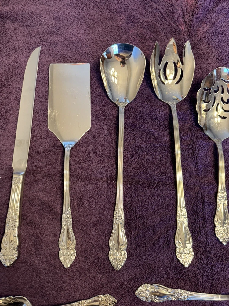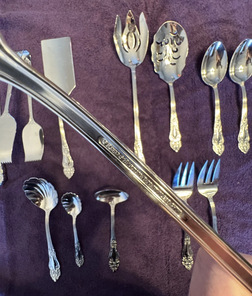 16 pieces total! See all photos! I’m unsure the name of each piece but they’re all the larger serving utensils for the haversham silverware. *At the time of listing, I also have a 6-person silverware lot for this same style! Check out my other listings if you want a larger set! May have some surface scratching and/or water markings from rinsing. Elevate your dining experience with the Reed & Barton Haversham Glossy 18/10 Stainless Flatware collection. Designed for both elegance and durability, each piece in this set embodies the traditional style with its intricate floral and scroll patterns, complemented by a brilliant silver finish that resists rust and corrosion. Ideal for any occasion, the set includes a diverse array of hostess and serving pieces, such as a ladle, slotted spoon, cake/pie slice, knife, server, serving fork, and serving spoon, ensuring that you're well-equipped for any gathering. Crafted with a commitment to quality, these stainless steel utensils are dishwasher safe and designed for repeated use, making them as practical as they are stylish.
