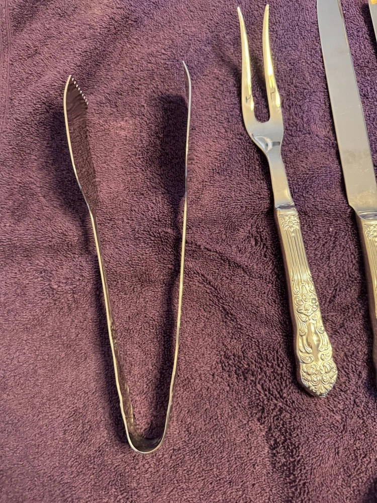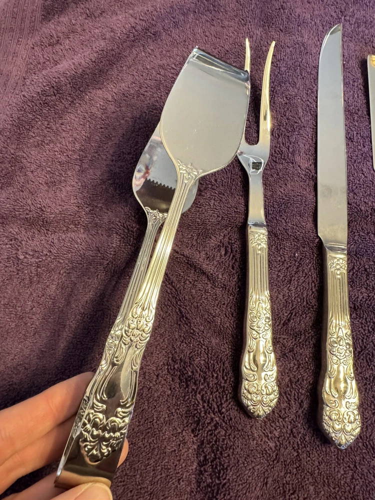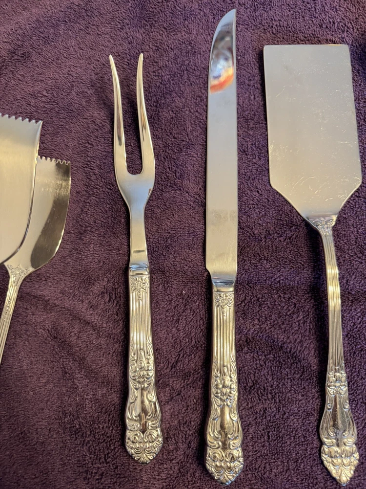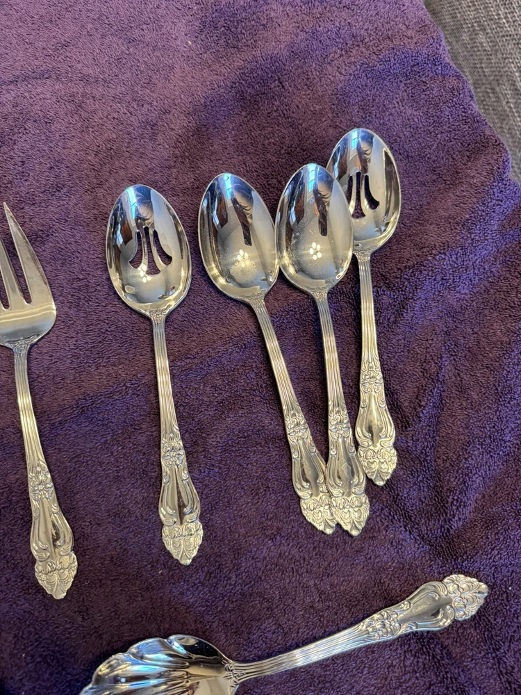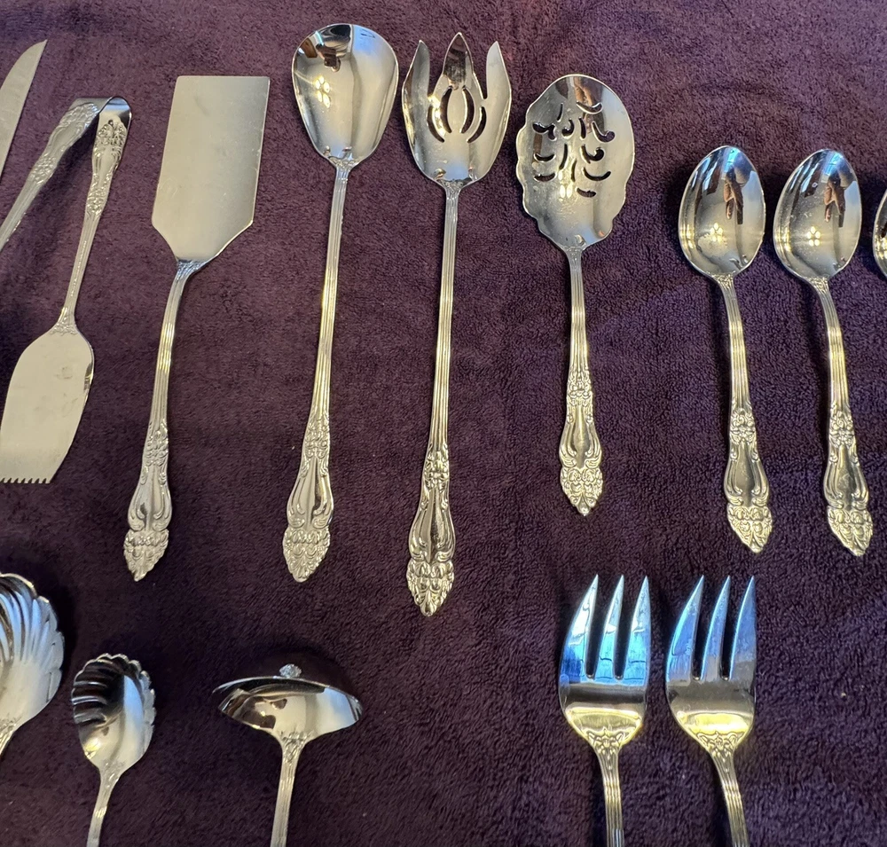 16 pieces total! See all photos! I’m unsure the name of each piece but they’re all the larger serving utensils for the haversham silverware. *At the time of listing, I also have a 6-person silverware lot for this same style! Check out my other listings if you want a larger set! May have some surface scratching and/or water markings from rinsing. Elevate your dining experience with the Reed & Barton Haversham Glossy 18/10 Stainless Flatware collection. Designed for both elegance and durability, each piece in this set embodies the traditional style with its intricate floral and scroll patterns, complemented by a brilliant silver finish that resists rust and corrosion. Ideal for any occasion, the set includes a diverse array of hostess and serving pieces, such as a ladle, slotted spoon, cake/pie slice, knife, server, serving fork, and serving spoon, ensuring that you're well-equipped for any gathering. Crafted with a commitment to quality, these stainless steel utensils are dishwasher safe and designed for repeated use, making them as practical as they are stylish.