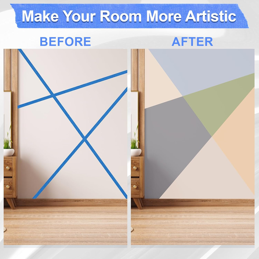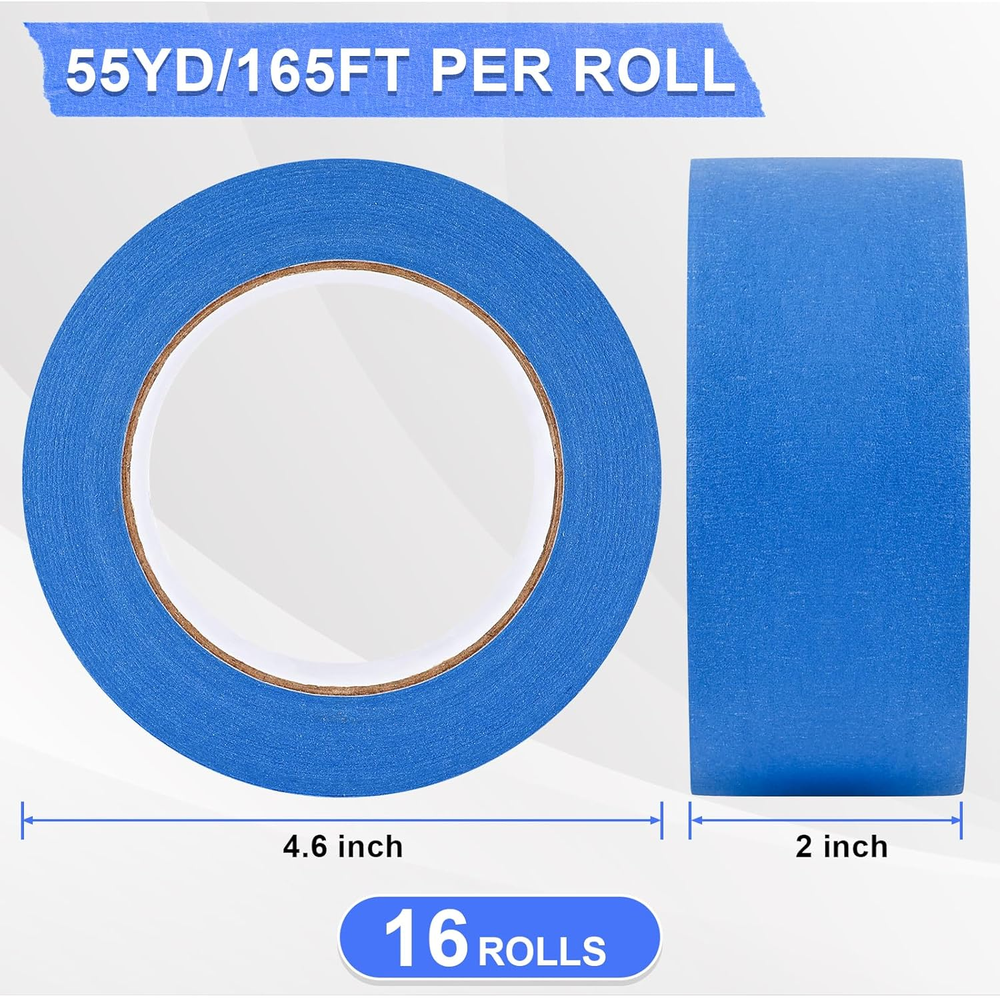 【Blue Painters Tape Set】 The Set includes 16 rolls of 2 inch wide X 55 yards blue painters tape,total 880 yards, suitable for any individual,professional, home or industrial project.Even beginners can easily draw perfect lines.To maximize the service life,please store the painters tape in a cool,dry,and dark place. 【Excellent Quality】Our painters tape is made of high-quality blue crepe paper,which can be easily torn off by hand without tools.Safe,and non-toxic.It also has characteristics such as UV & sunlight resistance,strong adhesion,no penetration,and durability,making it perfect for both indoor and outdoor use. 【Tips for Use】The masking tape is very suitable for edge treatment and corner detail works,which can prevent paint dripping or spillage.In order to obtain a good paint effect,please ensure that the surface is clean,dry,and dust-free before use;When applying,the painter tape should be flattened,especially on the sides;When the paste area is large,the tape should overlap by about 5mm at the joint. 【Remove without Residue】The masking tape uses high-quality adhesive,which can be easily removed without leaving any sticky residue or damaging the surface of the project;It can be kept on the surface for up to 14 days without worrying about leaving any Glue marks.Tip: After the paint is completely dry,gently peel it off at a 45 degree angle. 【Wide Application】The blue painters tape is writable,sticky and sealable.In addition to drawing sharp and clear edge lines,it can also be used for painting,caulking,marking,zoning,splicing,wrapping and other work.Suitable for various smooth or slightly textured surfaces,including but not limited to wood,walls,glass,metal,plastic,canvas.It is a must-have item for some home and office projects. Product description