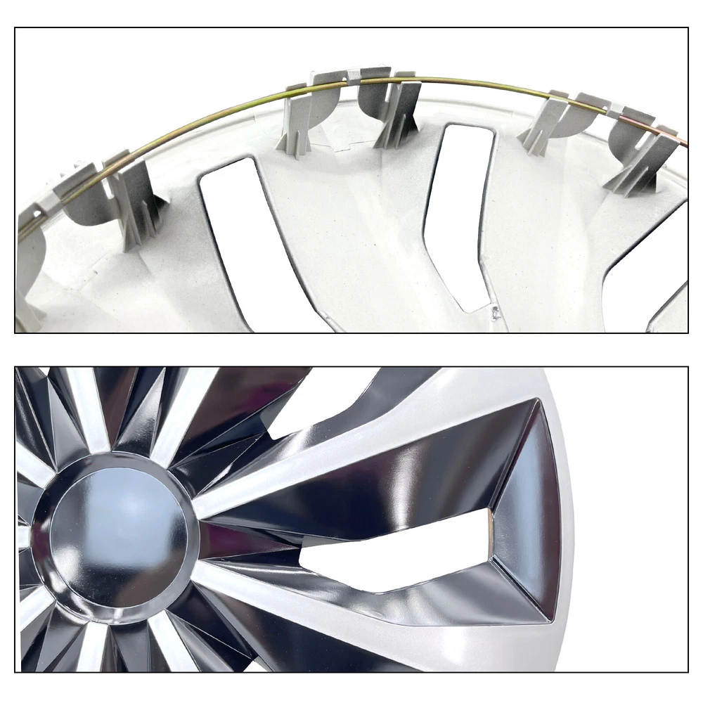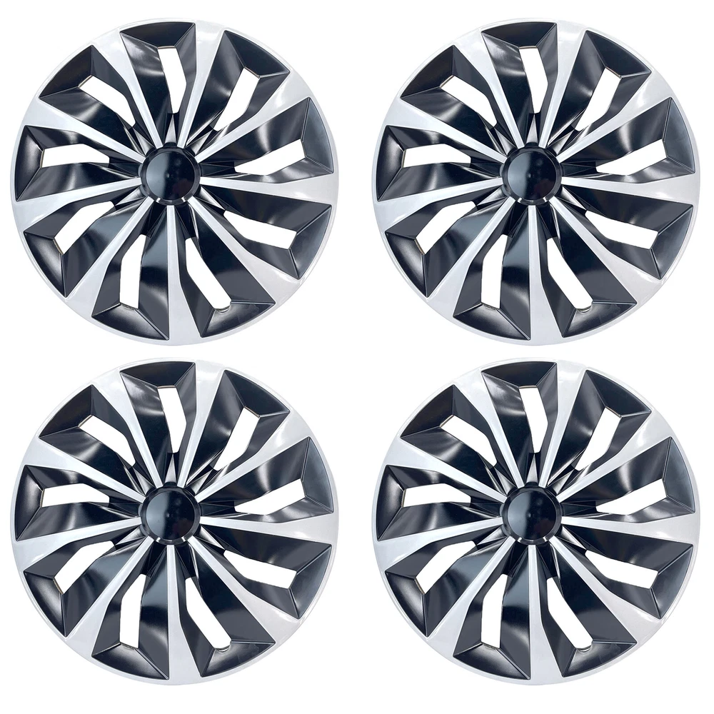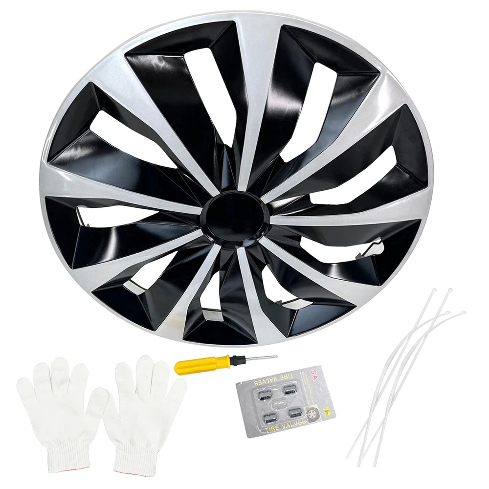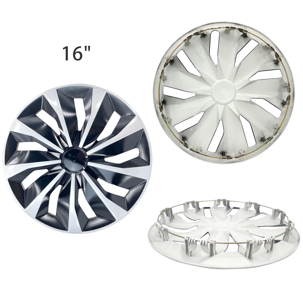 4 x 16" SILVER AND BLACK WHEEL COVER HUBCAPS PLEASE MAKE SURE YOU HAVE 16" STEEL WHEELS. Measure by checking the number after the "R" on your tires. IT MUST SAY R16! DESCRIPTION This pack contains four silver and black hubcaps, a pair of gloves, a screwdriver, four suitable tyre valve cores ,four white adhesive strips and Installation instructions. This product is easy to install, simple and stylish. Note: Please check your tyre size before buying a wheel. Please m ake sure your iron wheels fit these hubcaps. The color of the picture is slightly different from the real thing Welcome to purchase!