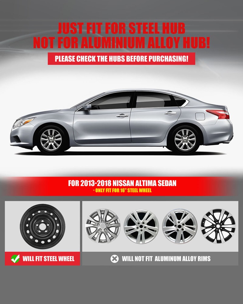Store Categories Other Car Refrigerator Front Bumper Rear Bumper Fender Flares Inner Fenders Side Steps Running Board A-Pillar Light Mount Brackets Headlights Taillights Fog Lights LED Headlights LED Taillights LED Fog Lights Jeep Chevrolet Ford Toyota Dodge GMC Set Of 4 Hubcaps: https://www.ebay.com/itm/405168209800 Wheel Covers Features ✴ PERFECT FIT: This wheel hub cap is specifically designed to perfectly fit for 16-inch wheels, ensuring a seamless match and enhanced aesthetics. It complements the overall design of the vehicle, elevating its visual appeal. ✴ HIGH-QUALITY MATERIAL: Constructed from high-quality materials, this wheel hub cap guarantees durability and longevity. It withstands various road conditions and environmental factors encountered during daily driving, maintaining its pristine condition. ✴ EASY INSTALLATION: Installing this wheel hub cap is a breeze and requires no specialized tools or modifications. It comes with a user-friendly system, allowing for a hassle-free installation process by following the provided instructions. ✴ PROTECTIVE FUNCTION: Besides its aesthetic appeal, this wheel hub cap serves as a protective barrier for the wheels. It prevents scratches and potential damage caused by stones, debris, or other objects, safeguarding the wheel's surface. ✴ AFTER-SALES SERVICE: If There Is a Loss of Product Parts, or Any Parts of The Problem, We Can Provide After-Sales Service, Please Contact Us on The Order Page. Wheel Covers Specification ✴ Type: Hub caps ✴ Number in Pack: 1 ✴ Color: Silver lacquer ✴ Material: ABS ✴ Compatible Wheel Diameter: 16 in ✴ Finish: Glossy ✴ Installation Type: Snap-On ✴ Model: For 2013 2014 2015 2016 2017 2018 Nissan Altima Sedan Wheel Covers Package ✴ 1 Hub cap and 1 retention ring Payment Delivery details Terms of sales About us Contact us Payment We accept PayPal, credit card , Apple Pay & Google Pay etc. Delivery details All items will be shipped within 1-3 business days after payment received, we will try our best to ship out as soon as we can, hope for your understanding. Please double confirm your address and contact information, which will help the delivery faster and more accurately. Note :buyers who purchase international products need to pay import tariffs!!! Terms of sales Professional installation is highly recommended. Any problem of the item please feel free to contact us first , please D o Not leave negative feedback before that, or simply return it within 60 Days in original condition. We will resolve it for you ASAP. About us Any questions please do not hesitate to contact us directly by eBay message . We will reply you within 24 hours asap, thanks for your understanding. Contact us Should you have any problem or require any further information please feel free to contact us . If you are satisfied with our product and service, please kindly leave us a positive feedback. Popular Categories On Mar 14, 2025 at 20:22:31 PDT, seller added the following information: