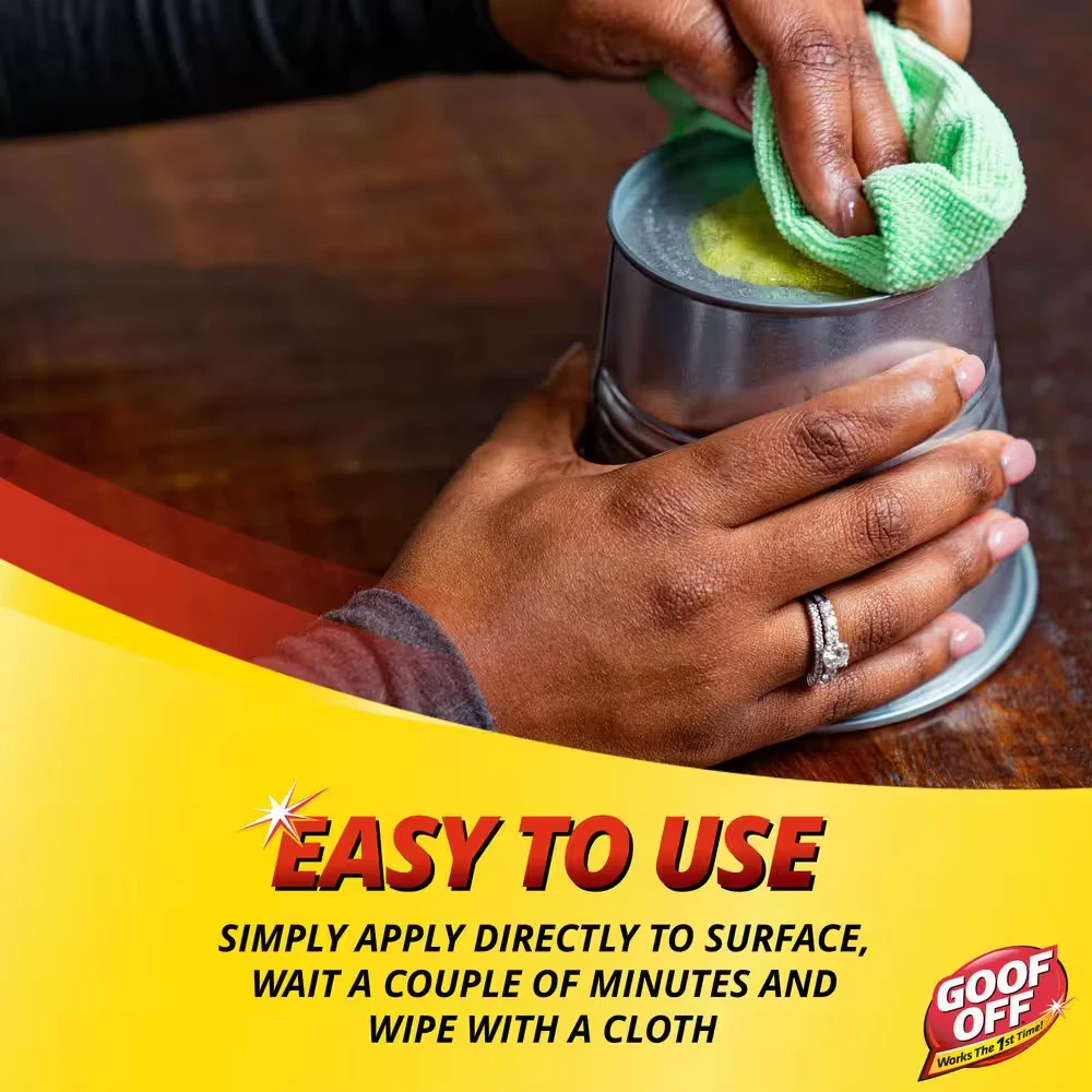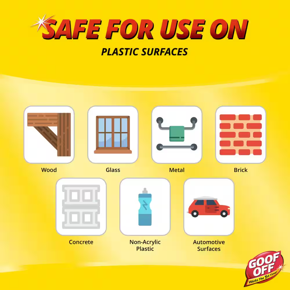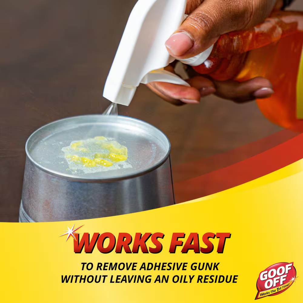 16 oz. Adhesive Gunk Remover Spray, Trigger Bottle NEWOpens Goof Off Adhesive Gunk Remover effectively removes the stickiest adhesive or glue. This adhesive gel remover is a trusted go-to product to combat the stickiest messes on hard surfaces. This adhesive eraser works wonders as a sticker remover tool, label remover, or decal remover. It clears away residue from forgotten tape and other tacky messes. Safe for use on hard surfaces like metal, glass, brick, wood, concrete, automotive and non-acrylic plastic surfaces. To use, simply spray the sticky area and wipe clean with a cloth - watch as this remover spray works like magic to cut through the gunk. Keep out of reach of children. Read and follow all label directions carefully. ADHESIVE GUNK REMOVER: Goof Off Adhesive Gunk Remover works the first time, removing sticky messes from glue, adhesives, and other adhesive gunk WORKS FAST: Goof Off is a rapid remover, better at removing glue and sticky adhesives than other leading brands SAFE FOR USE ON HARD SURFACES like metal, glass, brick, wood, concrete, automotive and non-acrylic plastic surfaces REMOVES STICKY ADHESIVES: Great for removing labels or decals, tape residue, or other sticky left-behind adhesives EASY TO USE: Simply spray the sticky area, wipe with a cloth and watch the residue disappear COMBATS THE STICKIEST MESSES: Powerful enough to remove the stickiest glue or adhesive NO RESIDUE: Clean scented citrus spray with no oily residue CONVENIENT SPRAY BOTTLE: Packaged in a 12-ounce or 16-ounce trigger spray bottle Re-coat before 1-hour or after 24-hours