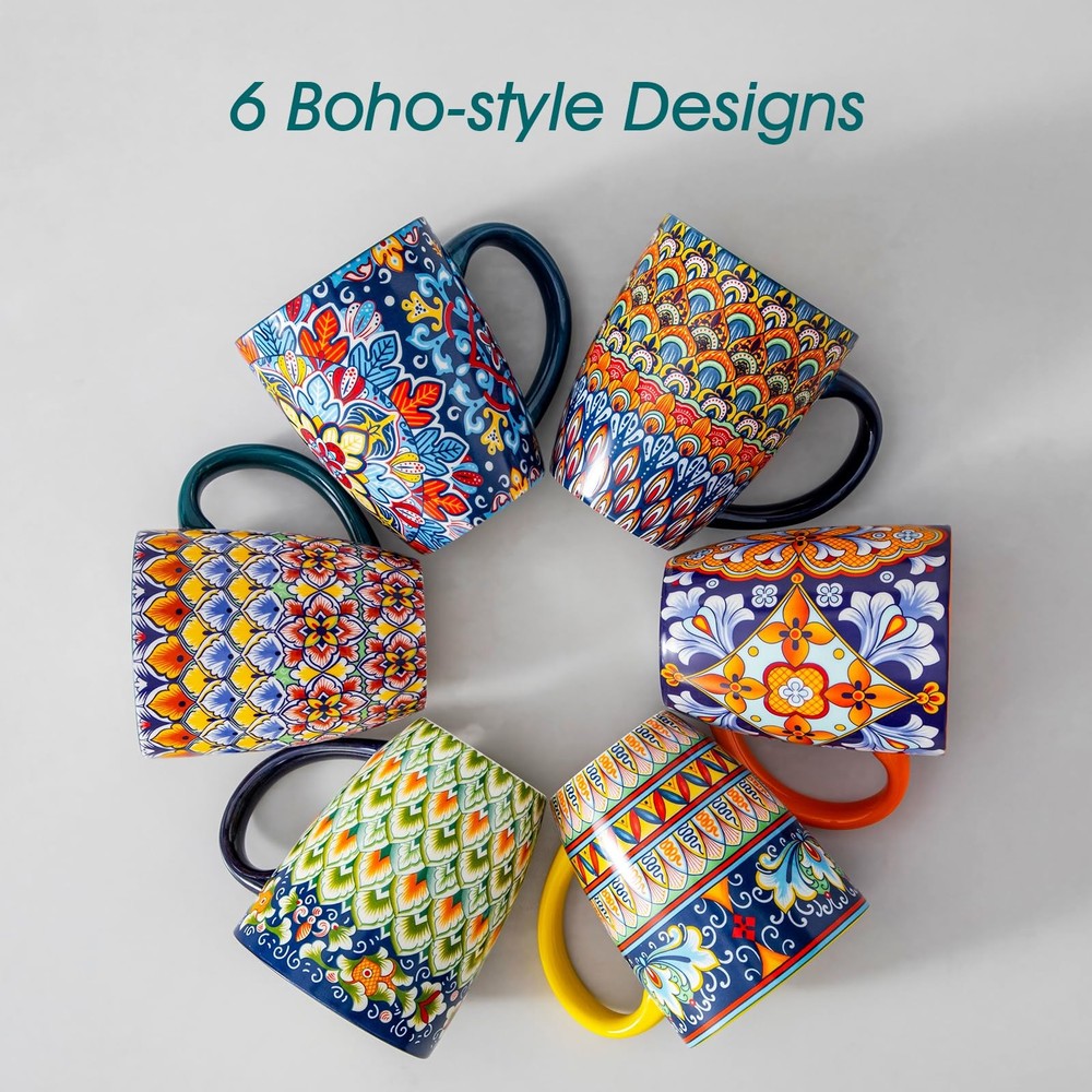 16 oz Coffee Mugs Set of 6, Large Ceramic Mug with Handle, Boho Coffee Cups for Latte, Cappuccino & Hot Chocolate, Dishwasher & Microwave Safe Gift Set, Series SIMI 【Bohemian Coffee Mugs】This ceramic mugs set includes six 16 oz cups (4.5"H x 5.4"W with handle) featuring unique boho patterns, perfect for coffee, tea and gift giving 【Large 16 oz Capacity】Holds generous servings of hot cocoa, iced tea or latte art. The extra-wide handle ensures a secure and comfortable grip for these ceramic coffee mugs 【Microwave & Dishwasher Safe】Durable coffee cups withstand daily use, microwave reheating and dishwasher cleaning 【Versatile for All Beverages】Perfect for both hot drinks in these ceramic mugs and cold beverages like smoothies or matcha - all in boho style 【Thoughtful Gift Ready】Vibrant bohemian designs make this mugs set ideal for birthdays, housewarmings and holidays 【Premium Ceramic Material】High-fired ceramic coffee mug resists stains, fading and odors while keeping colors vibrant 【Trendy Home & Office Decor】Elevates kitchens with these artisanal boho-chic coffee cups