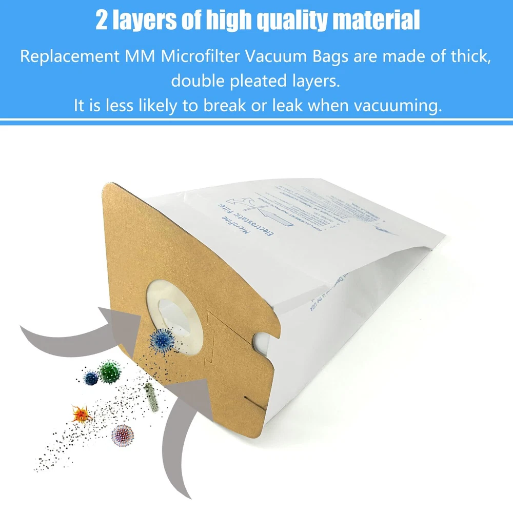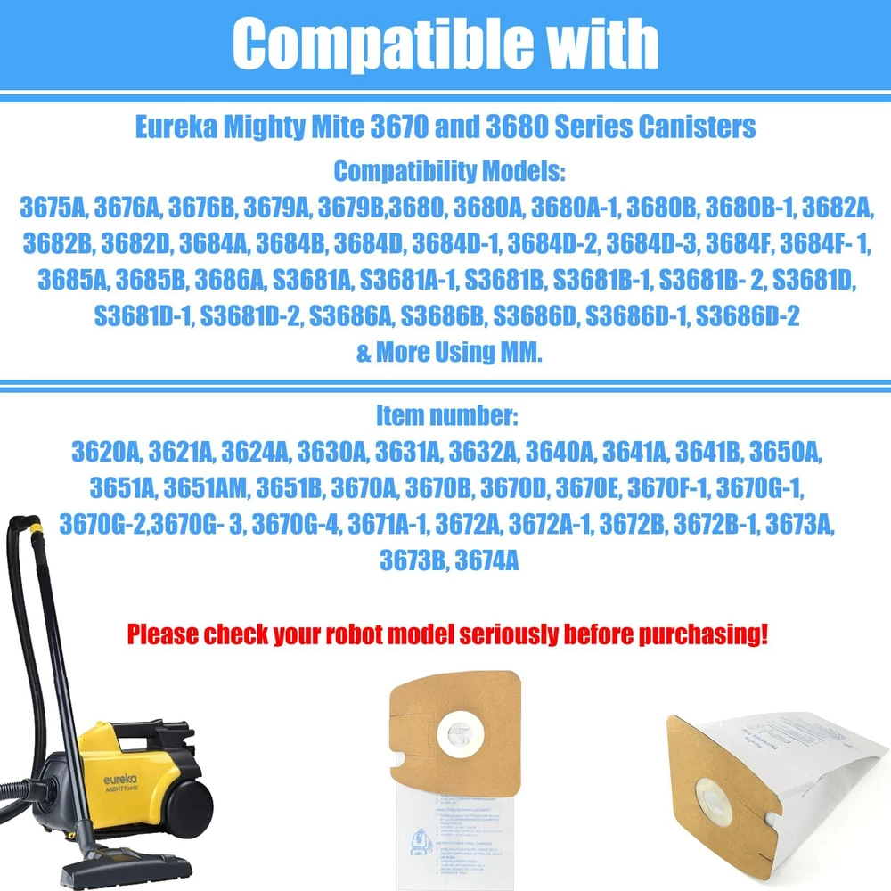 eureka mighty mite vacuum bags Item No. : 3620a, 3621a, 3624a, 3630a, 3631a, 3632a, 3640a, 3641a, 3641b, 3651a, 3651am, 3651b, 3670a, 3670b, 3670d, 3670e, 3670f-1, 3670f-1, 3670g-1, 3670g-2, 3670g-3, 3670g-4, 3671a-1, 3672a, 3672a-1, 3672b, 3672b-1, 3673a, 3673b, 3674a Compatibility Models 3675A, 3676A, 3676B, 3679A, 3679B,3680, 3680A, 3680A-1, 3680B, 3680B-1, 3682A, 3682B, 3682D, 3684A, 3684B, 3684D, 3684D-1, 3684D-2, 3684D-3, 3684F, 3684F- 1, 3685A, 3685B, 3686A, S3681A, S3681A-1, S3681B, S3681B-1, S3681B- 2, S3681D, S3681D-1, S3681D-2, S3686A, S3686B, S3686D, S3686D-1, S3686D-2 & More Using MM. Please confirm the machine model before purchasing The brand names and logos are registered trademarks of their respective owners. Any use of a brand name or model designation for a non-OEM product is made solely for purposes of demonstrating compatibility. 【Models:】MM Micro Filtration Vacuum Bags with Eureka Mighty Mite Canisters 3670 and 3680 Series, 3670, 3670M, 3670H, 3670G, 4100, S4170, 4300-4600 and 5180. to Model No.60295A, 60295B, 60295C and 60297A. (Please check your robot model seriously before purchasing!) 【Excellent quality】mm vacuum bags are made of 2 layers of high quality material, MM Microfilter vacuum bags are made of thick double pleated layers. It is less likely to break or leak when vacuuming. The high quality paper bag has a loop system with an adhesive closure that covers the air inlet holes and prevents the bag from leaking out during disposal during cleaning. 【What you will get: 】 pack of 16 eureka mighty mite bags, great value for money and a big set to save you time and money! 【24 hours service】 if you have model compatibility problems or other problems with eureka vacuum cleaner bags, please us, we will solve the problem for you within 24 hours.