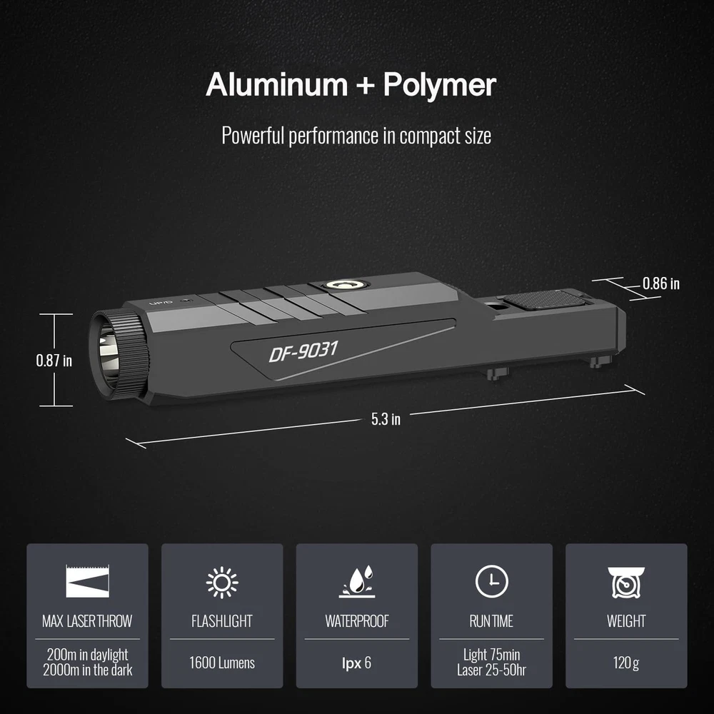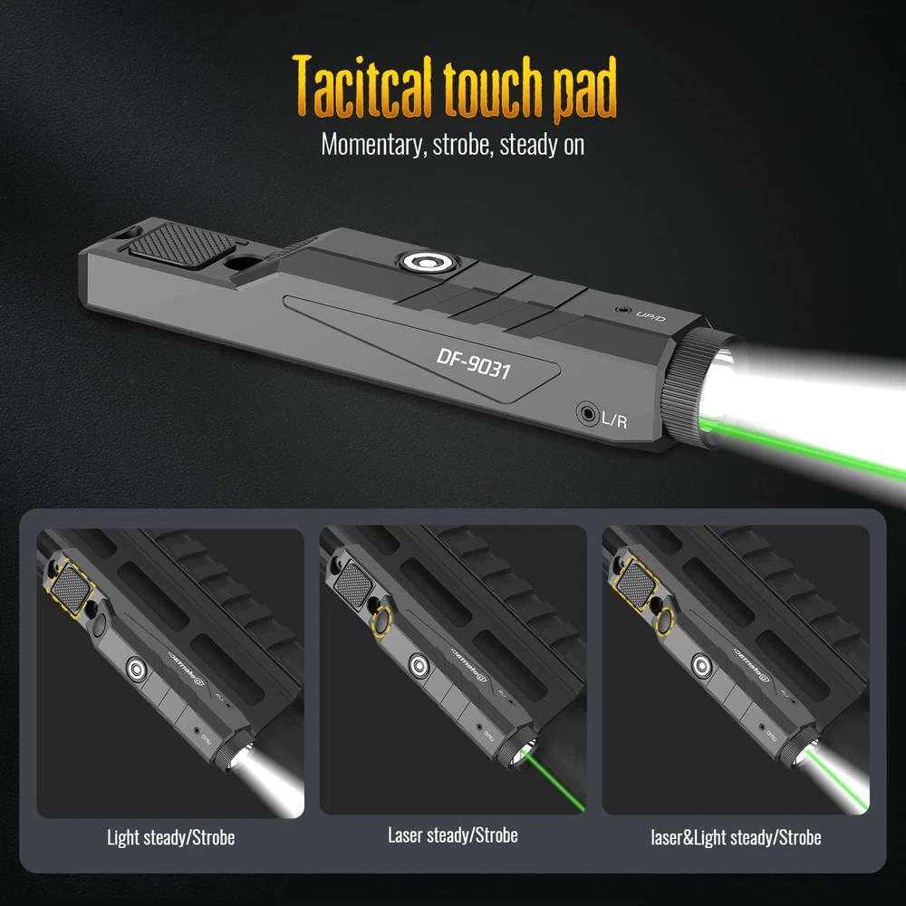 [Built-in Pressure Switch] Built-in Pressure Switch design,not need wired-romote. Makes your rail surface clear and simple [Super Bright] Super Bright Tactical Light with 1600 lumens and 240 meters tactical flashlight beam distance. The bright & adjustable green laser output is <5mW, the class is IIIA. The green laser beam distance is about 200 meters/ day; 2000 meters/ night [Magnetic Charging] Built-in Battery can be easily recharged while still mounted with the included magnetic charging cable. It can run about 75 minites for flashlight only; 60 minites for flashlight and laser; 20hrs for green beam only [Momentary & Steady & Strobe] Single press laser/ flashlight switch for steady mode; double press the switch quickly for strobe mode; single/double press the switch and hold it for momentary mode [Low profile & Shockproof ] 45 or 90 degree installation position are supported, the ultra low profile features won't block your scopes
