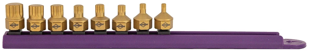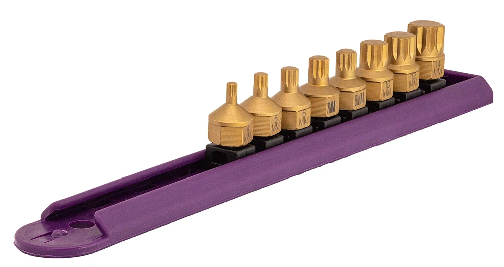 Dual Drive bits are a unique stubby length fastener driver system that can be used with any 1/4-Inch square drive socket spinner handle, ratchet, or T-handle and drive the outer diameter with either 1/2-Inch wrench or box wrench. Bits made from S2 tool steel with proprietary heat treat for superior strength and durability. Precision tip profile manufactured for positive and precise fastener engagement. Titanium nitride coating for added strength and wear resistance. Triple square set includes 4mm, 5mm, 6mm, 7mm, 8mm, 10mm, 12mm, and 14mm. Includes color coded storage rail. Low profile design: 3/4-Inch length, one piece design, allows for access in close quarters Unique Dual Drive design allows the bit to be driven by a Ratchet, Socket Spinner, Box or Open End Wrench Titanium coated for maximum wear resistance and rust prevention; proprietary heat treat for durability and strength Sockets marked with size for easy identification Triple square set includes 4mm, 5mm, 6mm, 7mm, 8mm, 10mm, 12mm, 14mm, and color coded storage rail