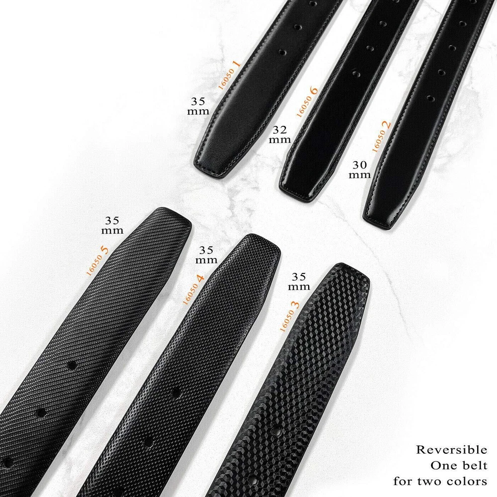 Description 35mm-Taupe Suede / Brown : This genuine full grain cowhide leather reversible belt strap offers versatility with its clamp-on or reversible buckle compatibility, allowing for a stylish accessory that adapts to your wardrobe. With a width of 1-3/8" (35mm) and seven adjustable holes, this belt strap accommodates a range of sizes for a comfortable fit. The smooth brown and suede taupe finish provides color options in belt strap, enhancing its practicality for various outfits. (No Buckle included) Black/Croco : This genuine cowhide leather reversible belt strap offers versatility with its clamp-on or reversible buckle compatibility. With a width of 1-3/8" (35mm) and seven adjustable holes, this belt strap accommodates a range of sizes for a comfortable fit. The strap showcases a smooth black finish alongside an alligator embossed design, offering distinct style options in accessory.(No Buckle included). Black/Tan-30mm : reversible belt strap belt for colors. Genuine leather dress belt strap with 5 holes. 1-1/8"(30mm) wide reversible leather belt strap. Black/Tan-32mm : reversible belt strap belt for colors. Genuine leather dress belt strap with 5 holes. 1-1/4"(32mm) wide reversible leather belt strap. Black/Tan-35mm : reversible belt strap belt for colors. Genuine leather dress belt strap with 5 holes. 1-3/8"(35mm) wide reversible leather belt strap. * This genuine cowhide leather reversible belt strap offers versatility with its clamp-on or reversible buckle compatibility, allowing for a stylish accessory that adapts to your wardrobe. * With a width of 1-3/8" (35mm) and seven adjustable holes, this belt strap accommodates a range of sizes for a comfortable fit. 1-1/8"(30mm) wide reversible leather belt strap. * Crafted from high-quality leather, it boasts feathered and stitched edges for enhanced durability and a sophisticated look. * Our belts are expertly crafted and measured from the beginning of the leather to the center hole, ensuring a precise fit. For optimal sizing, it is recommended to measure an existing belt from the fold to the hole you typically use.
