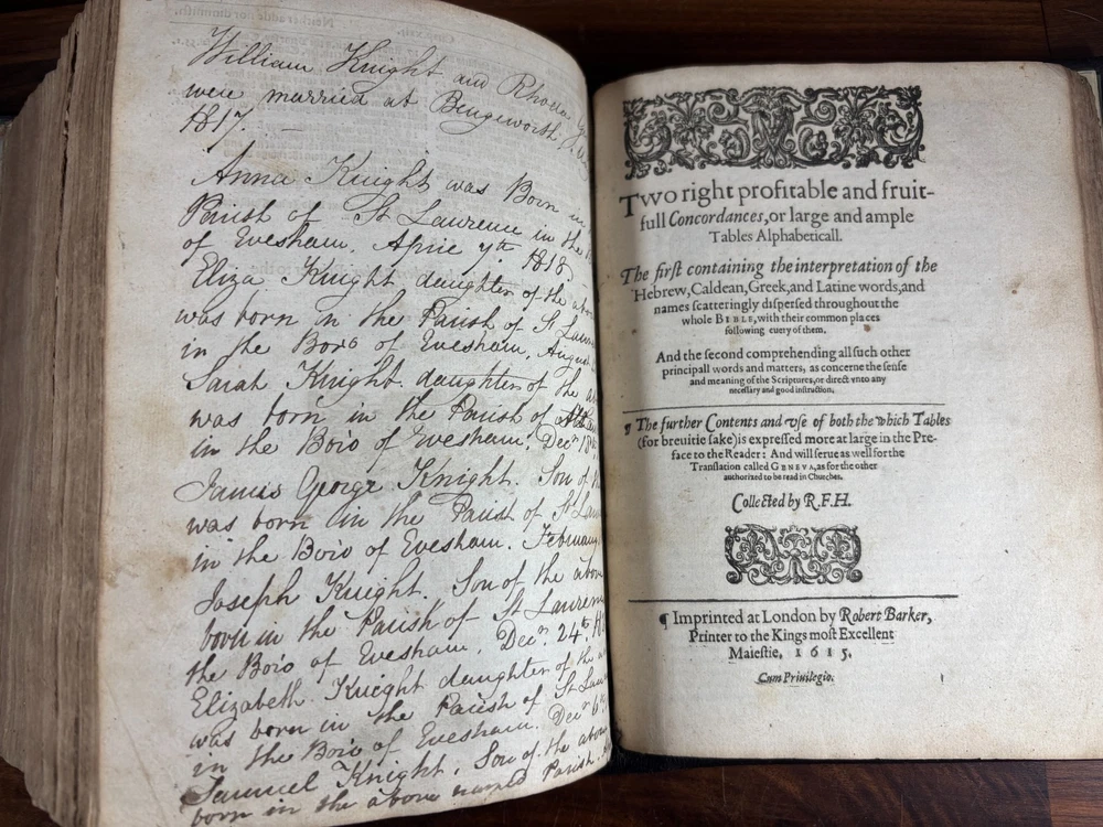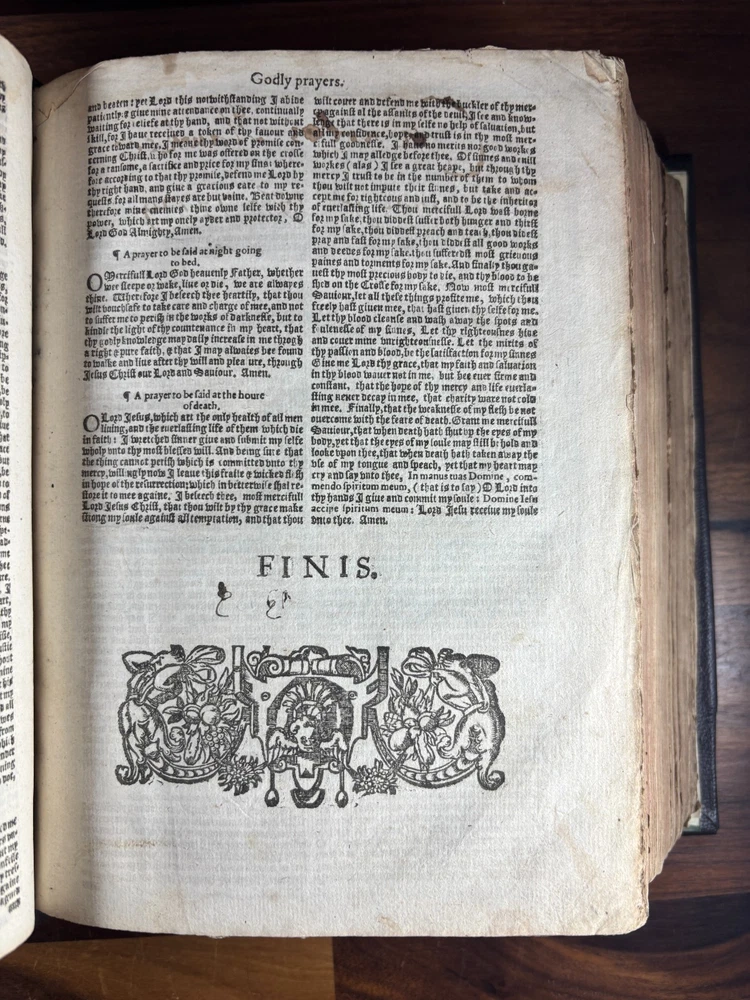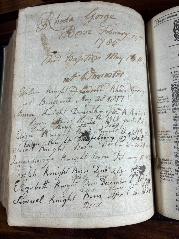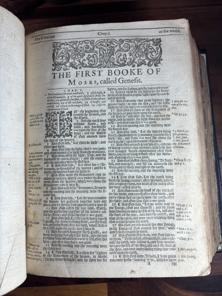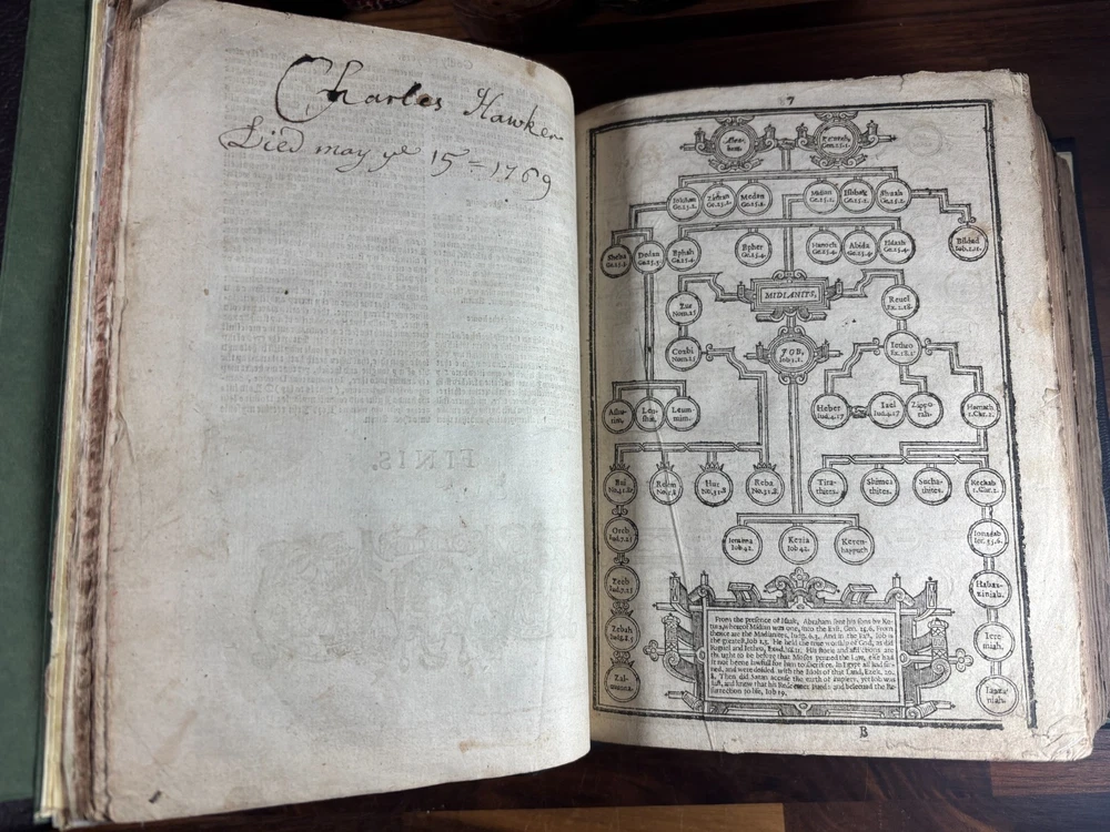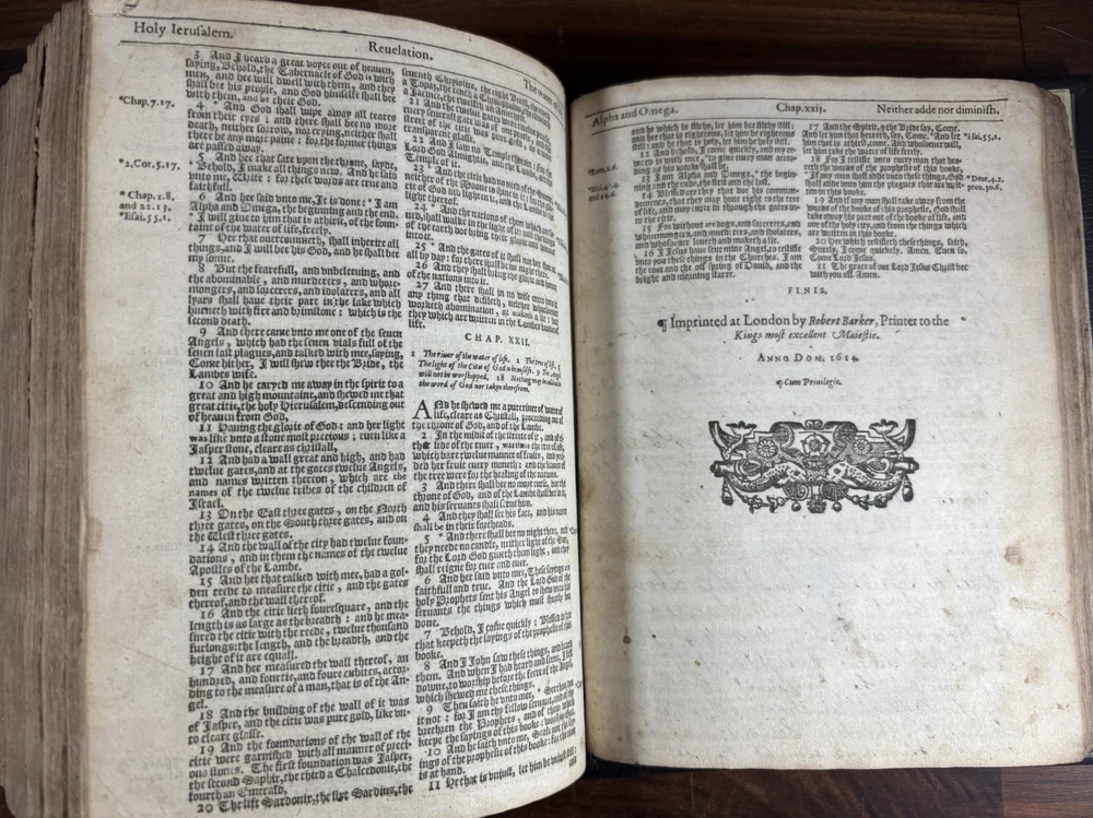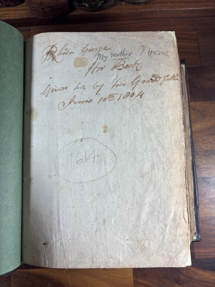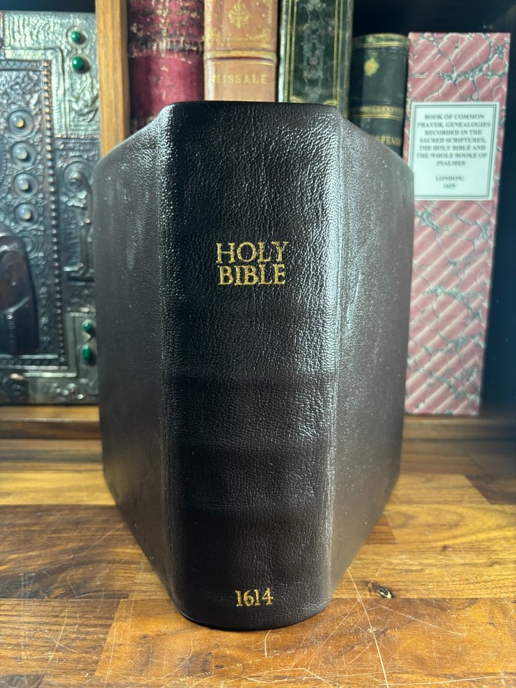 An early quarto printing of the King James Version of the Holy Bible , printed in London in 1614 by Robert Barker , the royal printer to King James I. This edition belongs to the early generation of King James Bibles printed just three years after the first edition of 1611 and represents one of the earliest widely circulated formats of the Authorized Version. The volume is printed in black-letter (Gothic) type in double columns , with extensive marginal references, genealogical tables, and a concordance. The New Testament concludes with the imprint: “Imprinted at London by Robert Barker, Printer to the Kings most excellent Majestie. Anno Dom. 1614. Cum Privilegio.” The book is bound in a later full leather binding with gilt spine title “Holy Bible 1614.” Several early manuscript family entries appear on the preliminary leaves, including genealogical records for the George and Knight families , with dates ranging from the early 18th to early 19th centuries. Bibliographic Details Title: The Holy Bible, Containing the Old Testament and the New Version: King James Version Printer: Robert Barker Place: London Date: 1614 Format: Quarto Typography: Black-letter with Roman marginal references Herbert 331 Features include: Decorative genealogical tables of biblical families Extensive marginal cross-references Concordance / topical index at rear Decorative woodcut ornaments and initials New Testament ending with the 1614 Barker imprint Historical Background The King James Bible , first published in 1611, was commissioned by James VI and I following the Hampton Court Conference , where Puritan leaders requested a new English translation of the Bible. The translation was undertaken by approximately 50 scholars divided into six companies , working at Oxford, Cambridge, and Westminster. Their work drew on earlier English translations such as the Bishops' Bible , the Geneva Bible , and the pioneering work of William Tyndale . Once completed, the Bible was printed by the King’s Printer, Robert Barker , beginning in 1611. Early printings appeared in several formats, including large folios intended for churches and smaller quarto and octavo editions for personal use . The 1614 printing represented part of the rapid spread of the new translation throughout England. These early quarto editions were among the first affordable versions accessible to private households and contributed greatly to the establishment of the King James Version as the dominant English Bible. Over the centuries, the King James Bible became the most influential English translation of scripture, shaping the language, literature, and religious life of the English-speaking world. Transcription: Ownership / Gift Inscription “Rhoda George My mother’s 1st House Her Book Given her by her Grandfather June 10th 1804” “16 Kt.” Ownership Inscription “Charles Hawken Died May ye 15 – 1709” Family Record Page “Rhoda George Born February 19th 1705 And Baptized May 18th at Worcester.” Marriage Entry “William Knight & Rhoda George at Bensworth May 28 1817” Children of William Knight & Rhoda George “Anna Knight Daughter of Wm. Knight Born April the 22d 1818 Died March 22d 1849” “Eliza Knight Born August 12th 1819” “Sarah Knight Born Decb 16th 1820” “James George Knight Born February 10th 1822” “Joseph Knight Born Decb 24th 1824” “Elizabeth Knight Born December 6th 1824 Died May 12th 1847” “Samuel Knight Born April 16th 1826 Died [not sure]” Condition Later full leather rebinding , spine titled in gilt Old Testament title page not present Age toning, foxing and staining throughout Some repaired or reinforced leaves especially at the beginning Genealogical tables present New Testament imprint page dated 1614 present Concordance section present Early manuscript genealogical entries on preliminary leaves Overall a complete early King James Bible textually, though lacking the Old Testament title page and rebound in later leather . Significance Early printings of the King James Bible remain highly collectible due to their historical importance in the development of the English language and Protestant Christianity. This 1614 edition represents: One of the earliest printings after the 1611 first edition A product of the royal printing house of Robert Barker A family Bible used across multiple generations Such early KJV printings are increasingly scarce, particularly in intact quarto format. Dimensions: Weight - 1.9kg Height - 22.5cm Width - 18.5cm Thickness - 8cm