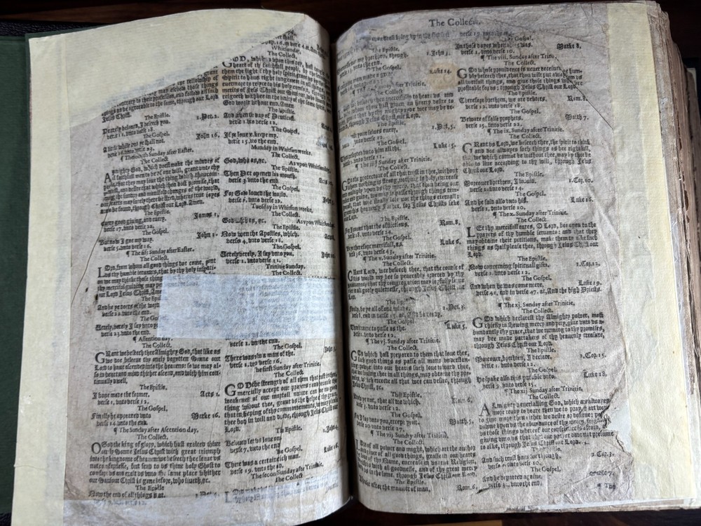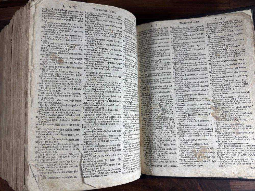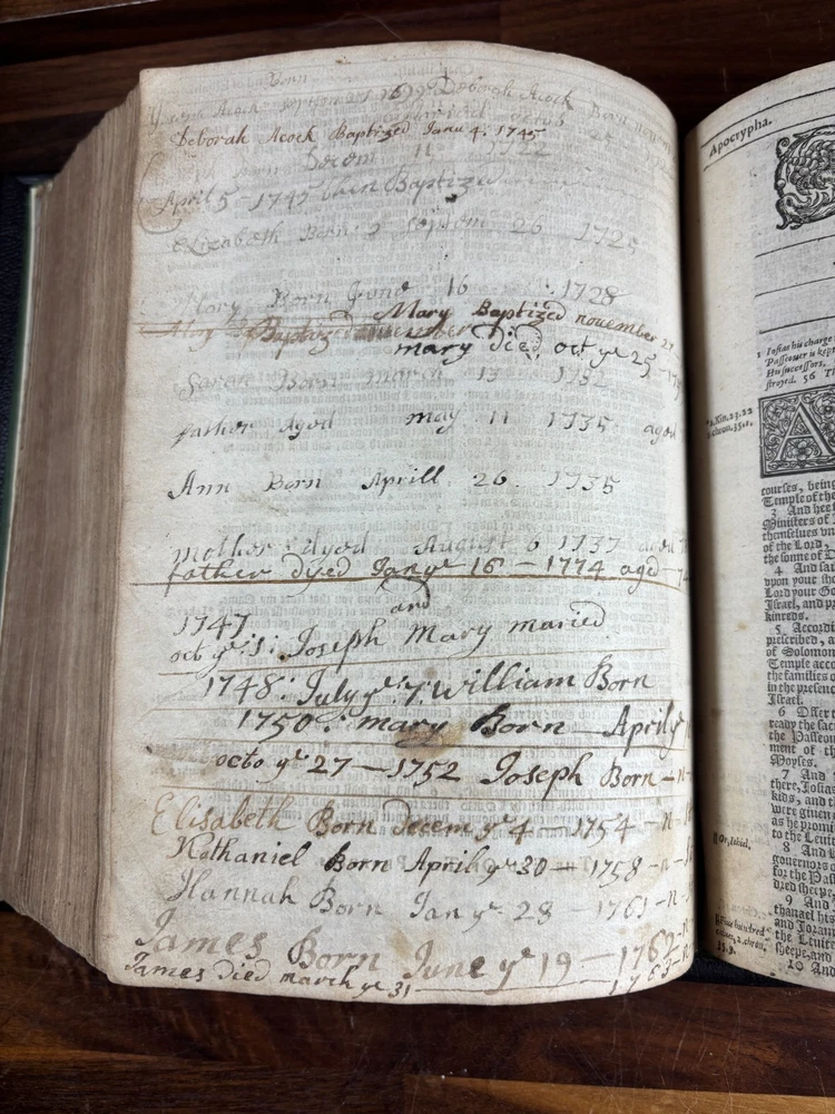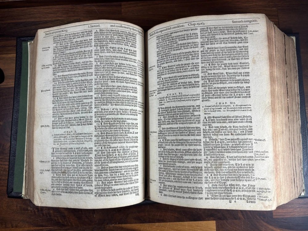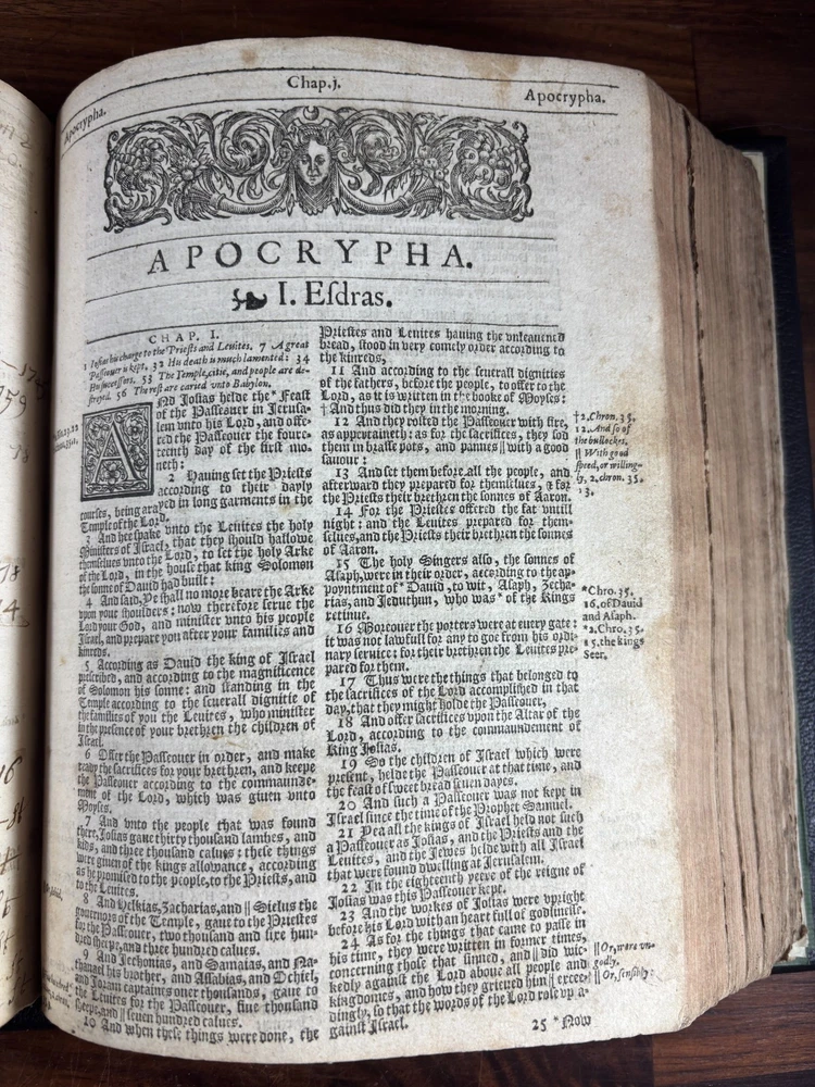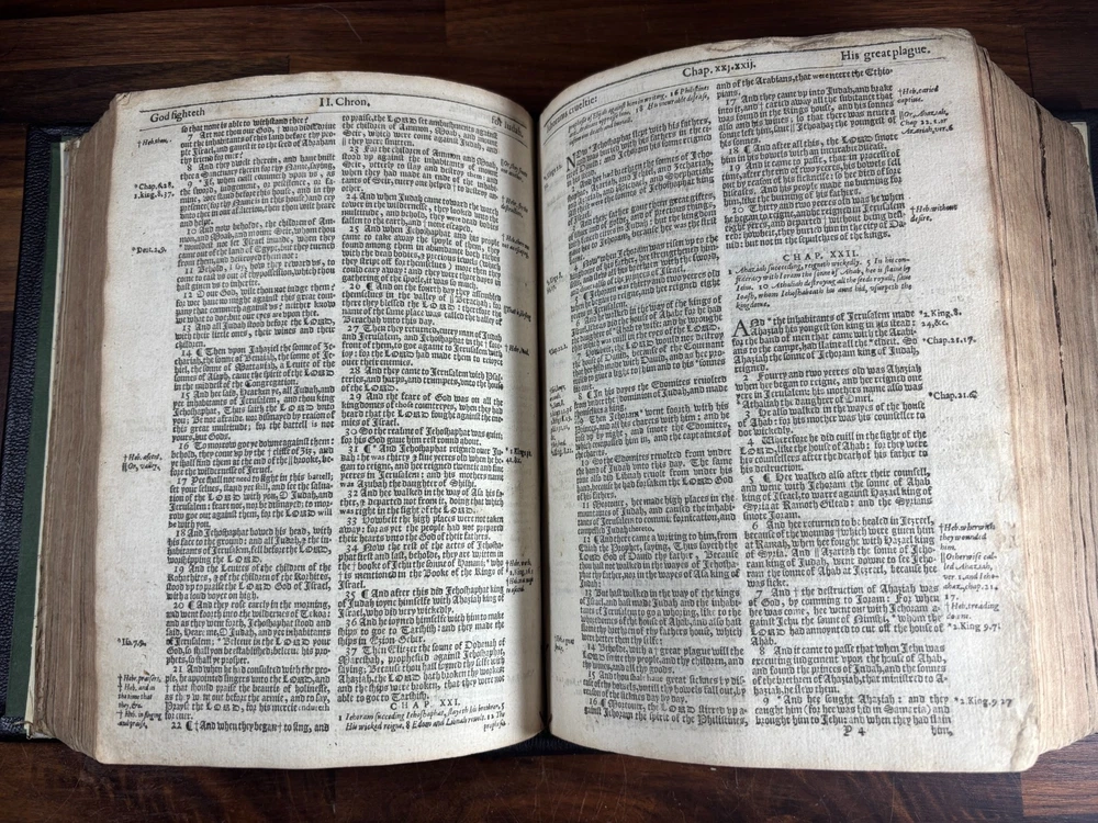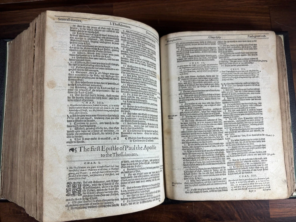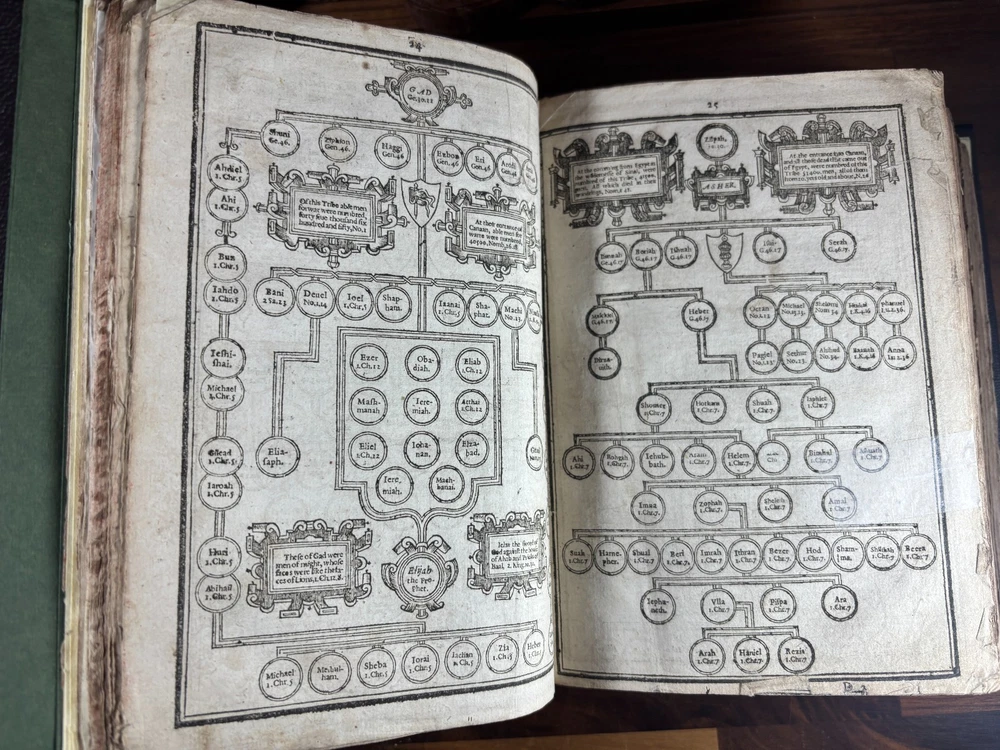 An early quarto printing of the King James Version of the Holy Bible , printed in London in 1614 by Robert Barker , the royal printer to King James I. This edition belongs to the early generation of King James Bibles printed just three years after the first edition of 1611 and represents one of the earliest widely circulated formats of the Authorized Version. The volume is printed in black-letter (Gothic) type in double columns , with extensive marginal references, genealogical tables, and a concordance. The New Testament concludes with the imprint: “Imprinted at London by Robert Barker, Printer to the Kings most excellent Majestie. Anno Dom. 1614. Cum Privilegio.” The book is bound in a later full leather binding with gilt spine title “Holy Bible 1614.” Several early manuscript family entries appear on the preliminary leaves, including genealogical records for the George and Knight families , with dates ranging from the early 18th to early 19th centuries. Bibliographic Details Title: The Holy Bible, Containing the Old Testament and the New Version: King James Version Printer: Robert Barker Place: London Date: 1614 Format: Quarto Typography: Black-letter with Roman marginal references Herbert 331 Features include: Decorative genealogical tables of biblical families Extensive marginal cross-references Concordance / topical index at rear Decorative woodcut ornaments and initials New Testament ending with the 1614 Barker imprint Historical Background The King James Bible , first published in 1611, was commissioned by James VI and I following the Hampton Court Conference , where Puritan leaders requested a new English translation of the Bible. The translation was undertaken by approximately 50 scholars divided into six companies , working at Oxford, Cambridge, and Westminster. Their work drew on earlier English translations such as the Bishops' Bible , the Geneva Bible , and the pioneering work of William Tyndale . Once completed, the Bible was printed by the King’s Printer, Robert Barker , beginning in 1611. Early printings appeared in several formats, including large folios intended for churches and smaller quarto and octavo editions for personal use . The 1614 printing represented part of the rapid spread of the new translation throughout England. These early quarto editions were among the first affordable versions accessible to private households and contributed greatly to the establishment of the King James Version as the dominant English Bible. Over the centuries, the King James Bible became the most influential English translation of scripture, shaping the language, literature, and religious life of the English-speaking world. Transcription: Ownership / Gift Inscription “Rhoda George My mother’s 1st House Her Book Given her by her Grandfather June 10th 1804” “16 Kt.” Ownership Inscription “Charles Hawken Died May ye 15 – 1709” Family Record Page “Rhoda George Born February 19th 1705 And Baptized May 18th at Worcester.” Marriage Entry “William Knight & Rhoda George at Bensworth May 28 1817” Children of William Knight & Rhoda George “Anna Knight Daughter of Wm. Knight Born April the 22d 1818 Died March 22d 1849” “Eliza Knight Born August 12th 1819” “Sarah Knight Born Decb 16th 1820” “James George Knight Born February 10th 1822” “Joseph Knight Born Decb 24th 1824” “Elizabeth Knight Born December 6th 1824 Died May 12th 1847” “Samuel Knight Born April 16th 1826 Died [not sure]” Condition Later full leather rebinding , spine titled in gilt Old Testament title page not present Age toning, foxing and staining throughout Some repaired or reinforced leaves especially at the beginning Genealogical tables present New Testament imprint page dated 1614 present Concordance section present Early manuscript genealogical entries on preliminary leaves Overall a complete early King James Bible textually, though lacking the Old Testament title page and rebound in later leather . Significance Early printings of the King James Bible remain highly collectible due to their historical importance in the development of the English language and Protestant Christianity. This 1614 edition represents: One of the earliest printings after the 1611 first edition A product of the royal printing house of Robert Barker A family Bible used across multiple generations Such early KJV printings are increasingly scarce, particularly in intact quarto format. Dimensions: Weight - 1.9kg Height - 22.5cm Width - 18.5cm Thickness - 8cm