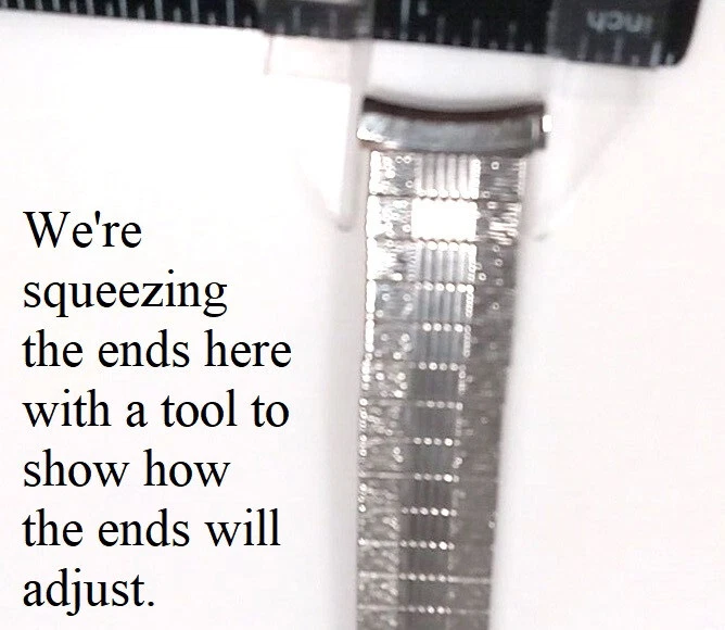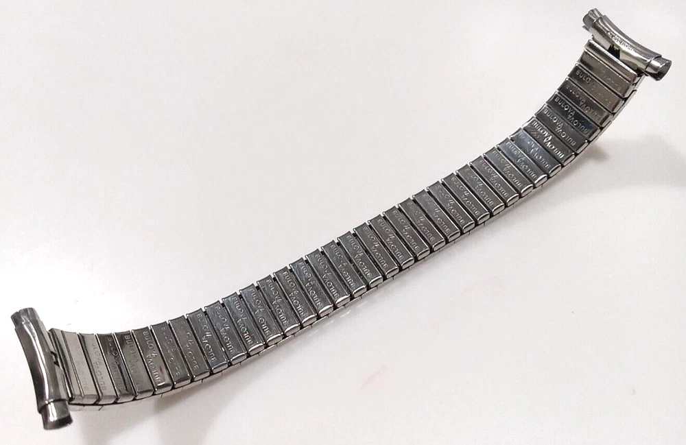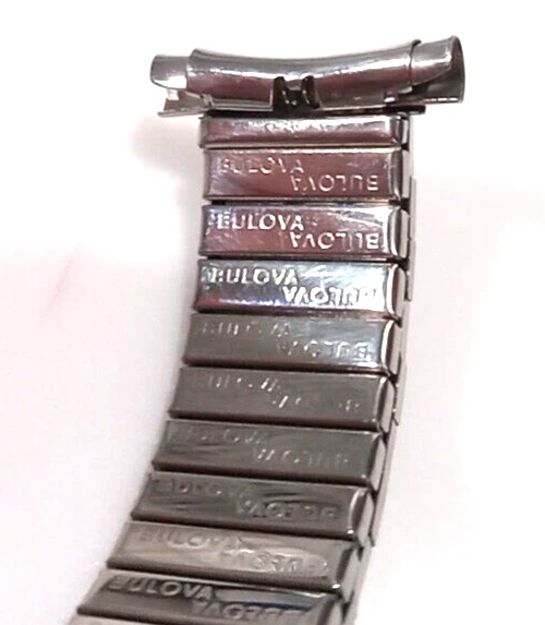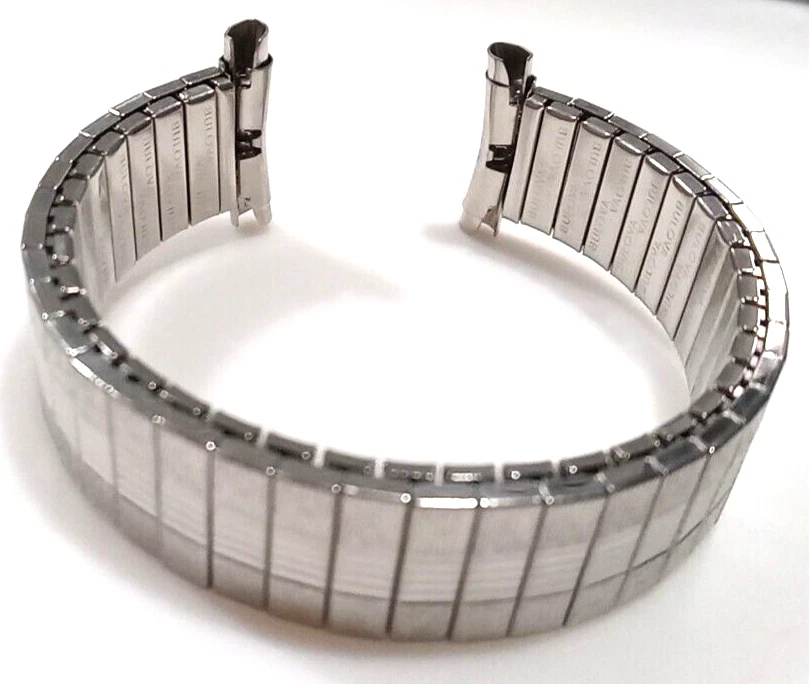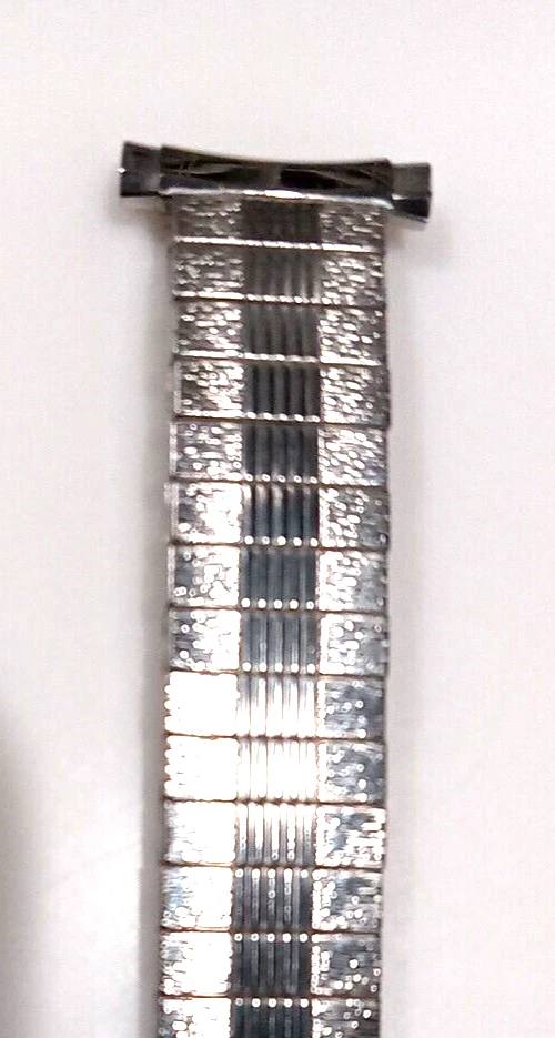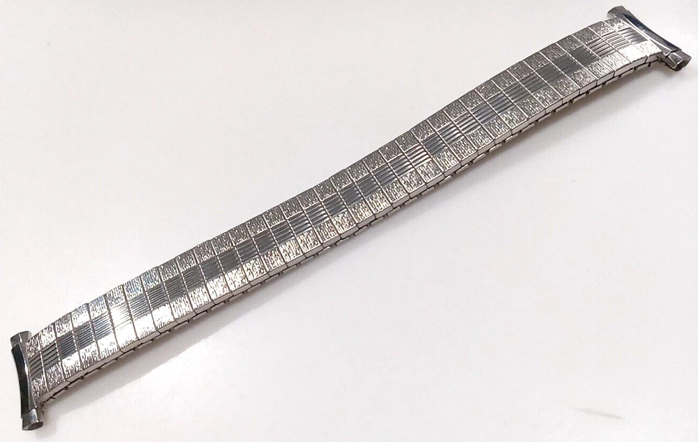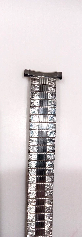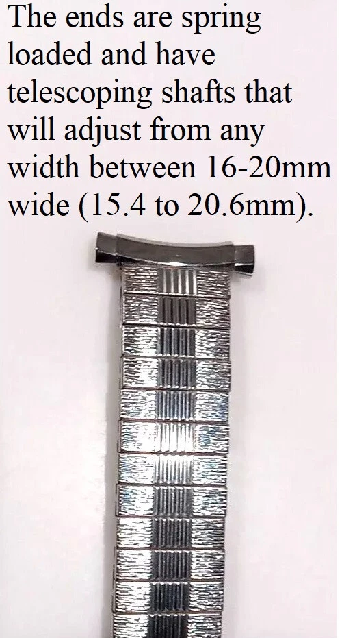 Fits any 16, 17, 18, 19 or 20mm ends (15.4 to 20.6mm) Ends are spring loaded and have telescoping shafts that will adjust from 16-20mm Vintage new old stock. Factory mint new. Length is 6" (153 mm) regular length. Approximately medium stretch for a little more length. Spring bars inc luded Slim band (about 1/8" thick) Free shipping in the U.S. by First Class Mail. I nternational purchases outside the USA are shipped via First Class International mail. How to Make Sure You're Buying the Right Watch Band Size Sometimes the correct size is printed or marked on the back of your old strap, but if it's not there you can measure it yourself. Use a metric (mm) ruler and measure between the watch band "lugs." If you don't have a metric ruler, convert your English (Imperial) measurement below. Inches Millimeters 1 1/5" (1.18") 30mm 1 1/10" (1.10") 28mm 1" 26mm 15/16" 24mm 7/8" 22mm 13/16" 21mm 25/32" 20mm 3/4" 19mm 11/16" 18mm 21/32" 17mm 5/8" 16mm 19/32" 15mm 9/16" 14mm 1/2" 13mm 15/32" 12mm 7/16" 11mm 3/8" 10mm 11/32" 9mm 5/16" 8mm 1/4" 6mm Feedback from Our Watch Band Buyers: "Excellent service, recommended seller" "Super fast, nice watchband" "Good price...fast shipping..." "Great service" "Great seller, fast shipment" "Great transaction! Thank you! Great communication! Recommended! Fast shipping!" "Excellent product-quick shipping-reasonably priced-completely satisfied" "Great to deal with AAAAAAAAAAAAA+++++++++++++++" "Great item & price! Buy from this seller!! A+++" "Item as promised, fast shipper!" "The watch band arrived today. It looks great on my watch!! A++" "Excellent deal, A+++++" "Excellent seller. Highly recommended. Would like to do business again. Super A++" "Lightening quick delivery" "Just as described. Looks great." "SUPER QUICK, PROFESSIONAL TRANSACTION. THANKS!"
