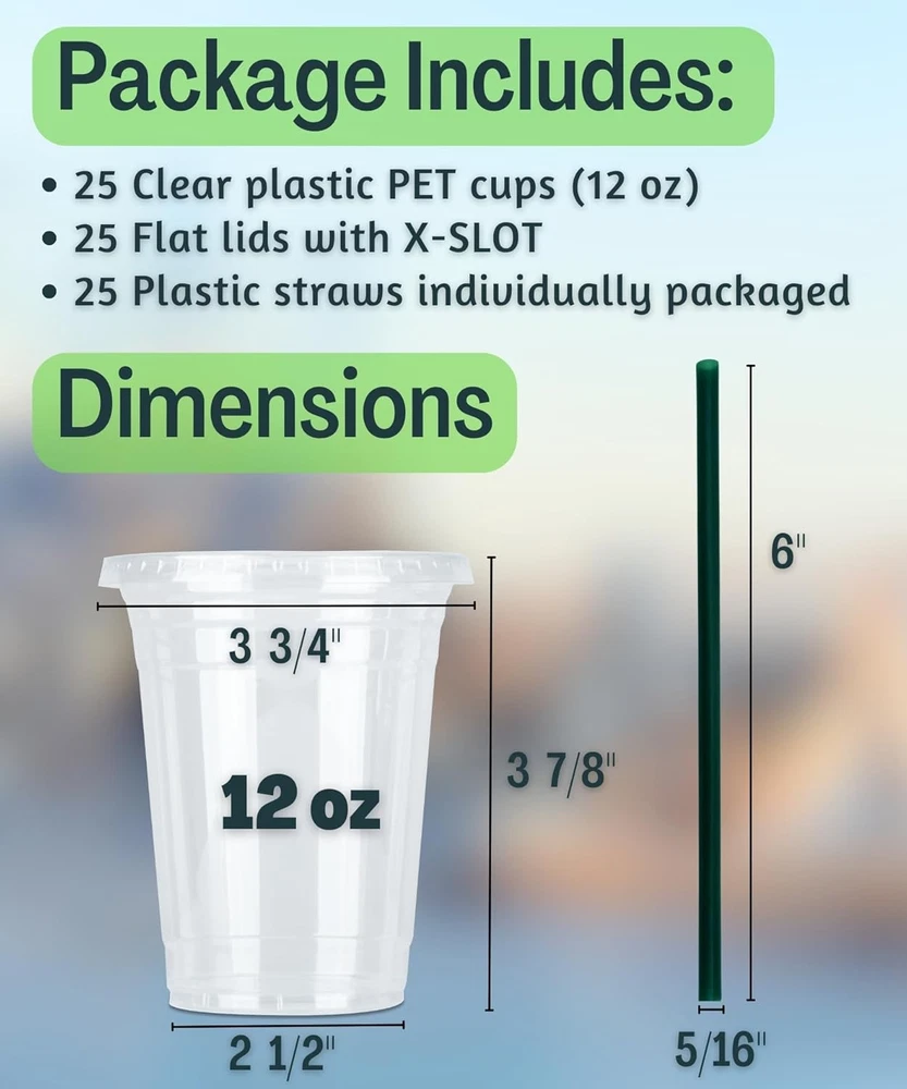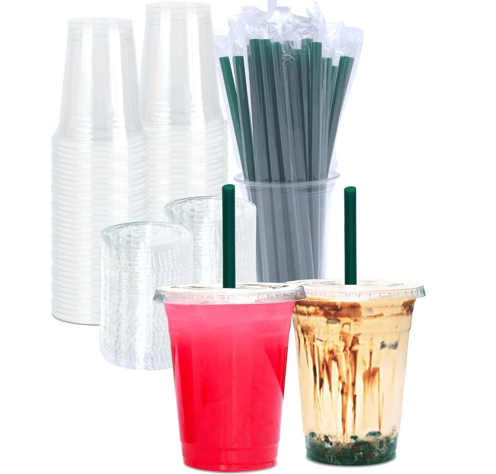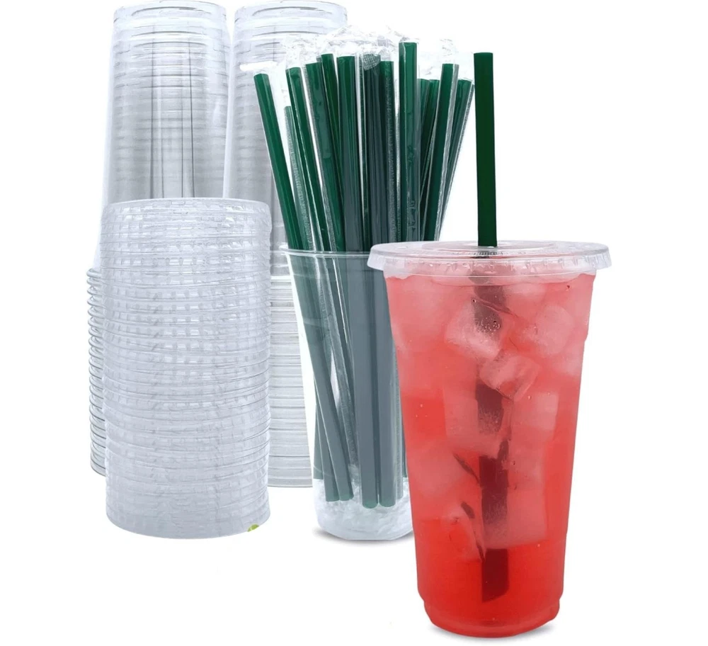 Great Value Pack of 25+25+25: The package includes 25 clear plastic cups, 25 flat lids with X-slot and 25 individually wrapped straws. The straws are included, and you don't need to buy it separately. Money Saver. Make your own drinks at home or your office, and you could save money buying coffee at coffee stands. The money you spent on these cups is what you would spend in 4 days buying coffee so definitely worth it. They're durable, sturdy and the lids fit very tightly. Save Time. Tired of washing cups after party? No mess, no spills. Try these plastic cups with lids and straws. Disposable cups mean you can carry a beverage everywhere. Multi-use for any occasions. Perfect for cold drinks such as Iced coffee, Iced tea, Lemonade, Bubble boba, Smoothies to go, Juice, Soda, Frozen cocktails, Beer, Lattes Slurpee, Water and more. Perfect for birthday parties, anniversaries, road trip, BBQ or any event. High Quality. Crystal clear PET plastic cold cups with lids and straws. Food safety plastic and BPA free. Perfect for cold drinks or food.