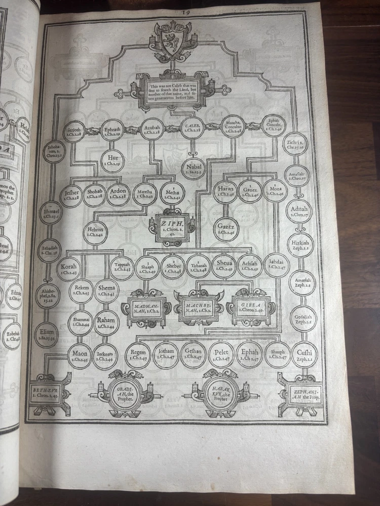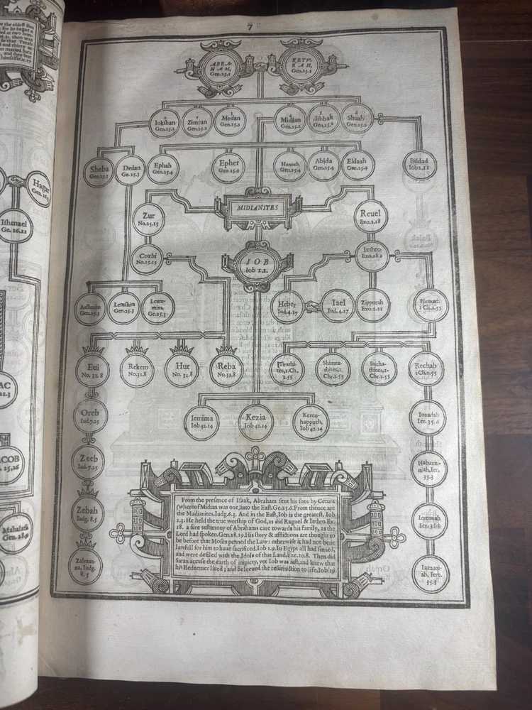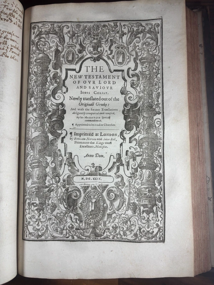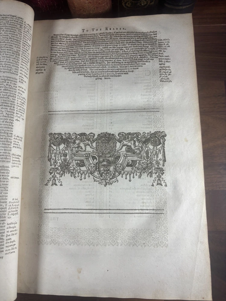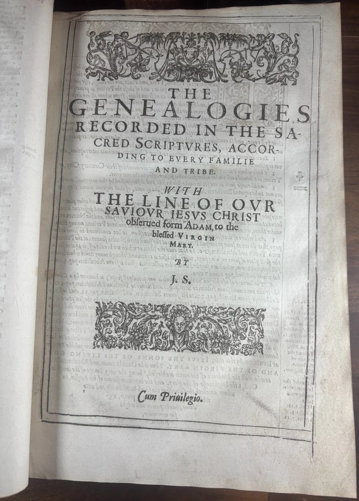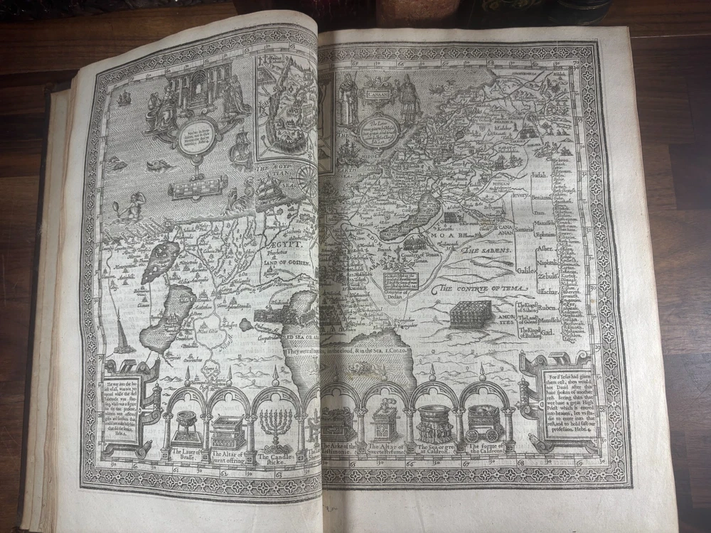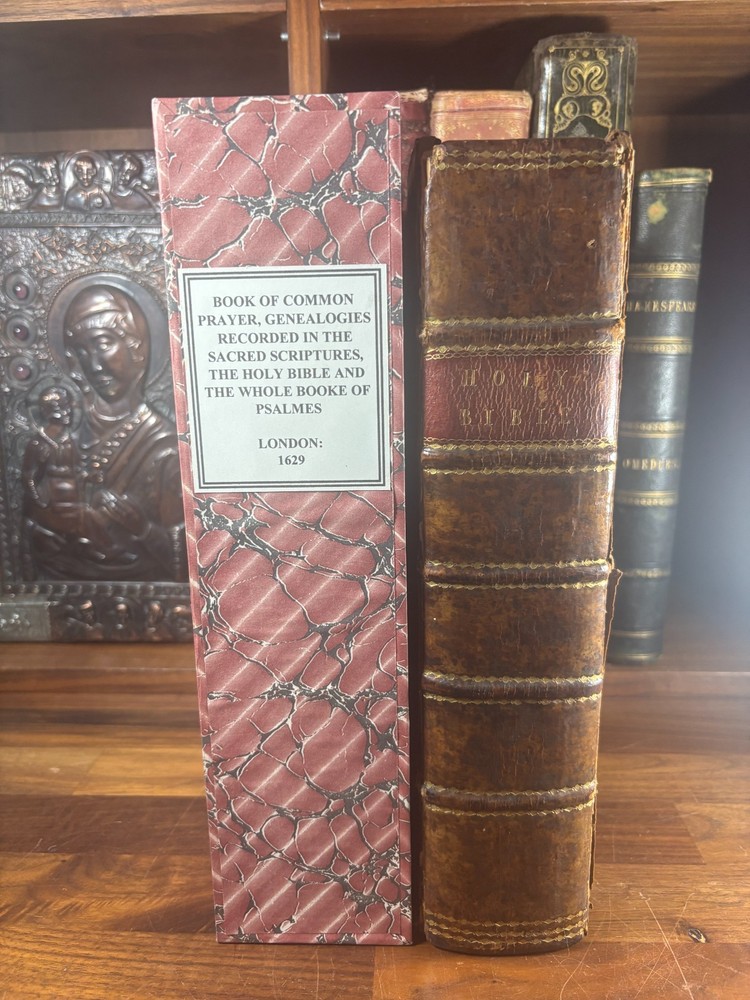 A substantial and desirable early folio King James Bible , printed in London in 1629 by Bonham Norton and John Bill , printers to the King’s Most Excellent Majesty. This edition represents one of the important early printings of the Authorized Version, produced less than two decades after the first edition of 1611. This copy is notable for retaining many of its original and often-missing components, including the John Speed genealogies , engraved scriptural tables , the double-page map of the Holy Land , the Apocrypha , and the metrical Psalms of Sternhold & Hopkins (dated 1629) . The volume is further enriched by extensive 19th-century manuscript family records , documenting multiple generations, primarily in London (Paddington, Notting Hill, Marylebone), adding historical and genealogical interest. Contents Old Testament (lacking general title, see condition) New Testament title dated 1629 “The Genealogies Recorded in the Sacred Scriptures” by J. S. (John Speed), with full-page engraved tables Double-page engraved map of the Holy Land / Exodus route Apocrypha The Whole Book of Psalmes “To the Reader” and other preliminaries Historical Context First published in 1611, the King James Bible (Authorized Version) quickly became the standard English Bible and one of the most influential books in the history of the English language. Early folio editions such as this 1629 printing were large-format books intended for church lecterns and serious household use. This edition was printed by Bonham Norton and John Bill , royal printers responsible for many early 17th-century Bible editions. The inclusion of the John Speed genealogies, elaborate engraved charts tracing biblical lineages from Adam through Christ, reflects the period’s deep interest in biblical history and visual learning. The presence of the Sternhold & Hopkins Psalms indicates the book’s dual function as both scripture and liturgical companion, as these metrical psalms were widely used in Anglican worship. Condition Folio volume Text generally clean and legible , with expected age toning and scattered staining Engraved genealogies and double-page map present Apocrypha present Psalms (1629) present New Testament title page present (dated 1629) Defects / notes: Lacking the general Old Testament title page Some edge wear, minor damp staining, and age-related marks throughout Binding shows wear consistent with age Manuscript entries (19th century) to several leaves No full collation performed; sold as seen Some leaves have tears and are missing portions of the page. Provenance Contains extensive handwritten family records (19th century) , including births, marriages, and deaths associated with families in London (Paddington, Notting Hill, Marylebone) . These entries provide a valuable genealogical record and add to the historical character of the volume. FULL TRANSCRIPTION OF HANDWRITTEN ENTRIES: Primary Family Record Page Richard, son of Richard & Sarah Curtis Tilmon (see entry at the end of this book) married Mary Anne Thousand daughter of Thomas & Jane his wife the 16th October 1846 at St Mary lebone London had issue Children of Richard Tilmon & Mary Anne Richard born 13th February 1848 christened at the District Church of All Saints Paddington the 16th March – died the 31st July 1848 buried at Kensal Green Cemetery Sarah Jane born 3rd September 1849 christened at All Saints Paddington. Sponsors Mr & Mrs Geo Dawes, Mrs John Tanqueray – married August 6th [year unclear] Mr C. W. [surname unclear] Marian born 28th December 1850 christened at All Saints Paddington. Sponsors Mrs Jones, Mrs M. A. Wetherington Frances Emily born 14 March 1852 christened as above Sponsors The Rev. Wm Clarke & Miss Newton She married her cousin William [surname unclear] and died at Suez January 10th 1882 has issue William & Hilda Emmy Richard born 2nd November 1853 christened at St John’s Church Notting Hill. Kensington [?] Sponsors Capt. [name unclear], Mrs Amos & George Dawes married Mabel daughter of Francis Ann Curtis Fleetwood born 13th September 1855 christened at St John’s Notting Hill Sponsors F. C. Tilmon & R. T. C. Tilmon Elizabeth Jones William Pomfret born 30 May 1857 christened at St Peters Notting Hill Sponsors Mrs Eaton, R. C. Pomfret Esq Mrs C. Tilmon – married Agnes Dawes Herbert at Dulwich Edgar Croughton born 25 Feby 1859 christened at St Peters Notting Hill Sponsors Mr & Mrs F. C. Tilmon & George Dawes Related Family Entries (preceding generation) Fred born 16th July 1813 christened William George & Maria his wife married at St Marylebone Church June 21st 1841 Mary Ann born 27th Nov 1815 married Richard Tilmon 16th Oct 1846 at St Marylebone Hortense born 24th March 1817 christened 31 Dec 1817 Sponsors Mrs St John [?] & Jane Shaw married Henry Gough 10 Sept at St Pancras Church 1829 Mary Ann born 23rd Nov 1821 married Richard Tilmon 16 Oct 1846 at St Marylebone Church George Frederick born Sept 1828 married Sarah [surname unclear] Long, daughter of George Long Blackheath March 1837 Additional Family Entries (another page) Thomas Pomfret born Feb 26, 1824 A son in 1824 Thomas R. Pomfret Esq of St John’s Wood, Marylebone James born 11 October 1822 christened at St Marylebone Church January 15th 1823 Sponsors Mrs [unclear] & [unclear] Thomas died 9th December 1823 Mary Anne born April 1820 married Richard Tilmon October 16th 1846 at St Marylebone Robert Croughton born 31 May 1831 married Sarah [surname unclear] Issue George & Mary Format Small folio Double-column format Summary An attractive and substantial early 1629 folio King James Bible , retaining many of its most desirable and often-lacking components, including the Speed genealogies, engraved map, Apocrypha, and Psalms . Despite the absence of the Old Testament title page, this remains a highly collectible example of an important early Authorized Version, enhanced by period manuscript entries and strong visual appeal. Dimensions (With Slipcase): Weight - 3.42K