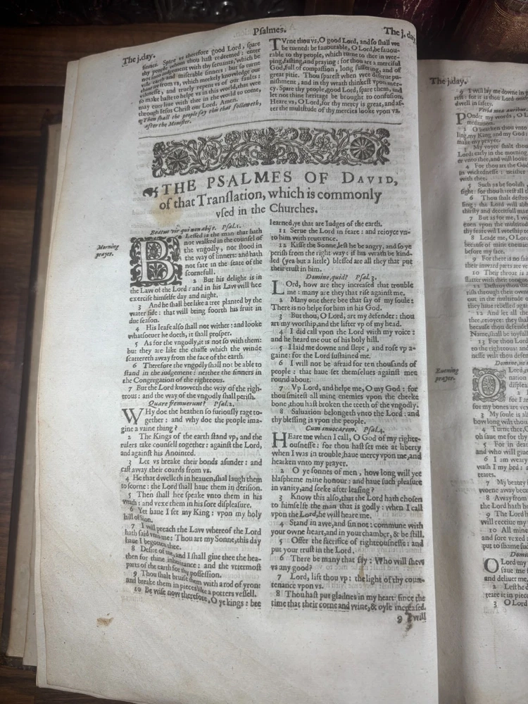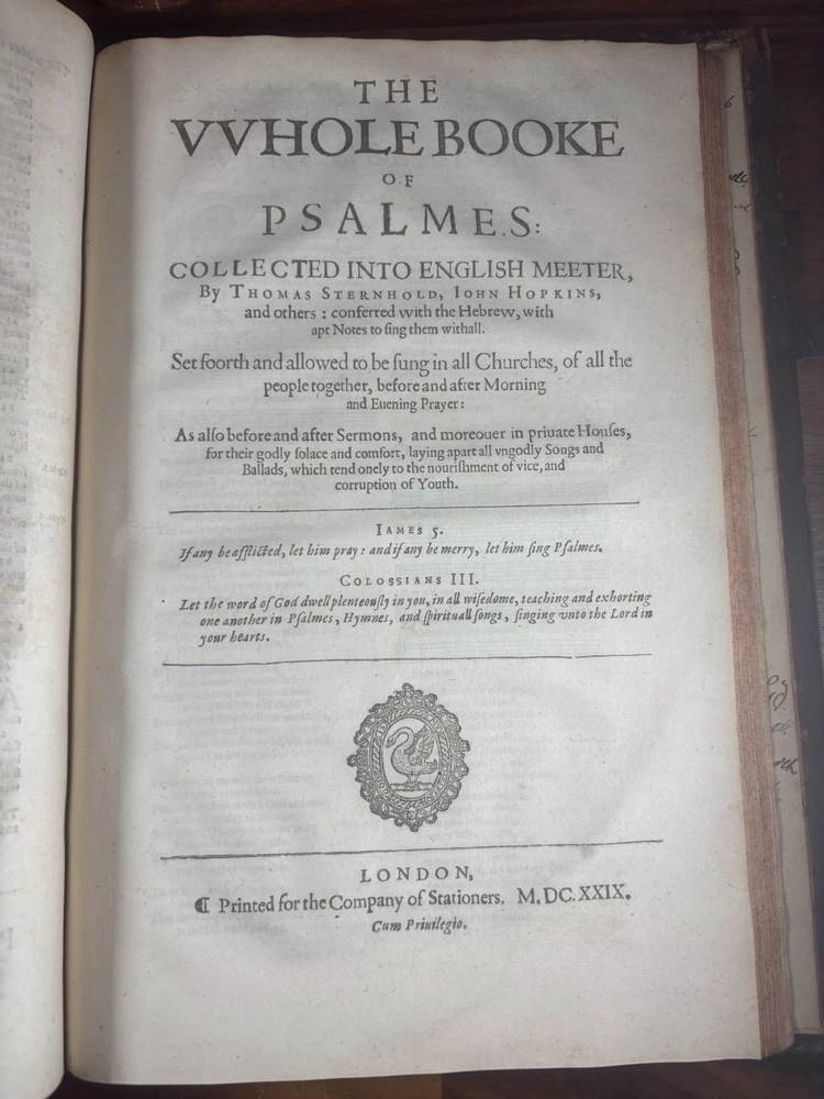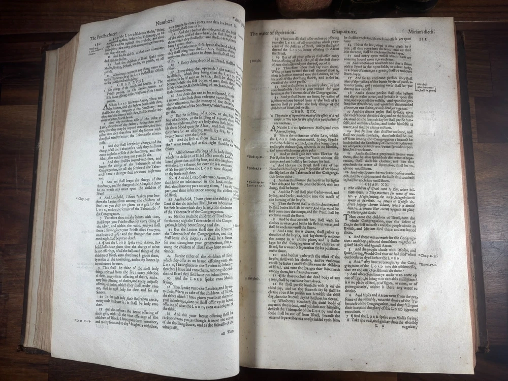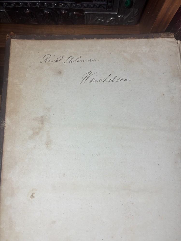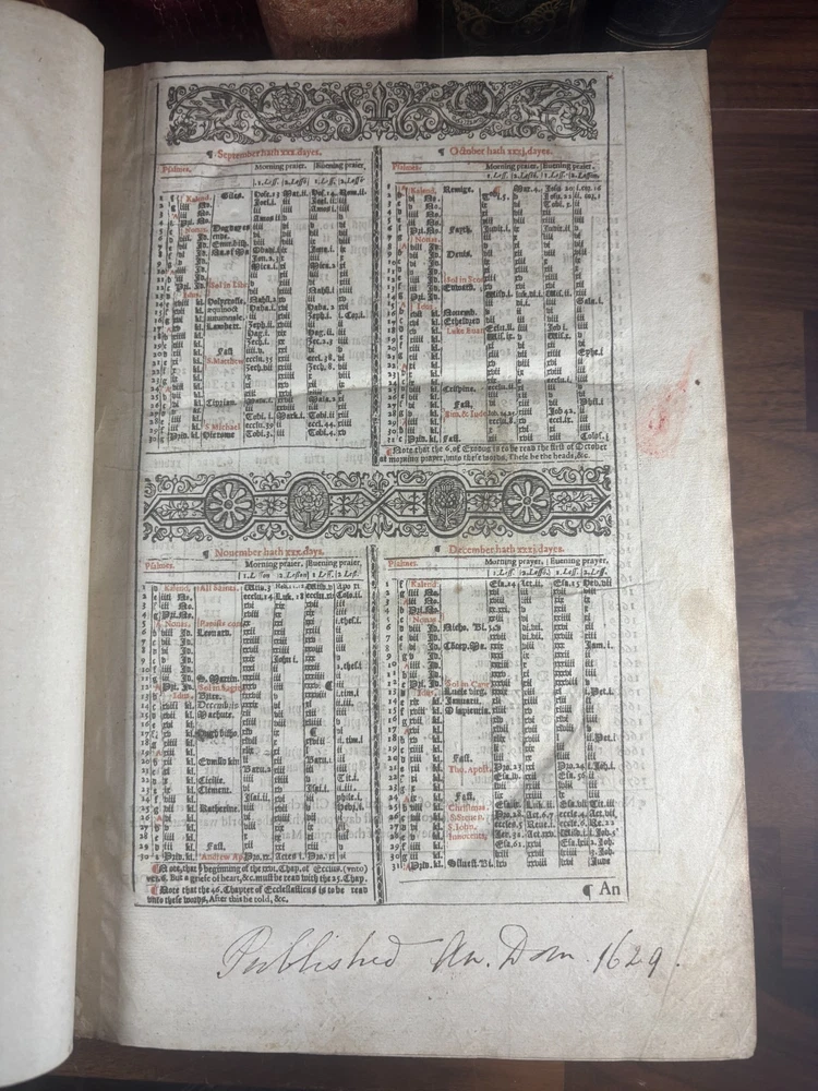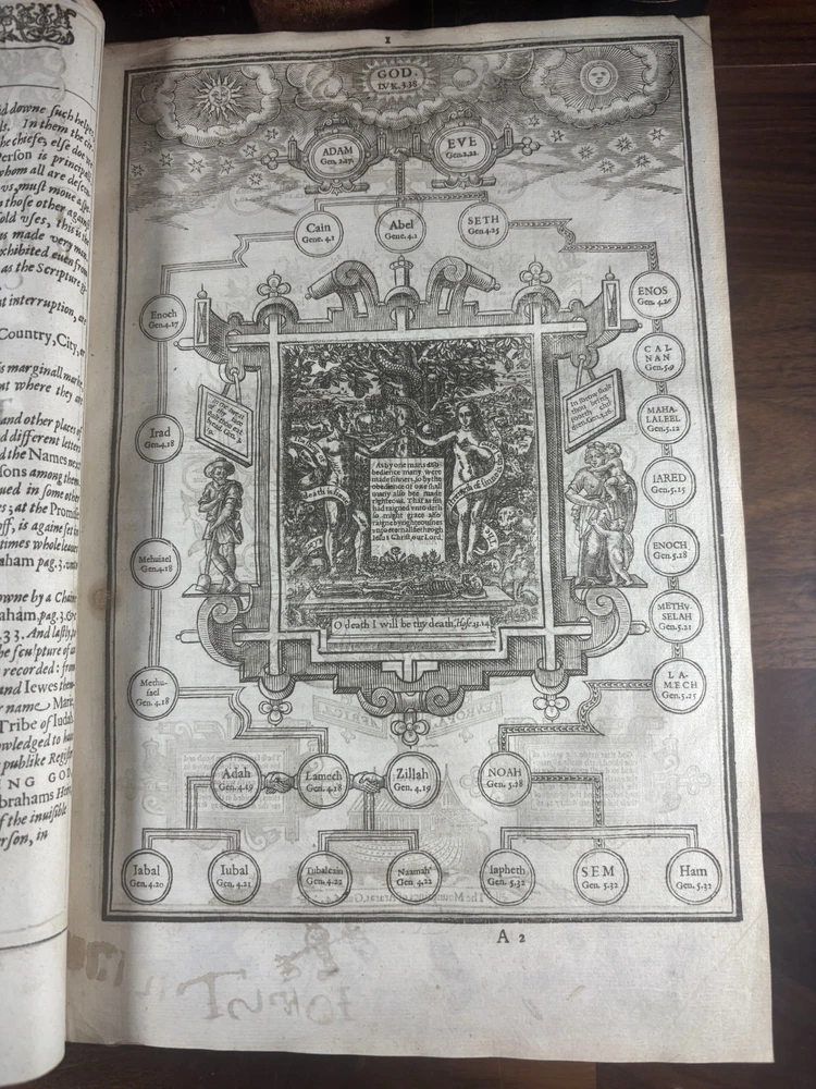 A substantial and desirable early folio King James Bible , printed in London in 1629 by Bonham Norton and John Bill , printers to the King’s Most Excellent Majesty. This edition represents one of the important early printings of the Authorized Version, produced less than two decades after the first edition of 1611. This copy is notable for retaining many of its original and often-missing components, including the John Speed genealogies , engraved scriptural tables , the double-page map of the Holy Land , the Apocrypha , and the metrical Psalms of Sternhold & Hopkins (dated 1629) . The volume is further enriched by extensive 19th-century manuscript family records , documenting multiple generations, primarily in London (Paddington, Notting Hill, Marylebone), adding historical and genealogical interest. Contents Old Testament (lacking general title, see condition) New Testament title dated 1629 “The Genealogies Recorded in the Sacred Scriptures” by J. S. (John Speed), with full-page engraved tables Double-page engraved map of the Holy Land / Exodus route Apocrypha The Whole Book of Psalmes “To the Reader” and other preliminaries Historical Context First published in 1611, the King James Bible (Authorized Version) quickly became the standard English Bible and one of the most influential books in the history of the English language. Early folio editions such as this 1629 printing were large-format books intended for church lecterns and serious household use. This edition was printed by Bonham Norton and John Bill , royal printers responsible for many early 17th-century Bible editions. The inclusion of the John Speed genealogies, elaborate engraved charts tracing biblical lineages from Adam through Christ, reflects the period’s deep interest in biblical history and visual learning. The presence of the Sternhold & Hopkins Psalms indicates the book’s dual function as both scripture and liturgical companion, as these metrical psalms were widely used in Anglican worship. Condition Folio volume Text generally clean and legible , with expected age toning and scattered staining Engraved genealogies and double-page map present Apocrypha present Psalms (1629) present New Testament title page present (dated 1629) Defects / notes: Lacking the general Old Testament title page Some edge wear, minor damp staining, and age-related marks throughout Binding shows wear consistent with age Manuscript entries (19th century) to several leaves No full collation performed; sold as seen Some leaves have tears and are missing portions of the page. Provenance Contains extensive handwritten family records (19th century) , including births, marriages, and deaths associated with families in London (Paddington, Notting Hill, Marylebone) . These entries provide a valuable genealogical record and add to the historical character of the volume. FULL TRANSCRIPTION OF HANDWRITTEN ENTRIES: Primary Family Record Page Richard, son of Richard & Sarah Curtis Tilmon (see entry at the end of this book) married Mary Anne Thousand daughter of Thomas & Jane his wife the 16th October 1846 at St Mary lebone London had issue Children of Richard Tilmon & Mary Anne Richard born 13th February 1848 christened at the District Church of All Saints Paddington the 16th March – died the 31st July 1848 buried at Kensal Green Cemetery Sarah Jane born 3rd September 1849 christened at All Saints Paddington. Sponsors Mr & Mrs Geo Dawes, Mrs John Tanqueray – married August 6th [year unclear] Mr C. W. [surname unclear] Marian born 28th December 1850 christened at All Saints Paddington. Sponsors Mrs Jones, Mrs M. A. Wetherington Frances Emily born 14 March 1852 christened as above Sponsors The Rev. Wm Clarke & Miss Newton She married her cousin William [surname unclear] and died at Suez January 10th 1882 has issue William & Hilda Emmy Richard born 2nd November 1853 christened at St John’s Church Notting Hill. Kensington [?] Sponsors Capt. [name unclear], Mrs Amos & George Dawes married Mabel daughter of Francis Ann Curtis Fleetwood born 13th September 1855 christened at St John’s Notting Hill Sponsors F. C. Tilmon & R. T. C. Tilmon Elizabeth Jones William Pomfret born 30 May 1857 christened at St Peters Notting Hill Sponsors Mrs Eaton, R. C. Pomfret Esq Mrs C. Tilmon – married Agnes Dawes Herbert at Dulwich Edgar Croughton born 25 Feby 1859 christened at St Peters Notting Hill Sponsors Mr & Mrs F. C. Tilmon & George Dawes Related Family Entries (preceding generation) Fred born 16th July 1813 christened William George & Maria his wife married at St Marylebone Church June 21st 1841 Mary Ann born 27th Nov 1815 married Richard Tilmon 16th Oct 1846 at St Marylebone Hortense born 24th March 1817 christened 31 Dec 1817 Sponsors Mrs St John [?] & Jane Shaw married Henry Gough 10 Sept at St Pancras Church 1829 Mary Ann born 23rd Nov 1821 married Richard Tilmon 16 Oct 1846 at St Marylebone Church George Frederick born Sept 1828 married Sarah [surname unclear] Long, daughter of George Long Blackheath March 1837 Additional Family Entries (another page) Thomas Pomfret born Feb 26, 1824 A son in 1824 Thomas R. Pomfret Esq of St John’s Wood, Marylebone James born 11 October 1822 christened at St Marylebone Church January 15th 1823 Sponsors Mrs [unclear] & [unclear] Thomas died 9th December 1823 Mary Anne born April 1820 married Richard Tilmon October 16th 1846 at St Marylebone Robert Croughton born 31 May 1831 married Sarah [surname unclear] Issue George & Mary Format Small folio Double-column format Summary An attractive and substantial early 1629 folio King James Bible , retaining many of its most desirable and often-lacking components, including the Speed genealogies, engraved map, Apocrypha, and Psalms . Despite the absence of the Old Testament title page, this remains a highly collectible example of an important early Authorized Version, enhanced by period manuscript entries and strong visual appeal. Dimensions (With Slipcase): Weight - 3.42K