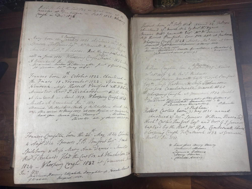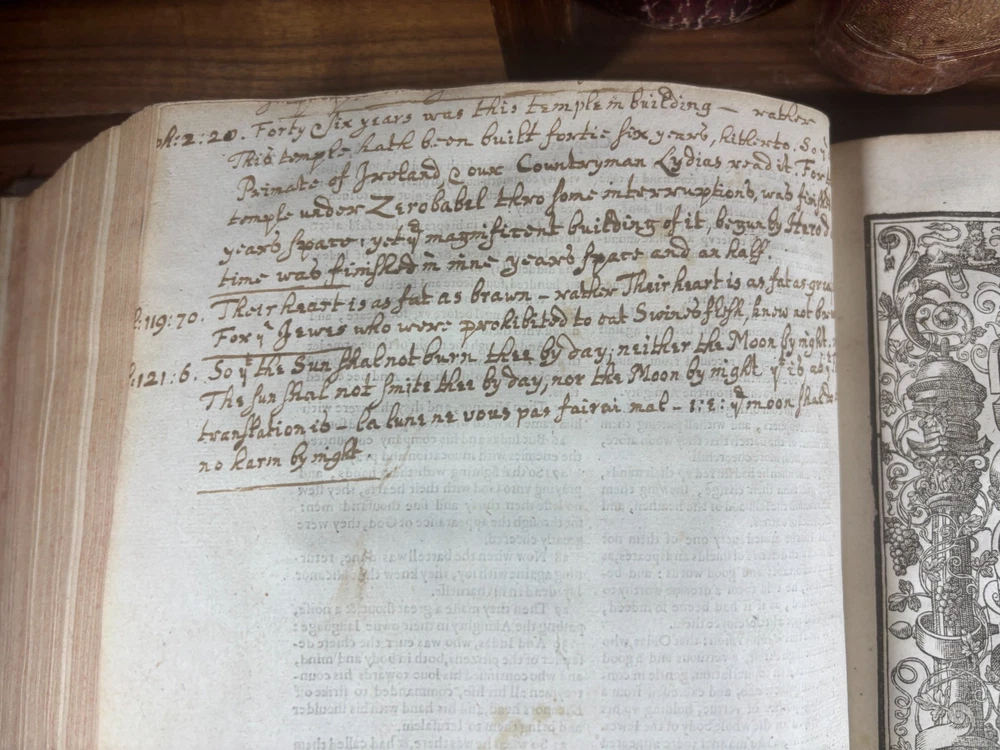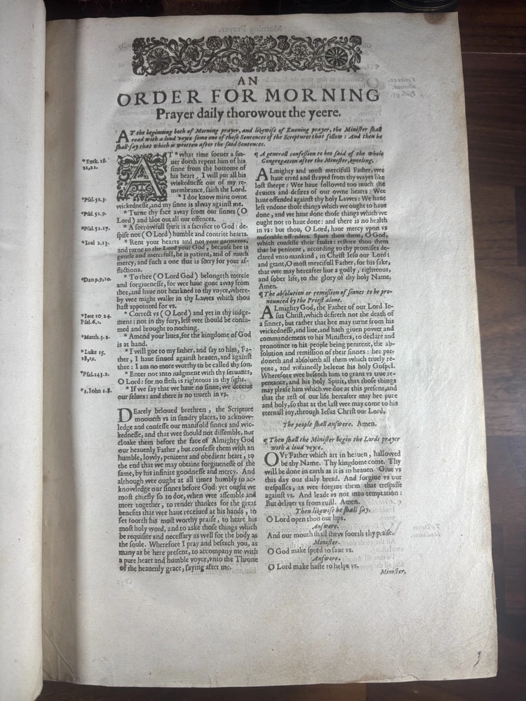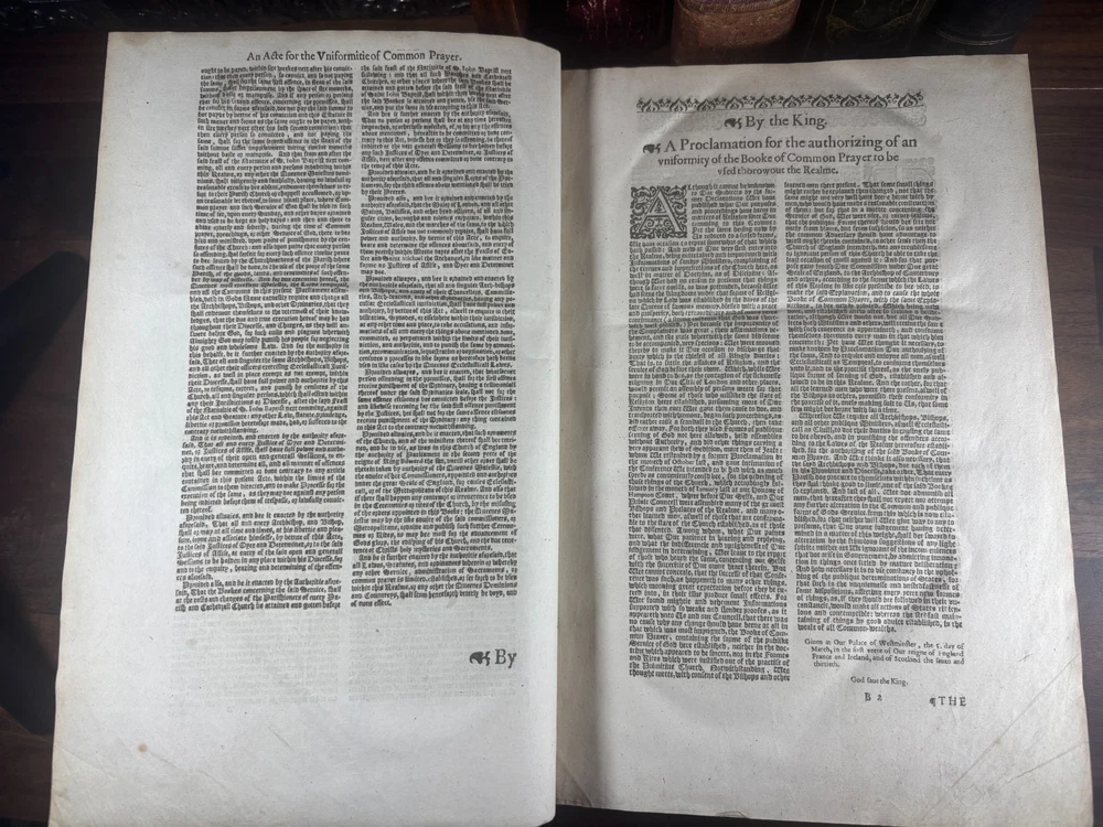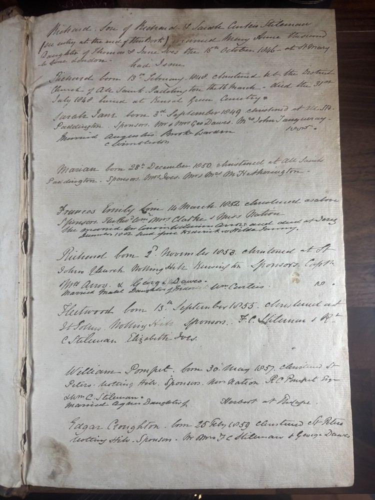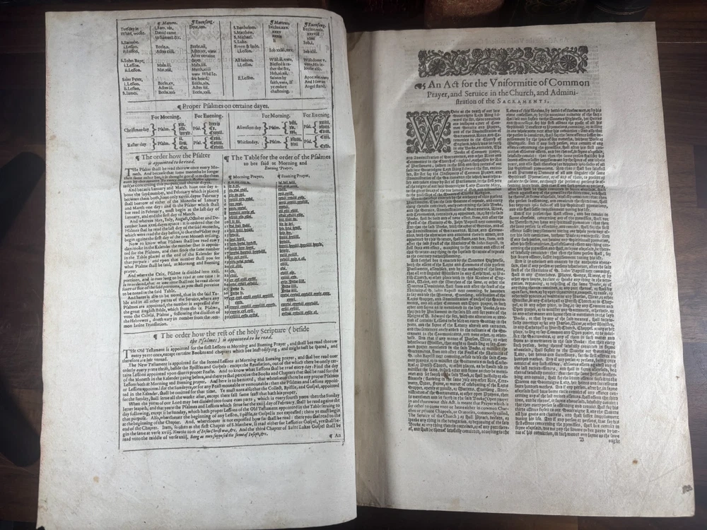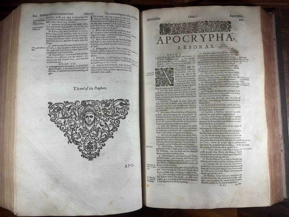 A substantial and desirable early folio King James Bible , printed in London in 1629 by Bonham Norton and John Bill , printers to the King’s Most Excellent Majesty. This edition represents one of the important early printings of the Authorized Version, produced less than two decades after the first edition of 1611. This copy is notable for retaining many of its original and often-missing components, including the John Speed genealogies , engraved scriptural tables , the double-page map of the Holy Land , the Apocrypha , and the metrical Psalms of Sternhold & Hopkins (dated 1629) . The volume is further enriched by extensive 19th-century manuscript family records , documenting multiple generations, primarily in London (Paddington, Notting Hill, Marylebone), adding historical and genealogical interest. Contents Old Testament (lacking general title, see condition) New Testament title dated 1629 “The Genealogies Recorded in the Sacred Scriptures” by J. S. (John Speed), with full-page engraved tables Double-page engraved map of the Holy Land / Exodus route Apocrypha The Whole Book of Psalmes “To the Reader” and other preliminaries Historical Context First published in 1611, the King James Bible (Authorized Version) quickly became the standard English Bible and one of the most influential books in the history of the English language. Early folio editions such as this 1629 printing were large-format books intended for church lecterns and serious household use. This edition was printed by Bonham Norton and John Bill , royal printers responsible for many early 17th-century Bible editions. The inclusion of the John Speed genealogies, elaborate engraved charts tracing biblical lineages from Adam through Christ, reflects the period’s deep interest in biblical history and visual learning. The presence of the Sternhold & Hopkins Psalms indicates the book’s dual function as both scripture and liturgical companion, as these metrical psalms were widely used in Anglican worship. Condition Folio volume Text generally clean and legible , with expected age toning and scattered staining Engraved genealogies and double-page map present Apocrypha present Psalms (1629) present New Testament title page present (dated 1629) Defects / notes: Lacking the general Old Testament title page Some edge wear, minor damp staining, and age-related marks throughout Binding shows wear consistent with age Manuscript entries (19th century) to several leaves No full collation performed; sold as seen Some leaves have tears and are missing portions of the page. Provenance Contains extensive handwritten family records (19th century) , including births, marriages, and deaths associated with families in London (Paddington, Notting Hill, Marylebone) . These entries provide a valuable genealogical record and add to the historical character of the volume. FULL TRANSCRIPTION OF HANDWRITTEN ENTRIES: Primary Family Record Page Richard, son of Richard & Sarah Curtis Tilmon (see entry at the end of this book) married Mary Anne Thousand daughter of Thomas & Jane his wife the 16th October 1846 at St Mary lebone London had issue Children of Richard Tilmon & Mary Anne Richard born 13th February 1848 christened at the District Church of All Saints Paddington the 16th March – died the 31st July 1848 buried at Kensal Green Cemetery Sarah Jane born 3rd September 1849 christened at All Saints Paddington. Sponsors Mr & Mrs Geo Dawes, Mrs John Tanqueray – married August 6th [year unclear] Mr C. W. [surname unclear] Marian born 28th December 1850 christened at All Saints Paddington. Sponsors Mrs Jones, Mrs M. A. Wetherington Frances Emily born 14 March 1852 christened as above Sponsors The Rev. Wm Clarke & Miss Newton She married her cousin William [surname unclear] and died at Suez January 10th 1882 has issue William & Hilda Emmy Richard born 2nd November 1853 christened at St John’s Church Notting Hill. Kensington [?] Sponsors Capt. [name unclear], Mrs Amos & George Dawes married Mabel daughter of Francis Ann Curtis Fleetwood born 13th September 1855 christened at St John’s Notting Hill Sponsors F. C. Tilmon & R. T. C. Tilmon Elizabeth Jones William Pomfret born 30 May 1857 christened at St Peters Notting Hill Sponsors Mrs Eaton, R. C. Pomfret Esq Mrs C. Tilmon – married Agnes Dawes Herbert at Dulwich Edgar Croughton born 25 Feby 1859 christened at St Peters Notting Hill Sponsors Mr & Mrs F. C. Tilmon & George Dawes Related Family Entries (preceding generation) Fred born 16th July 1813 christened William George & Maria his wife married at St Marylebone Church June 21st 1841 Mary Ann born 27th Nov 1815 married Richard Tilmon 16th Oct 1846 at St Marylebone Hortense born 24th March 1817 christened 31 Dec 1817 Sponsors Mrs St John [?] & Jane Shaw married Henry Gough 10 Sept at St Pancras Church 1829 Mary Ann born 23rd Nov 1821 married Richard Tilmon 16 Oct 1846 at St Marylebone Church George Frederick born Sept 1828 married Sarah [surname unclear] Long, daughter of George Long Blackheath March 1837 Additional Family Entries (another page) Thomas Pomfret born Feb 26, 1824 A son in 1824 Thomas R. Pomfret Esq of St John’s Wood, Marylebone James born 11 October 1822 christened at St Marylebone Church January 15th 1823 Sponsors Mrs [unclear] & [unclear] Thomas died 9th December 1823 Mary Anne born April 1820 married Richard Tilmon October 16th 1846 at St Marylebone Robert Croughton born 31 May 1831 married Sarah [surname unclear] Issue George & Mary Format Small folio Double-column format Summary An attractive and substantial early 1629 folio King James Bible , retaining many of its most desirable and often-lacking components, including the Speed genealogies, engraved map, Apocrypha, and Psalms . Despite the absence of the Old Testament title page, this remains a highly collectible example of an important early Authorized Version, enhanced by period manuscript entries and strong visual appeal. Dimensions (With Slipcase): Weight - 3.42K