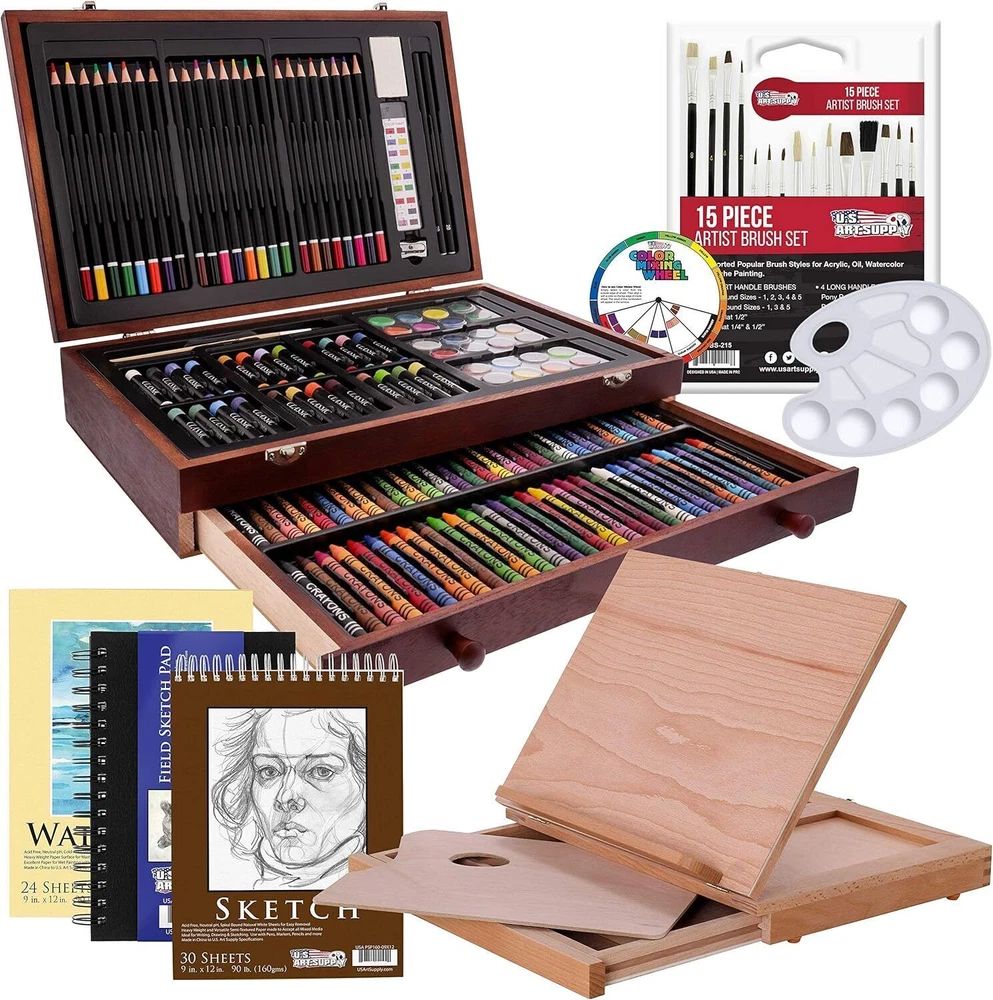 Product Dimensions 10.25"D x 11.7"W x 6"H Material Wood Style Compact About this item A complete premium quality professional 163-piece mega deluxe art creativity artist painting, sketching, and drawing set that contains everything an artist needs to create their masterpieces! Aspiring artists, art students, and professional artists love using this fun, safe, and easy-to-use art painting and drawing set! This set makes an excellent gift for birthdays and holidays. This set includes an incredible 142-piece art set in a wooden case and storage drawer containing 24 premium professional-grade watercolor paint color cakes, 3 mixing trays, 2 two camel hair brushes, 24 premium oil pastel colors, 24 premium colored pencils, 60 premium wax crayons, 2 - 2B graphite pencils, pencil sharpener, eraser, and a ruler. This unique creativity set also comes with 20 additional pieces; a 24 sheet 9" x 12" watercolor painting paper pad, a 30 sheet 9"x 12" premium sketch paper pad, an 80 sheet 5.5" x 8.5" premium hardbound field sketchbook, 15 premium paintbrushes, a plastic painting palette, and a double-sided color mixing wheel. Set also includes a professional Solana Beechwood solid tabletop desk easel that has a storage drawer with three compartments to organize paints, brushes, tools, and other essential art supplies. The easel can be adjusted to four different angle positions and accommodates canvas art and prints up to 11" by 14". Easel measures 13.25" wide by 10.25" deep by 2" high and adjusts to 11" high. The easel includes a wooden painting palette. Beginning artists will appreciate this supply-packed, comprehensive set. Whether working in colored pencil, oil pastel, watercolor, or with a traditional drawing pencil and crayon, everything you need is inclu ded. All the sets components are fully organized within the compartments of a beautiful wooden storage and carrying case. Color Black Product Dimensions 10.25"D x 11.7"W x 6"H Material Wood Style Compact Assembly Required No UPC 848849009934 Number of Items 163 Easel Type Single Mast Easel