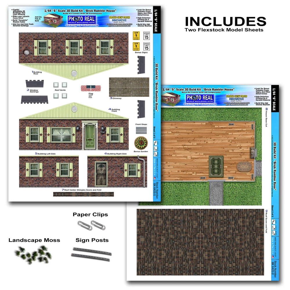 1/64 Scale Slot Car HO Red Brick Rambler Model Kit, BK 6421 Fits, Aurora, AFX Slot Car Racemasters Track These items are NOT made from plastic. They are made from Flexstock - A proprietary coated paper card stock material with detailed photo real HD printing and realistic scale elements. All kits need to be assembled with hot glue and take modeling skills and some patience to build. The results are amazing. No painting is required . - FAQs And Information On Photo Real Scale Building Model Kits - Special Features Of This Particular Kit : This Red Brick Rambles features: Detailed Photo Real base, roof vents, chimney, awnings, flags, and clump moss for shrubs and foliage. These Brick Ramblers can be connected end to end, adding as many as desired. -Materials Used: These items are NOT made from plastic! It is made from Flexistock, a proprietary card stock material on a mild luster finish with detailed photo real elements. -This Kit Used For: These detailed buildings are perfect for Hotwheels displays, Hotwheels dioramas, or Matchbox dioramas and are also are a perfect Slot car trackside accessory. They are make a great train track layouts, or scale model dioramas! Each Photo Real Scale Building Kit exhibits amazing detail with small realistic components such as doors, windows, roof vents, signs and other accessories that are included. These Kits offer additional realism with select interior details, and best yet require no messy painting or painting skill in order for them to look perfect. -Why Photo Real Brand Scale Building: There are many reasons people prefer our kits. One main reason is the level of realism without having to paint or be an expert modeler or painter to have a perfect finished kit. Also these kits won't break the bank when building a layout, you have better things to spend your money on after all. Another feature people love is the mini opening doors, interior details, illusion rooms. We even include clump moss for landscaping your model, something others don't do. The base can also be cut off easy if needed after the building is assembled, but our detailed bases are a cool way to detail out your track layout, another advantage of Photo Real model kits! So the question remains, why buy plastic or wood kits that can look fake, are more expensive, and need a skilled paint work to "try” to get them to look halfway realistic! Read on. -Invented Out Of Need: These amazing build kits were truly invented out of need by our CEO who wanted cool looking scale buildings, but he had no painting skill or patience to put together expensive plastic kits that looked fake in his opinion. Without any painting skills, he was frustrated. He knew that any model kit on the market would take many hours and most likely would still look fake or worse. They could also be ruined once assembled by his lack of modeler skills and layers of sticky paint. He was a picky, unskilled, perfectionist, cheapskate! Then he had a 'aha moment' and the Photo Real line was born. Now even he could put together scale models now that had a wow factor and had features that were not available before. He incorporated 3D illusions, interior details, and photo realistic look, so you too can say wow, I built this myself. Yes, even a skilled veteran modeler will appreciate the level of realism in these models. -What's Included In This Build Kit: 2 ea. Flexstock Model Sheets, small package of landscape clump moss that is enough to landscape this kit, 2 ea. Sign Posts for the Photo Real signs that are included in the kit, 2 ea. flag holders for the Photo Real flags. Cars and track shown in photos are not included in this kit, sorry. -Base Size: 3 .6" long x 4” wide -Building Foot Print Size: 2.4” long x 1.3" wide -Scale: 1:64 HO slot car scale -How Is It Made: First, we base our kits on the use of real building materials, then photographed and artistically assembled digitally by a highly skilled artist using computer technology and printed in High Definition on the perfect thickness Flexistock cards right here in the US. We then package it all up with a few goodies and post Euro style instructions online in full color for easy assembly to save you even more money by not having to print the expensive instructions and allows us to give you larger color photos. -How Is It Assembled: Start with our detailed Euro style instructions that are posted online in full color for easy assembly. This allows us freedom for larger full color photos and more detailed trouble free instructions and we pass this cost savings on to you. Assembly is easy, simply cut out components with a sharp scissors, score fold areas lightly with an Exacto knife, then fold scored seams with a straight desk edge. Then assemble the kit using a mini hot glue gun, which are very inexpensive, for instant joints. You’re on your way to owning the most detailed scale building on the market! -Tools You Need For Assembly: Sharp scissors, sharp xacto knife for scoring, mini hot glue gun, 3 glue sticks, ruler for a straight edge, a few water based markers for touching up scored corners. -How Strong Are These Kits When Assembled: These finished buildings are very strong and sturdy when assembled. Giving many years of display on your prized track layout. These scale buildings will also not harm or scratch your delicate slot cars or trains when derailed or de-slotted. -Perfect For: Ages 16 - 110. Not recommended for younger than 16 years of age without adult supervision. This detailed model makes the perfect track side accessory for: all AFX slot car tracks and for all 1/64 HO slot car tracks, layouts and sets. Specifically Aurora slot car sets, Life like slot car sets, or Racemasters slot car tracks. This grandstand model kit is even perfect for S-Gauge train layouts such as the grandstand is designed to butt up to or slide under your slot car track. We feel this is by far the most detailed scale grandstand ever offered for sale! You won’t be disappointed! -The Br