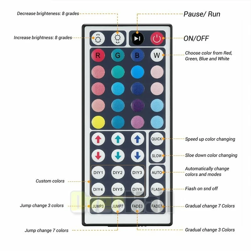 UPC: Does not apply Control Style: Remote Control Power Source: Wall Plug-In MPN: Does not apply Room: Bedroom, Dining Room, Living Room Features: Color Changing, RGB Light Color: RGB Lighting Technology: LED Size: 5M Energy Star: A+++ Voltage: 12 V Output Voltage: 12 V Sensor Type: Light gtin13: Does not apply IP Rating: IP65 Installation Area: Indoor Occasion: Christmas, Wedding Brand: Unbranded Type: Tape LED Chip Code: 5050