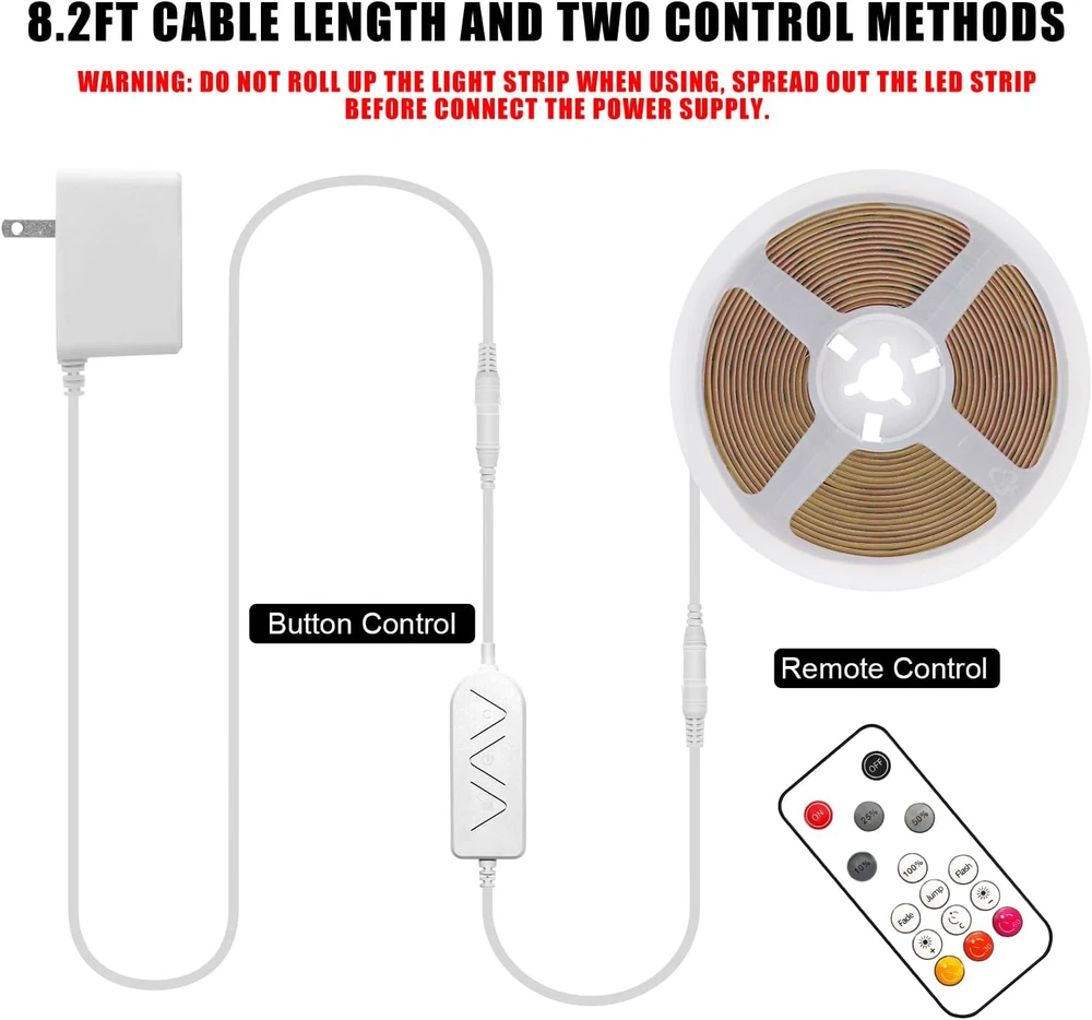 Store New Arrivals Add to Favorite View Feedback Contact White COB Led Strip Lights Max with RF Remote, 16.4Ft 3000K Dimmable Ultra Bright Warm White COB Light Strip, Adhesive Indoor COB Led Lights for Living Room, Shelf, Cabinet Description Light Source Type LED Item model number LSSCOBX38420W Style Traditional Number of Items 1 Power Source AC/DC Number of Light Sources 1920 Control Method Remote Warranty Description 3 years manufacturer. Product Dimensions 196.8 x 0.31 x 0.09 inches Theme Christmas day, Thanksgiving day, Party Batteries Included? No Usage Indoor use only Controller Type Remote Control, Button Control Connectivity Protocol Radio Frequency Wireless Communication Technology Radio Frequency Material vinyl, metal, ceramic, Silicone Seasons winter Form Factor Flexible strip Included Components User Manual, Dimmer, COB LED Strip Light, Remote, 24V/1A Power adapter (Not support battery powered) Item Package Quantity 1 Item dimensions L x W x H 196.8 x 0.31 x 0.09 inches White Brightness 3120 Lumens Indoor/Outdoor Usage Indoor Country of Origin China Light Color White Water Resistance Level Not Water Resistant Batteries Required? No Item Weight 1 pounds Connectivity Technology Radio Frequency Occasion Christmas day, Thanksgiving day, Party Special Features RF remote control, Timer setting, Scenes options, Powered on last setting, Dimmable 10-100% Special Feature RF remote control, Timer setting, Scenes options, Powered on last setting, Dimmable 10-100% Color Temperature 3000 Kelvin Color 3000K-Warm White Wattage 24 watts Voltage 24 Volts (DC) Plug Format US Luminous Flux 3120 Lumen Size 16.4ft Ultra Bright Uniform light: Special technology rises the lumens efficiency up to 130lm/w makes the brightness 24W=36W, the diodes cover yellow odorless and safe silicone material makes light strips more uniform and bright, not shine your eye Create Linear Effect:Came with 1920 pcs diodes/16.4ft light strip, no more light dark areas, not reflected off the dark tile or polished counter, great for cosplay effects and model makers Easy to DIY: Flexible and cuttable COB light strip with strong adhesive tape, and 8.2ft wire lead from power supply to light strip, makes easy to bend angle to install and decorate (Do not stick on frosted glass, dusty wall, rough plastic surface, wool fabrics) Dimmable: The COB rope light adjust 10-100% brightness makes room more Inviting Widely Used: The COB strip light is great ideal for vanity mirror, stair, bedroom, cabinet, kitchen counters, living room, display case Multiple Functions: Power on last setting, adjust brightness, timer setting, scenes options How to solve the light strip auto turn on or turn off: Pair the remote with controller, hold the 10% and 50% button at the same time for 3s, and then release the button, the light strip will flash, successful Product Description COB Led Strip Light Kit Tatazone Soft glow light for your room(Not support Battery Powered). Brightness of 24W=36W Energy Saving 130lm/w high lumen output illuminate your entire room, perfect for living room, bedroom, kitchen, cabinet, shelf, closet, desk, frame. Safe to use Operating on 24V Certified Power Supply Came with US safety standards and regulations power supply, comply with safe radiation standards. Set timer to turn off led cob strip automatically Pairing the Remote with Dimmer One remote to control all this tatazone COB led strip kit, or pairing remote for controlling one. 8.2ft Wire From Adapter to Led COB Strip Extended the cable length of dimmer makes your installation without limits, use button control easy. 1920 Led's Spread over the COB Light High density of led's covered silicone material makes the light soft and uniform. 1 Concern Safety 2 Timer 3 Pairing Mode 4 Ultra Long Wire 5 High Density Led Strip Know more about the RF remote · How to solve the light strip turn on randomly? Pair the remote to the dimmer, problem will solve. · Wireless control via RF remote, no needs to point at the controller when you control the COB light strip. · The RF signal can pass through obstacles compare to IR remote. · Multiple functions: timer setting, adjust brightness 10-100%, scenes option, pairing mode. · Sensing Distance: 49.2ft. Warning: DO NOT ROLL UP THE LIGHT STRIP WHEN USING, spread out the led strip before connect the power supply. If the light strip roll up when lighting up, the light strip unable to dissipate heat. How to make the adhesive tape more sticky? 1. Do not stick to dusty wall, rough plastic surface, frosted glass, knitted/wool fabrics. 2. Choose a dry,clean and smooth surface. 3. In low-temperature environments, please use a hair dryer to warm up the tape. Does the light strip could be memorized last setting after turned off the light? Yes, the cob led will remember your setting when COB led powered off. How to solve the light strip turn on and off randomly, or dimming on it's own, randomly flashing? The problem came with other remote control signal interference, hold the 10% and 50% button at the same time for 3s, and then release the button, the light will flash, the problem solved. Technical Data of COB Led Strip Voltage 24 Vdc Power Rated 24W Color Temperature 3000K-Warm White Led Quantity 384 LEDs/m-1920pcs/16.4ft Light Efficiency 3120lm/16.4ft-130 lm/w CRI >88+ SDCM ≤6 IP Level 50 Cutting Size 1.65in/42mm Length of Light Strip 1*16.4ft/5m Width 0.31in/8mm (Matching 8mm 2 PIN COB connector) Included 1 x 16.4ft/5m COB Strip Light 、1 x 24V Power Supply、1 x Dimmer 、1 x User Munual、RF Rmote Battery Powered Not Support Tatazone Led COB Strip Light Kit Add to Cart Add to Cart Add to Cart Add to Cart Add to Cart Add to Cart Customer Reviews 4.3 out of 5 stars 240 4.2 out of 5 stars 106 4.6 out of 5 stars 121 3.2 out of 5 stars 62 3.8 out of 5 stars 54 4.1 out of 5 stars 133 4.0 out of 5 stars 68 Price $47.99 $ 47 . 99 $33.99 $ 33 . 99 $25.99 $ 25 . 99 $45.99 $ 45 . 99 — $9.99 $ 9 . 99 $25.99 $ 25 . 99 Length 16.4ft 16.4ft 16.4ft 16.4ft 16.