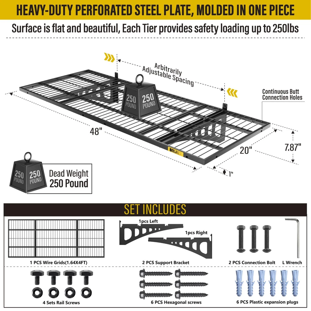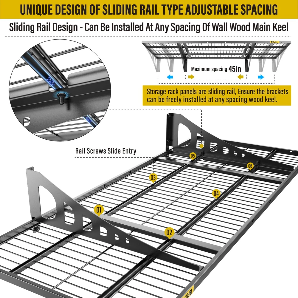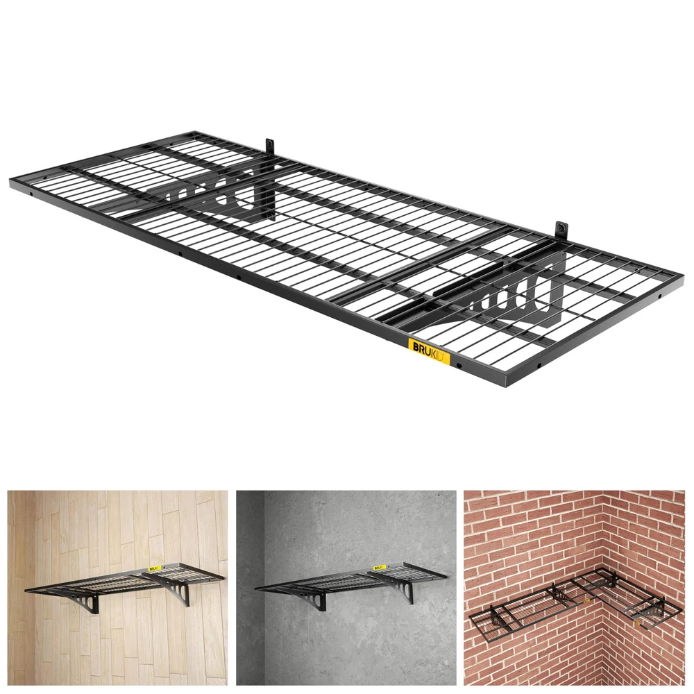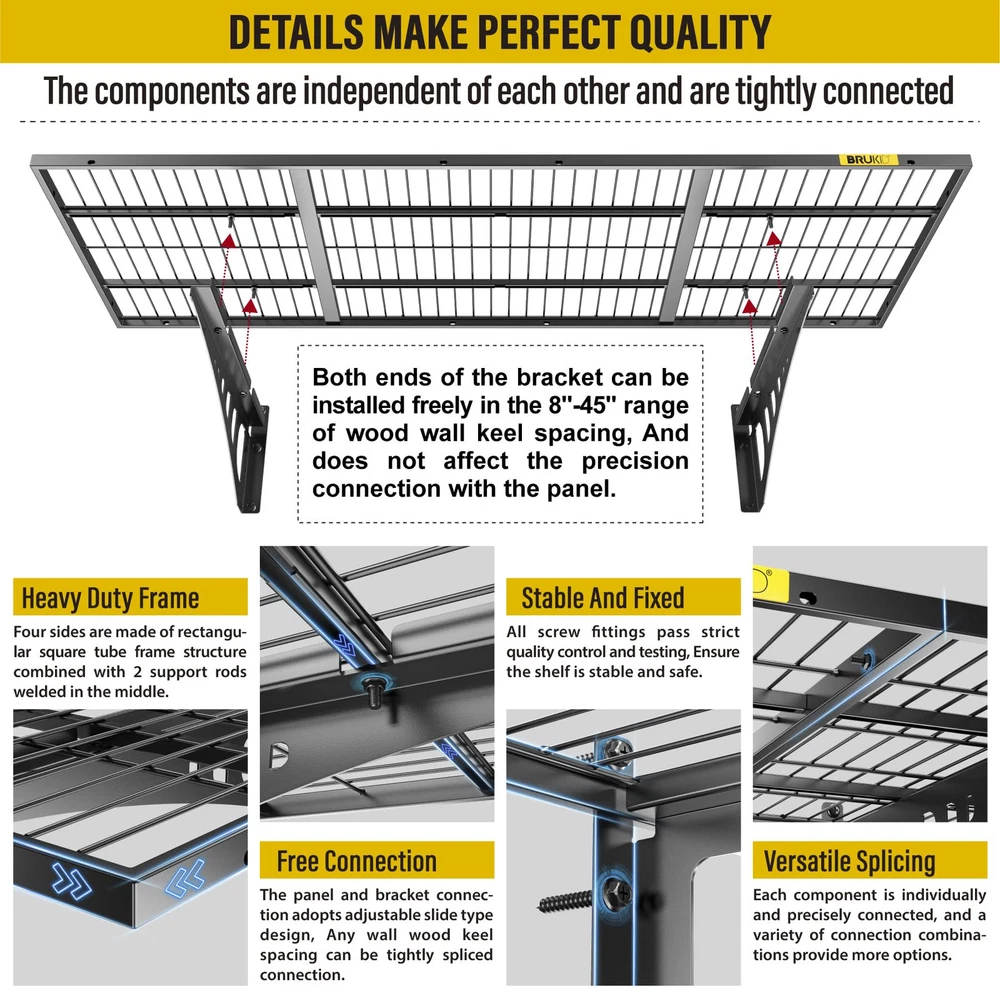 SUPERIOR DESIGN: Wall shelf garage storage rack is made of heavy-duty frame structure and thicker wire mesh combined with welding, the panel and bracket connection is adjustable slide rail design, Both ends of the bracket can be installed freely in the 8"-45" range of wood wall keel spacing. Eliminating the worry of not being able to connect due to the mismatch of the spacing of the load-bearing wooden wall keel. STABLE AND SAFE: The wall storage rack is reinforced and safely designed for each connecting pivot point, The four sides are made of rectangular square tube frame structure combined with 2 support rods welded in the middle, And the surface is made of professional matte fine-grained high-temperature powder baking varnish. And the single piece of safe load-bearing is up to 253 pounds. SIZE: L/48"*W/20"*H/7.87"; Bracket can be mounted on wood wall keel spacing range: 8"-45"; Safe load capacity: 252 lbs. DIY INSTALLATION: Pre-drilled holes are required for installation, The components are independent of each other; 1. Install the bracket parallel to the wood keel on the wall; 2. Shelves are placed on the bracket, and the 4 sliding screws are jammed into the shelves and connected to the bracket with the corresponding holes; 3. Adjust the distance between left and right side of the shelves and drill the nut into the sliding screws to tighten them. KIT INCLUDES:Includes 1pc-Grid Shelf; 2pc-Brackets; 6pc-Hexagonal screws (Hardened ∅0.2" L/2"); 4Sets-Rail attachment bolts; 1pc- Drill bit; 1pc-Socket; 1pc-installation manual. All hardware of Professional Series Wall Mounted Shelf are under strict quality control and testing, We strive to provide our customers with a quality shopping experience, If you have any questions, Please feel free to contact us.