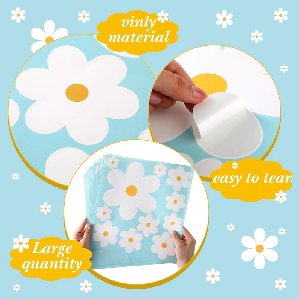 Package Details: each purchase comes with 15 sheets of daisy stickers and decals, including 165 pieces of decals; The abundant amount of decals makes it easy for customers to creatively decorate large wall spaces or just add a touch of freshness to several rooms; Each sheet of flower wall decor is about 11 x 11.8 inches/ 28 x 30 cm, so please confirm the size before purchasing Beautifully Colored Design: the color of floral wall decals peel and stick is as shown in the picture; A vibrant design that vividly brings out the enchanting look of the daisy; This attractive color scheme adds a fresh feeling to walls it is placed on, enriching the aesthetic aura of your home or office Durable Vinyl Material: the flower wall decals are made of durable vinyl material, providing an exquisite appearance that is safe, clean; This material makes them have clear printing and not easy to fade to stand the test of time; Customers will appreciate the durability and long lasting nature of these decals Fresh and Versatile: with their exquisite and fresh appearance, these daisy wall decals for bedroom can be applied to various kinds of places including living rooms, offices, kitchens, bedrooms, porch, balcony, classroom, window, door or bathrooms and more, adding a distinctly elegant and refreshed feel Easy Application: the nursery wall decals are easy to stick, making them a convenient decoration option; This point of convenience will certainly meet the needs of customers looking for a simple yet impactful decoration option Product Description