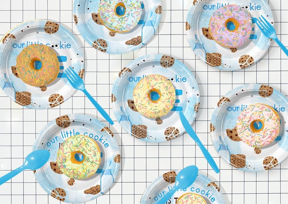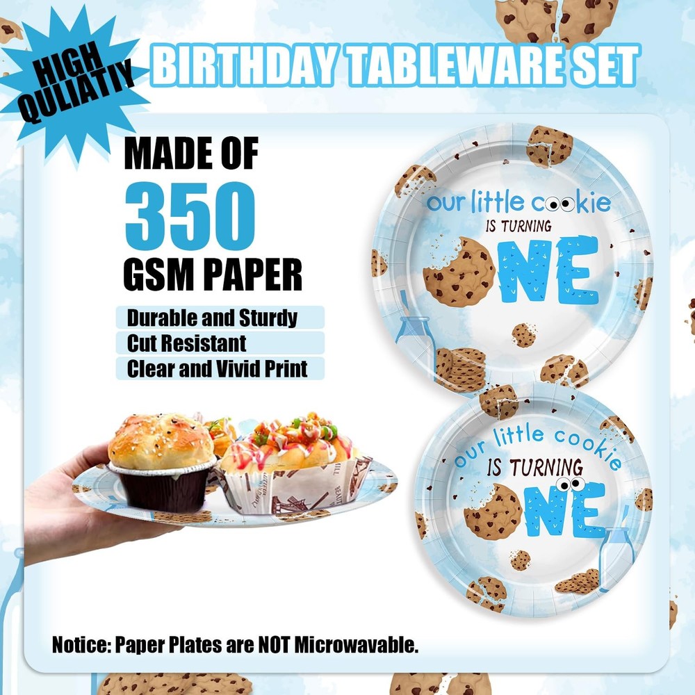 This milk and cookies tableware set includes:24 Pcs 9 inch paper plates and 24 Pcs 7 inch paper plates, 24 Pcs 6.5 inch napkins, 24 Pcs paper cups, 24 Pcs spoons, 24 Pcs knives and 24 Pcs forks. There are a total of 96 pieces in this set, which will add fun to any milk and cookies theme birthday party. Serve 24 Guests:This Milk and Cookies party kit has all you need for 24 guests, include 24 Pcs 9 inch paper plates and 24 Pcs 7 inch paper plates, 24 Pcs 6.5 inch napkins, 24 Pcs paper cups, 24 Pcs spoons, 24 Pcs knives and 24 Pcs forks, totally 168Pcs. They will offer complete set and sufficient quantity for you to treat 24 guests Superior materialsl: Our milk and cookie birthday party plates and napkins are made of high-quality paper, with bright colors that are not easily faded, torn, or broken. Non toxic, odorless, heat-resistant, and safe for food. To provide you with a pleasant user experience, allowing you to use with peace of mind Cute and Bright Design:Milk and Biscuit Party Set, featuring a bunch of chocolate cookies and milk drink elements. The fun and cute design also adds joy and happiness to your party, making your party experience the best value Wide Applications:Our milk and cookie birthday party supplies are suitable for various occasions, such as children's birthday parties, first birthdays, baby showers, and even casual gatherings. It effortlessly complements various themes and decorative styles, adding a touch of fun and surprise to any celebration event Easy to Clean:The milk and cookies birthday party decorations can reduce your cleaning time, so you can spend more time with friends and family at this milk and cookie party. After the party, put away the tablecloth and all the garbage and throw them into the trash can. Quick and efficient cleaning!