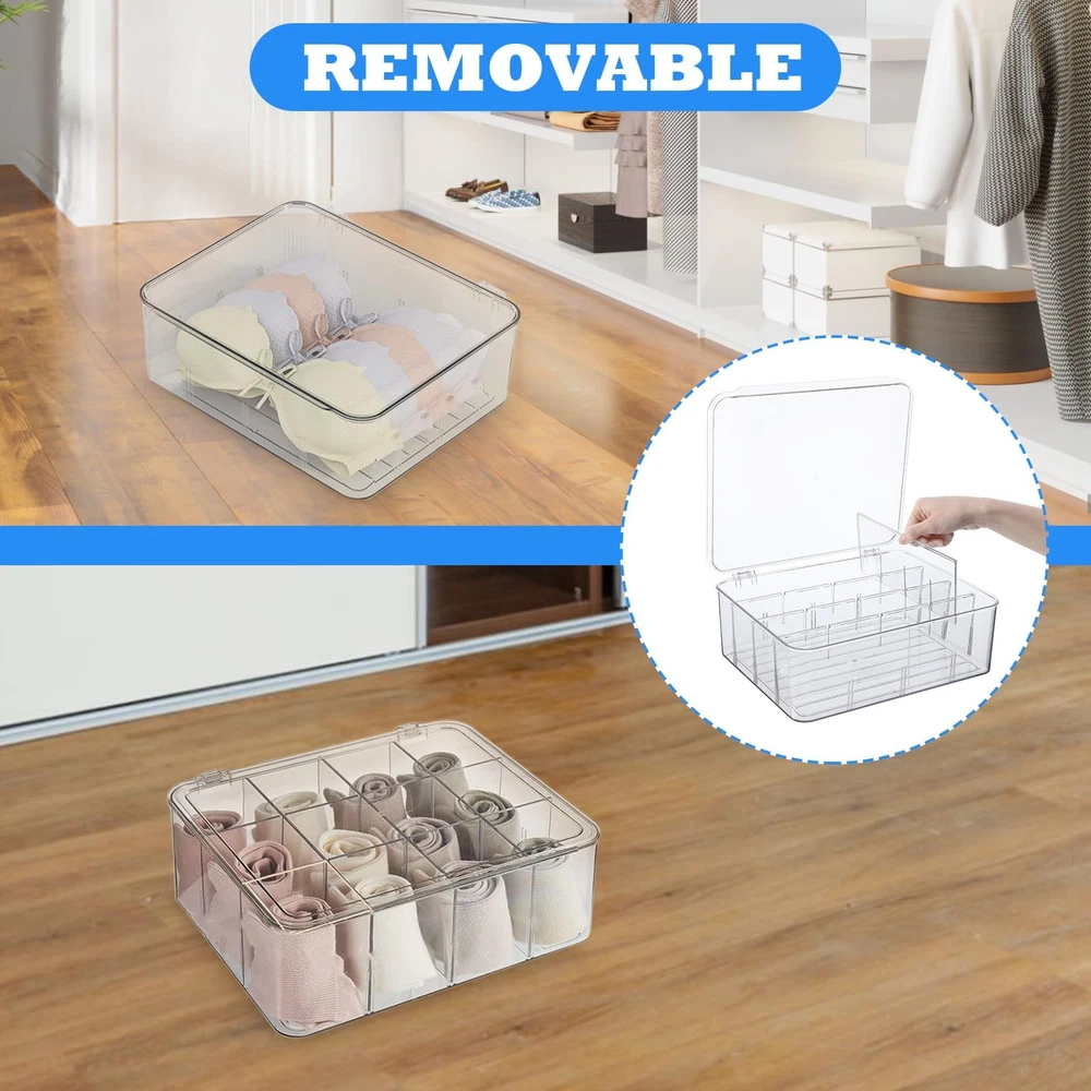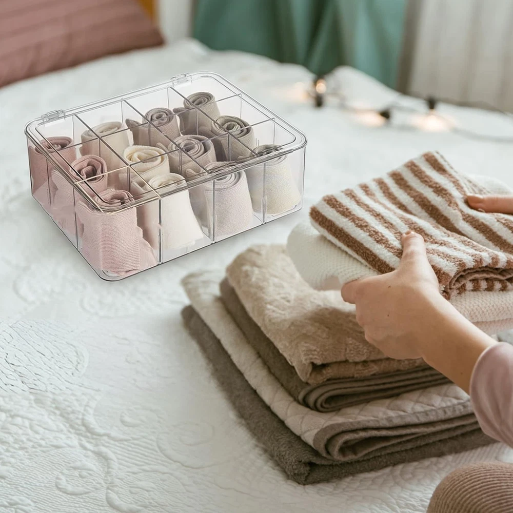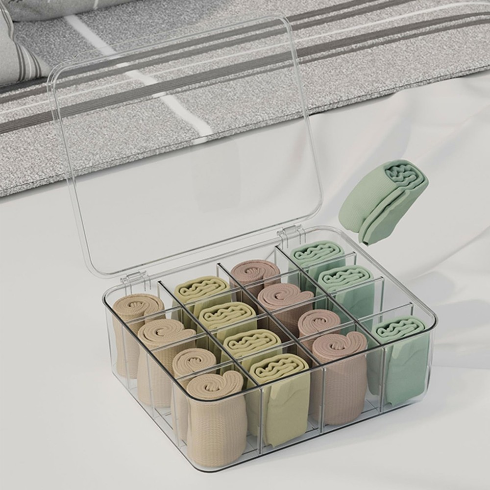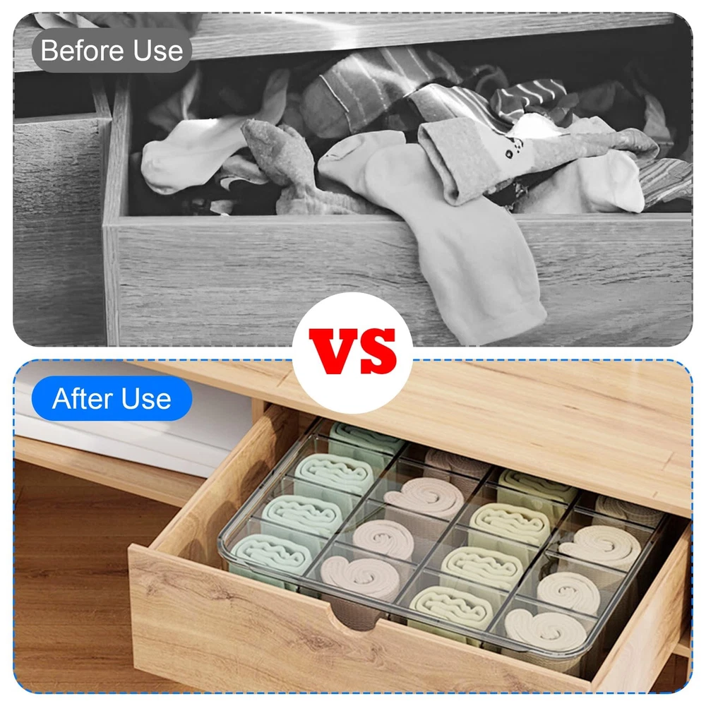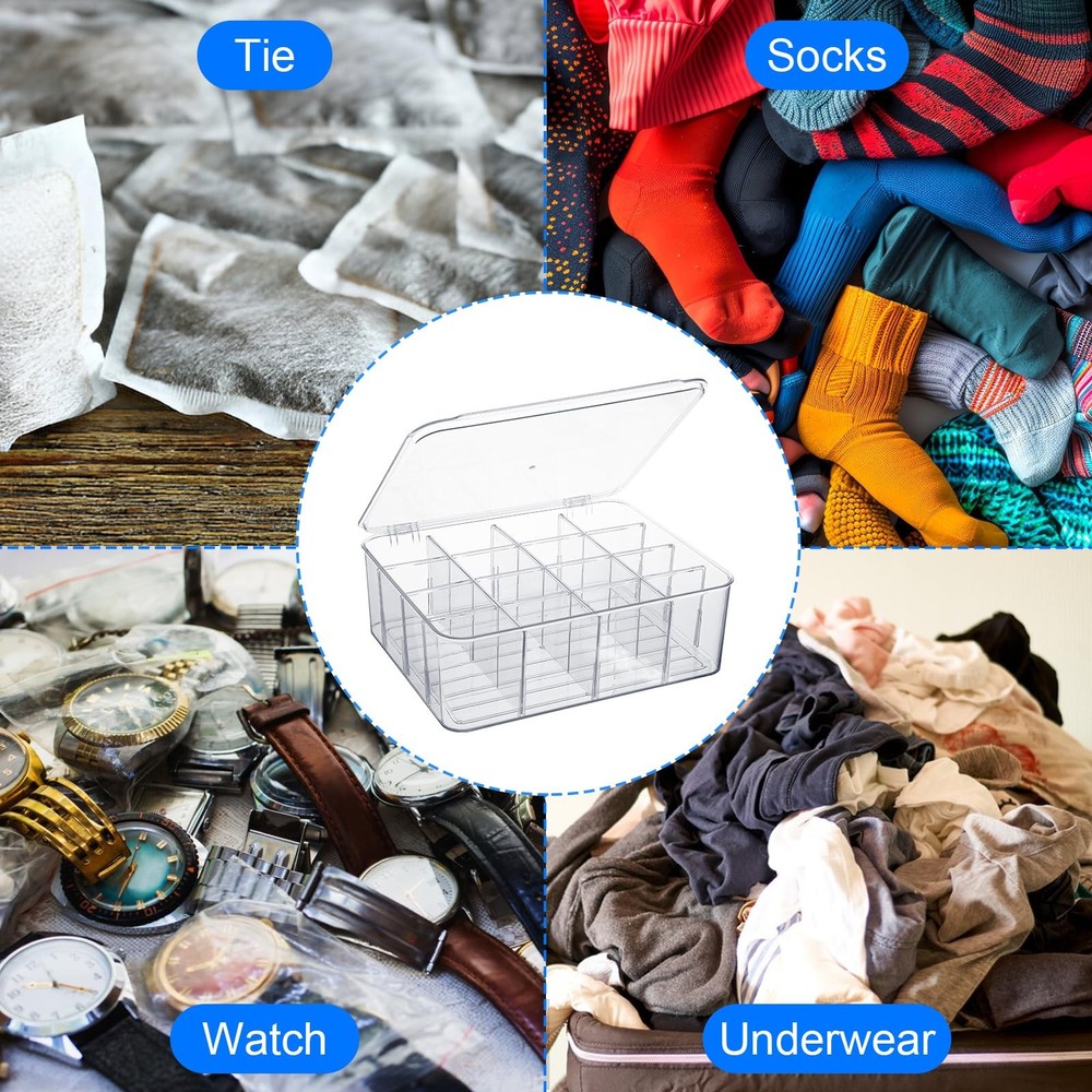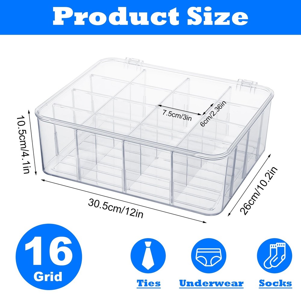 Sock Underwear Drawer Organizer Dividers, 16 Cell Plastic Storage with Lid Bin Clear Removable Storage Boxes Dresser Drawer Organizers for Makeup Jewelry Underwear Socks Features: Lightweight and portable Detachable Durable Description: Category: Storage box Color: Transparent Material: Plastic Function: Storage socks, storage ties, removable Product size: 12 × 10.2 × 4.1 inches/30.5 × 26 × 10.5 cm Packing method: Bag Packing list: 1pcs × Storage box 【Premium Quality】lidded storage box is made of plastic material, drawer divider with a transparent design for clear vision, sturdy and durable, acrylic drawer organizer meeting all your storage needs and bringing you a perfect use experience. 【Removable Design】Our socks organizer is designed with detachable design based on engineering principles, underwear organizer for drawer 6 partitions can be freely disassembled and assembled, and customized compartments can be used to place your items. 【Organization】The storage bin has large space, light weight, space saving, and desk organizer makes full use of effective space, drawer organizer can keep your items neat and clean, and makeup organizer can be easily disassembled for storage. 【You Will Get】The plastic drawer organizers consists of 1pcs socks and underwear storage box, with novel style and unique shape, kitchen organizers and storage enough for your daily replacement or use, you can also share organizer bins with your family or friends. 【Wide Range of Applications】The underwear organizer is suitable for most scenarios, such as home, travel, camping, etc. The cabinet organizer is small and easy to carry, vanity organizer can be carried with you, and bathroom drawer organizer can be taken out and used at any time.